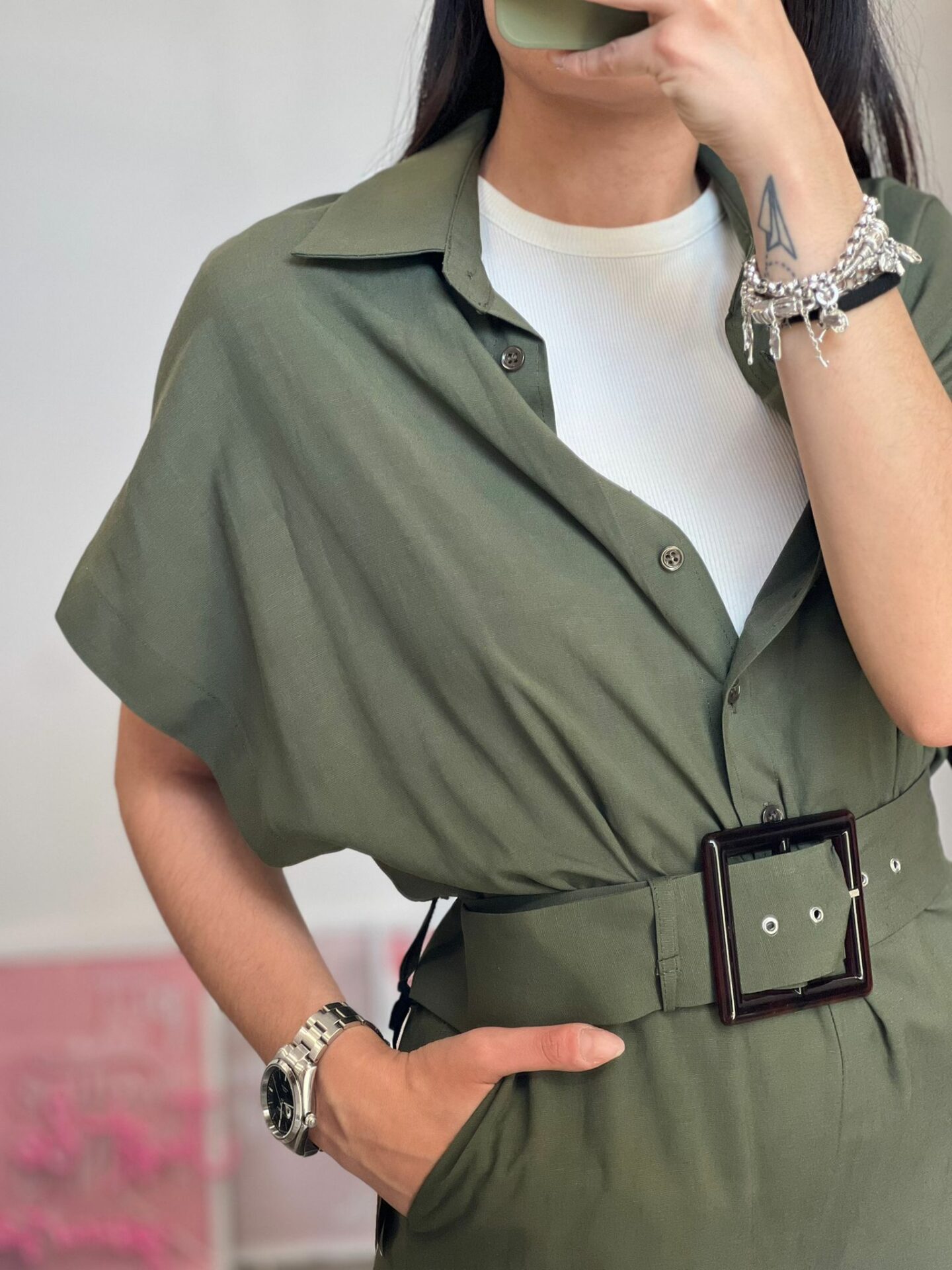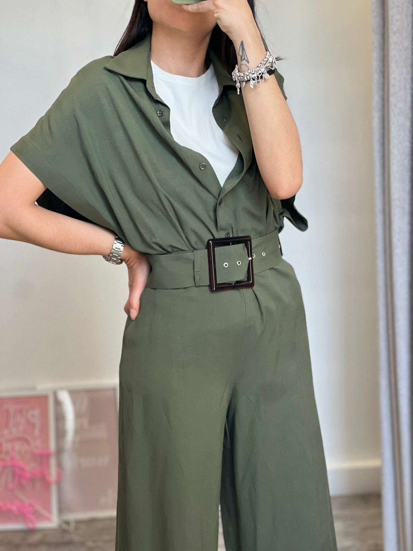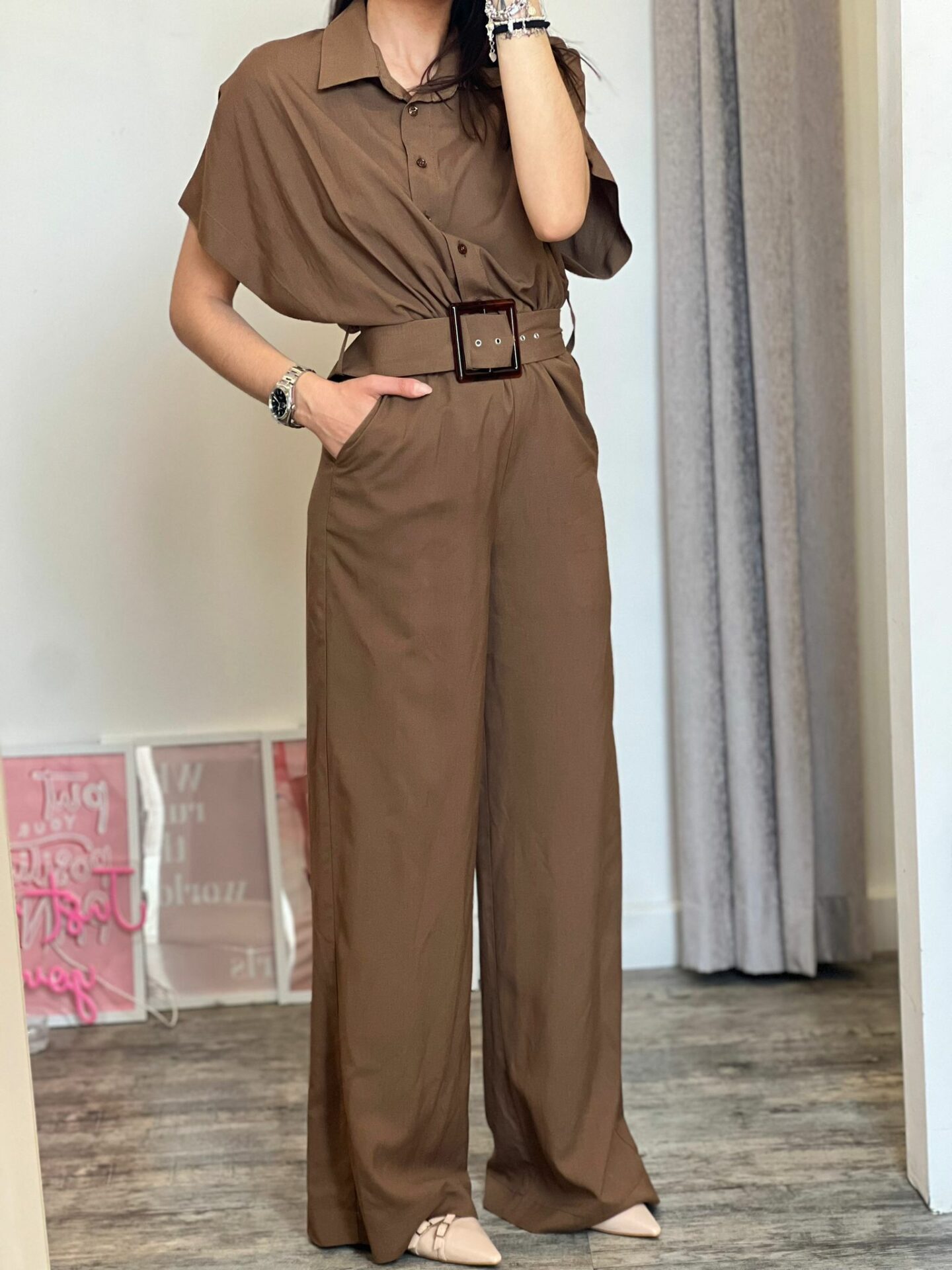Maxi tuta misto lino con manica a farfalla calata, cintura in tono su tono removibile, panta palazzo dritto, zip e bottoncini a clip laterali a chiusura