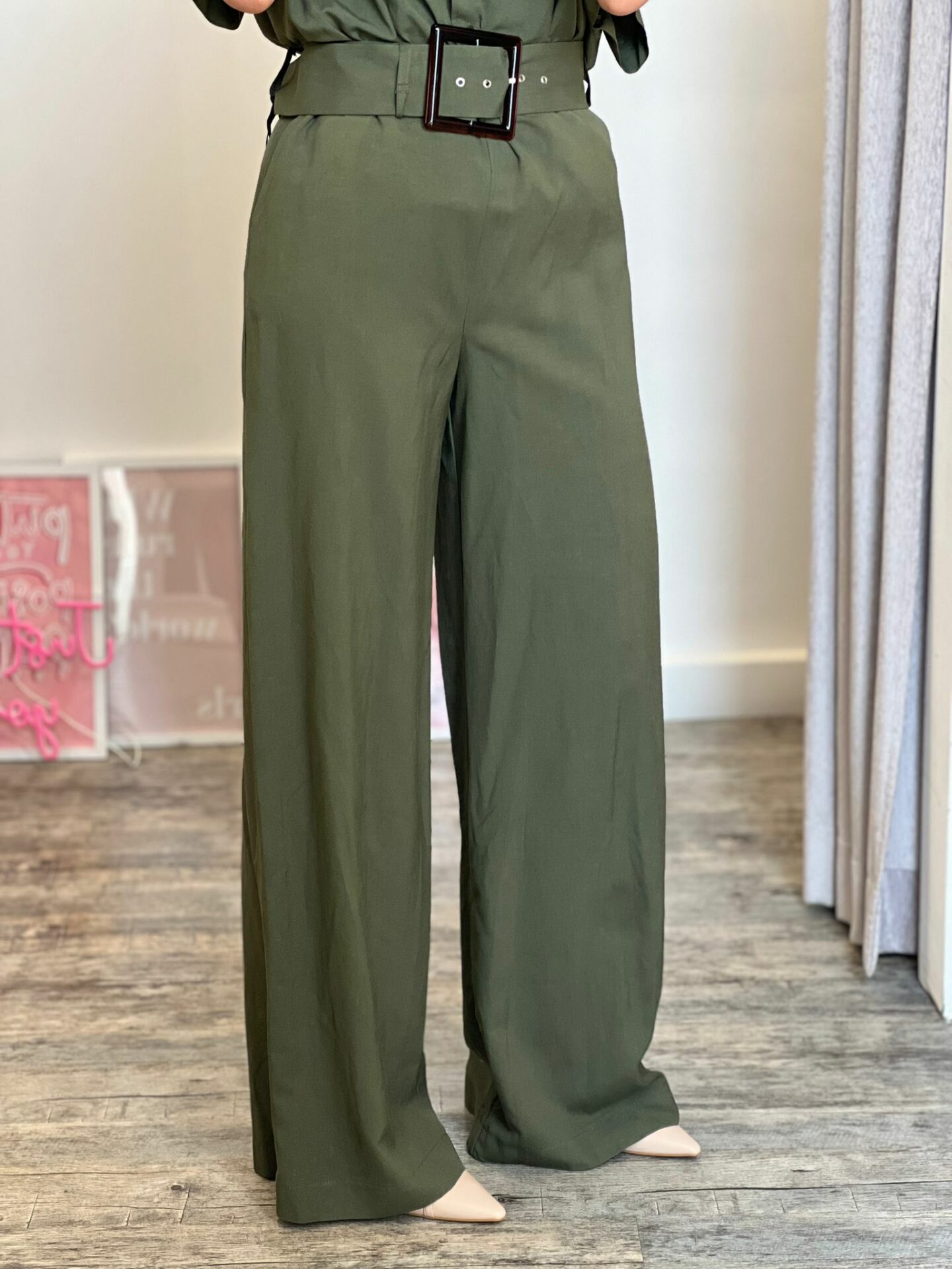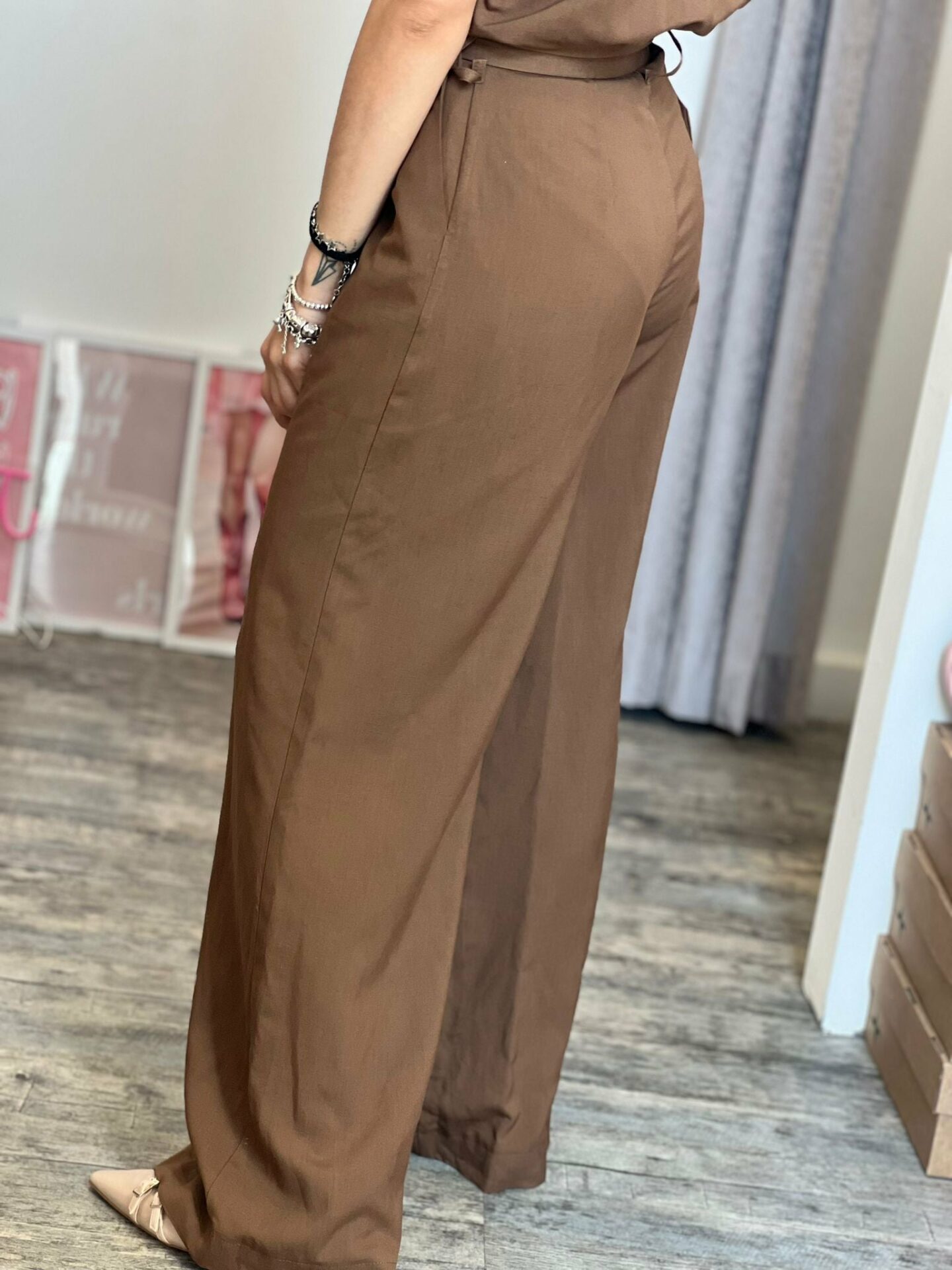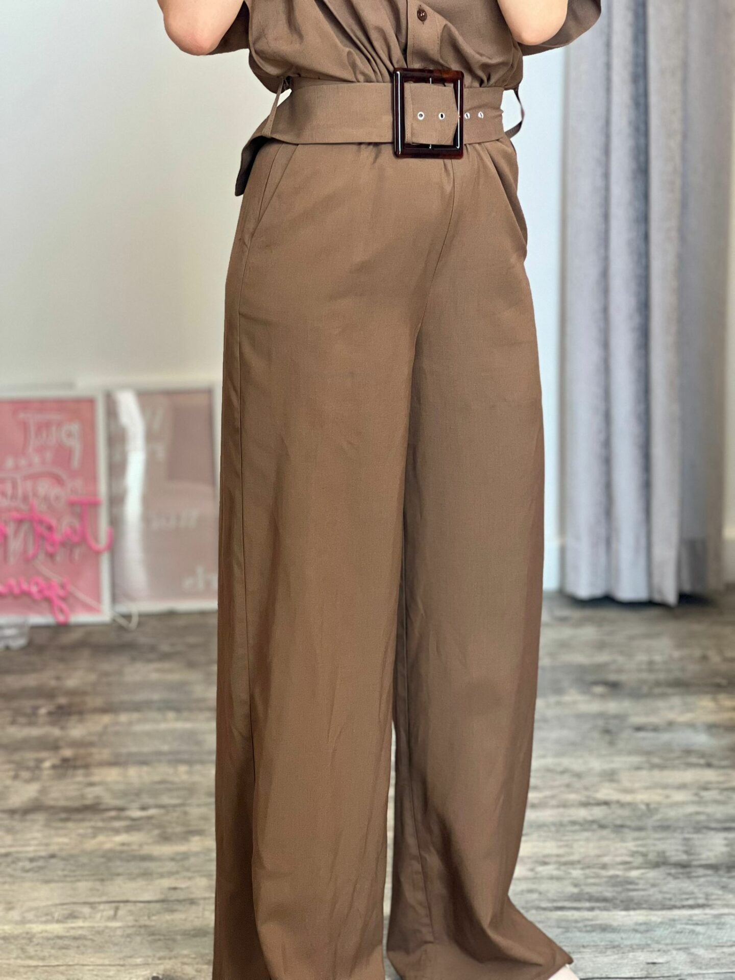 Maxi tuta misto lino con manica a farfalla calata, cintura in tono su tono removibile, panta palazzo dritto, zip e bottoncini a clip laterali a chiusura