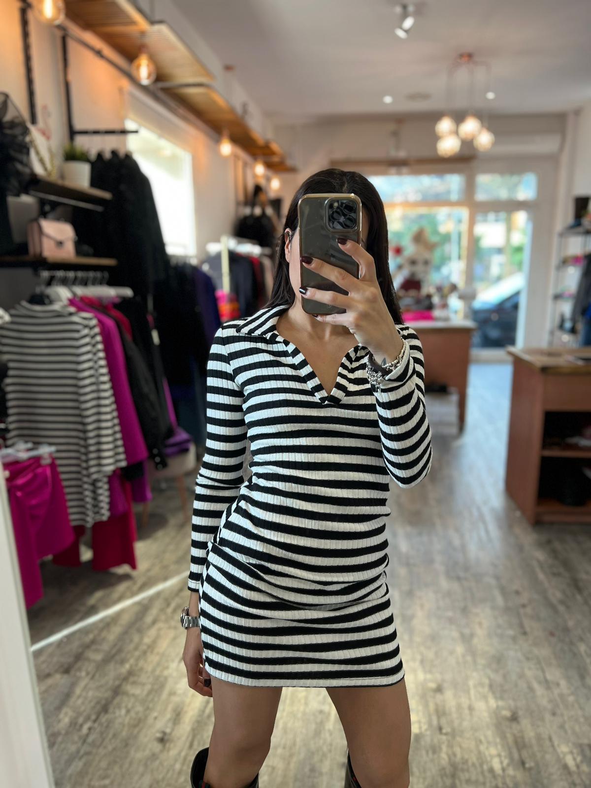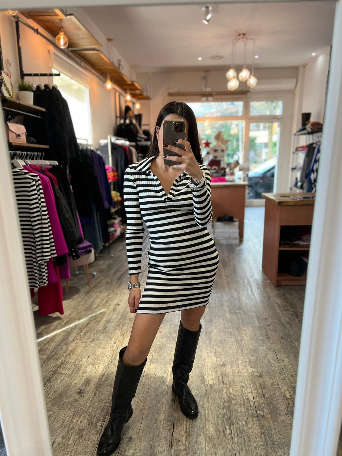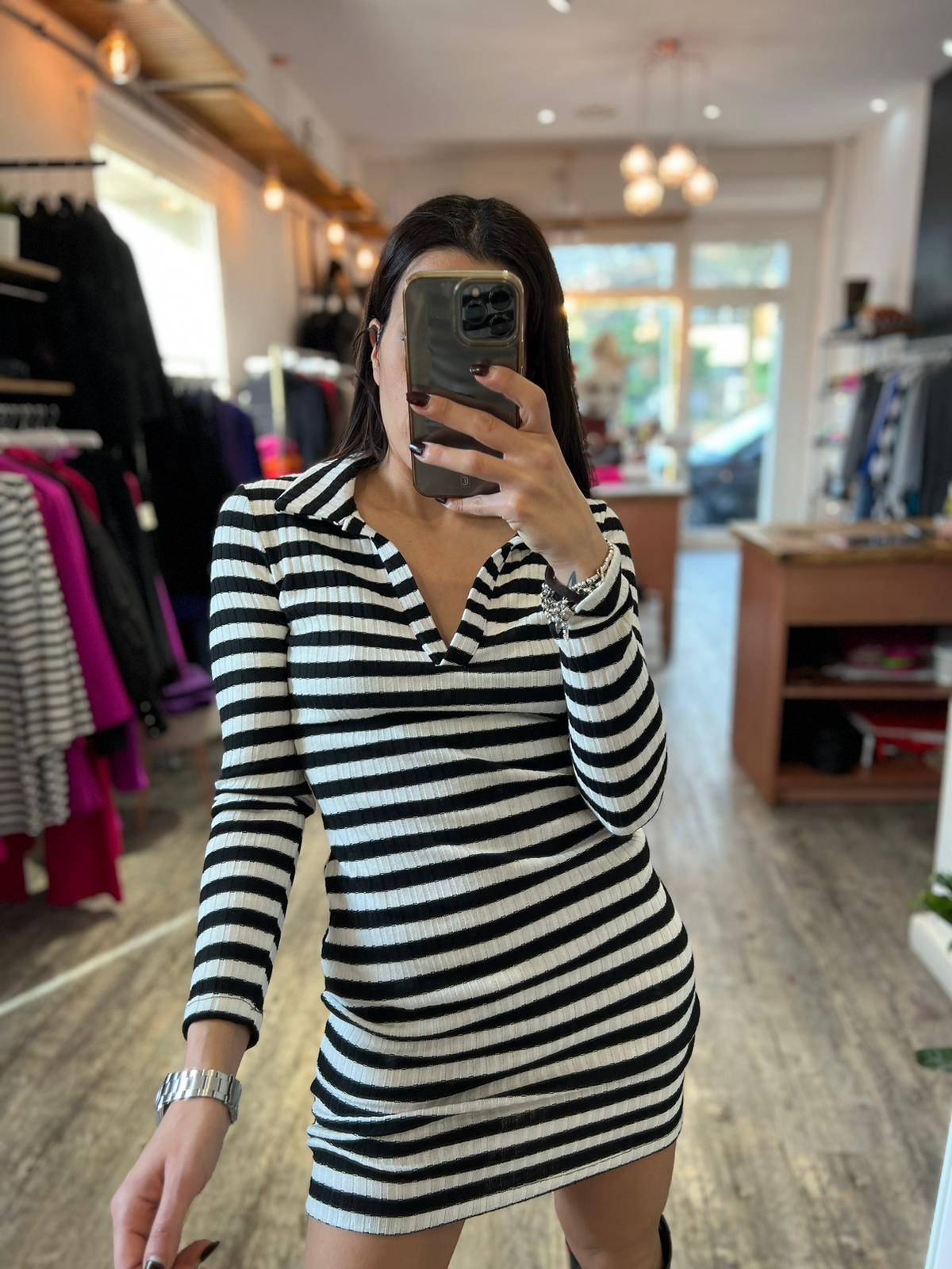 Mini abito in maglia con scollo a V e colletto, trama a righe orizzontali