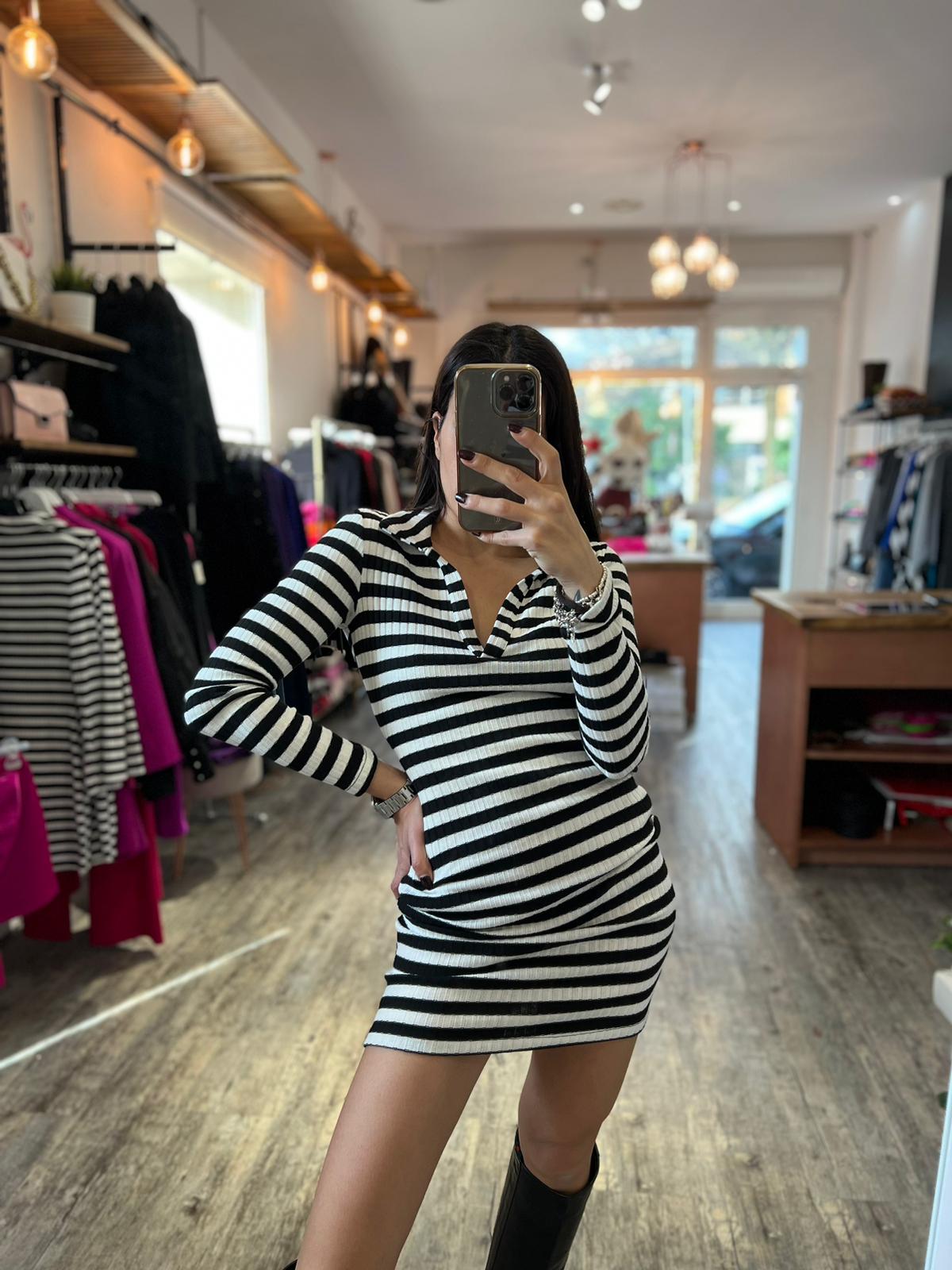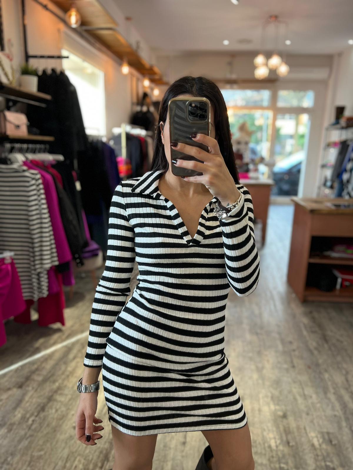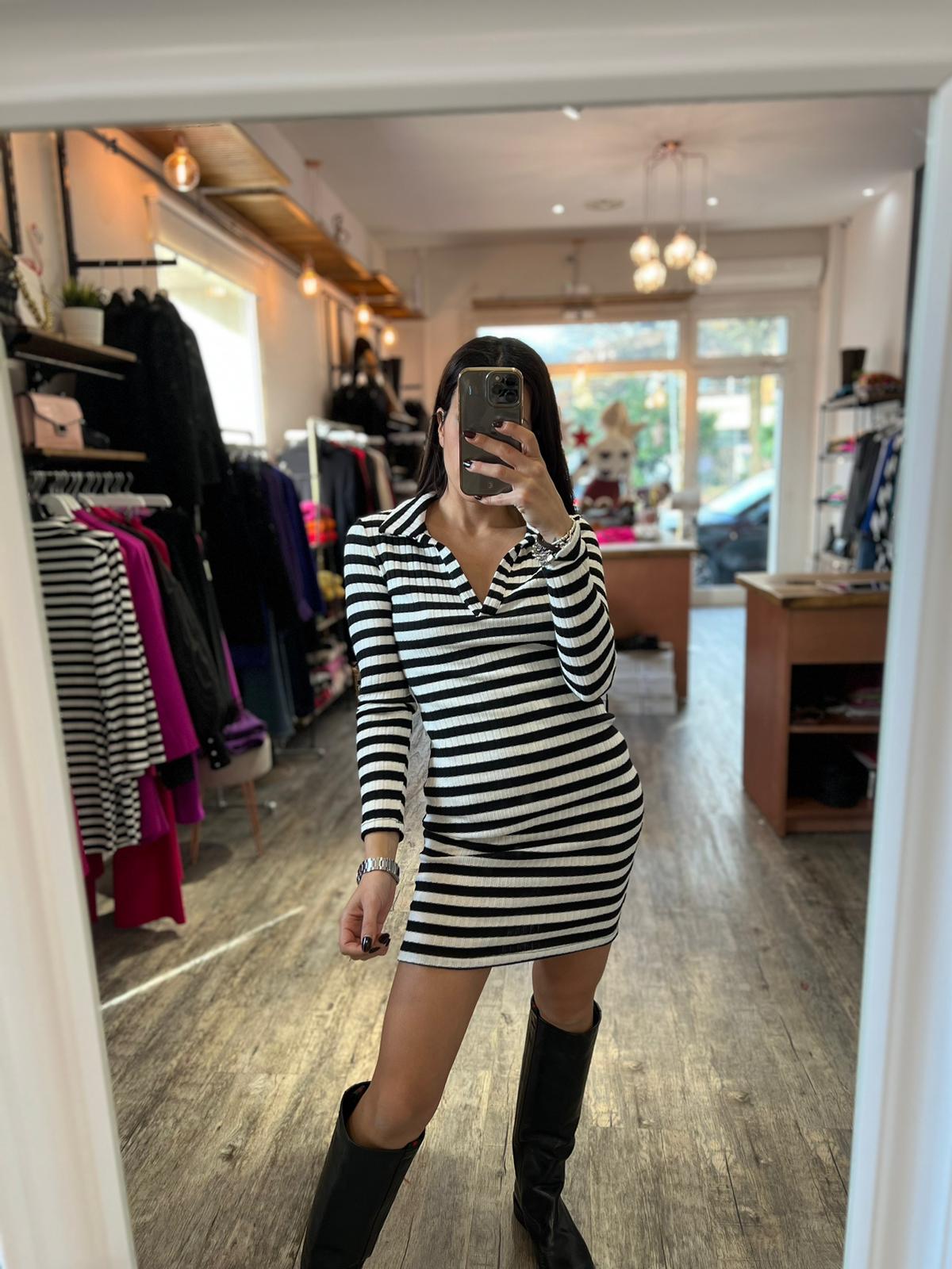Mini abito in maglia con scollo a V e colletto, trama a righe orizzontali