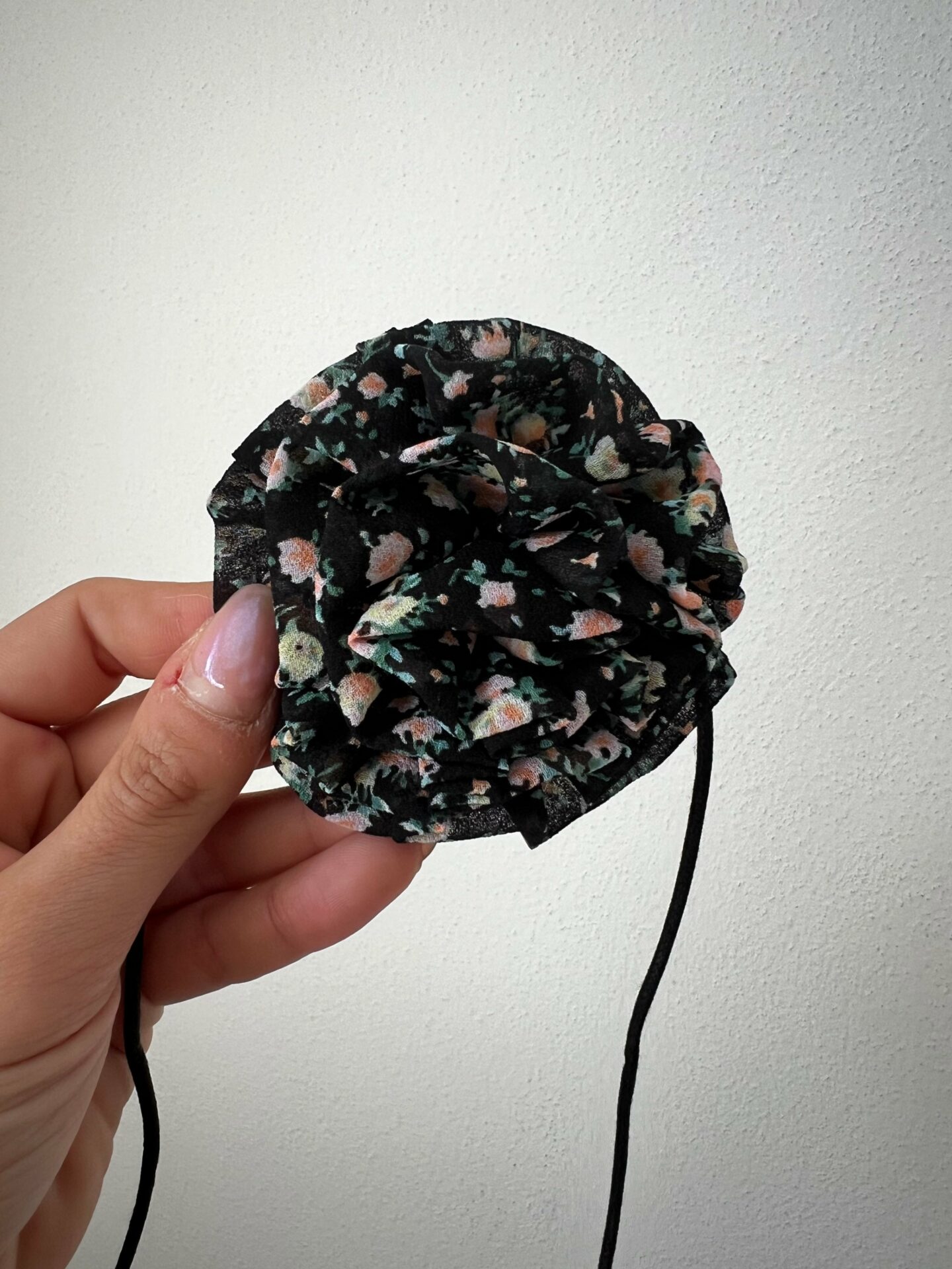 Mini abito in stampa provenzale con rouches sparse strutturato a balze, volant sullo scollo, spalline sottili regolabili a incrocio sulla schiena, chcocker incluso a forma di rosa in tessuto su tessuto e tono su tono