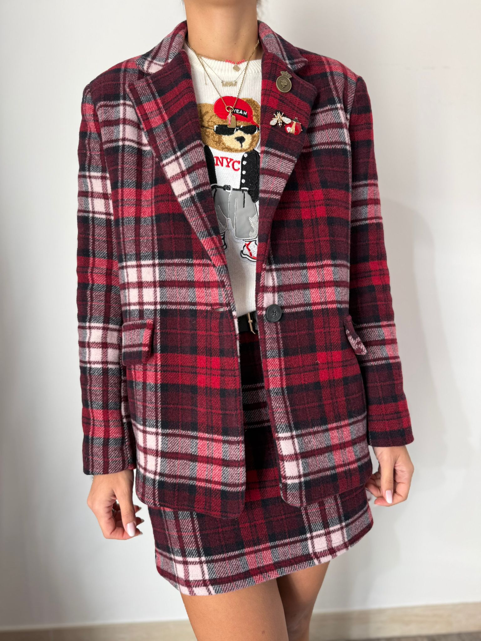 Minigonna in flanella misto lana con passanti e cinta, chiusura sul retro con zip