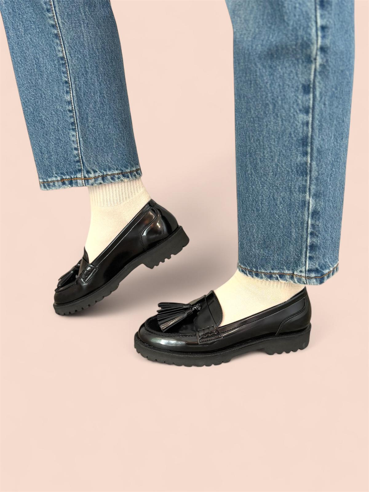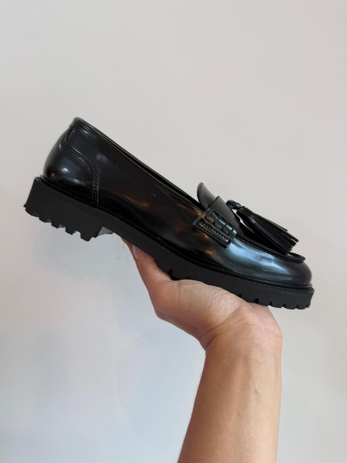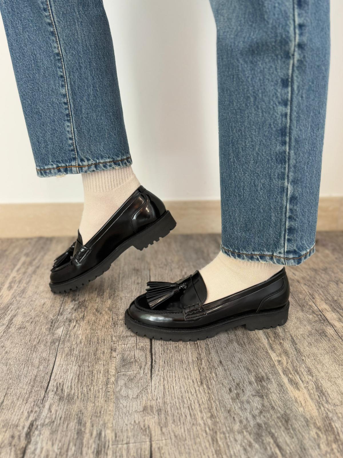 Mocassino nero abrasivato in pelle sintetica effetto lucido con applicazione nappa centrale e suola leggermente strutturata, tacco 3 cm