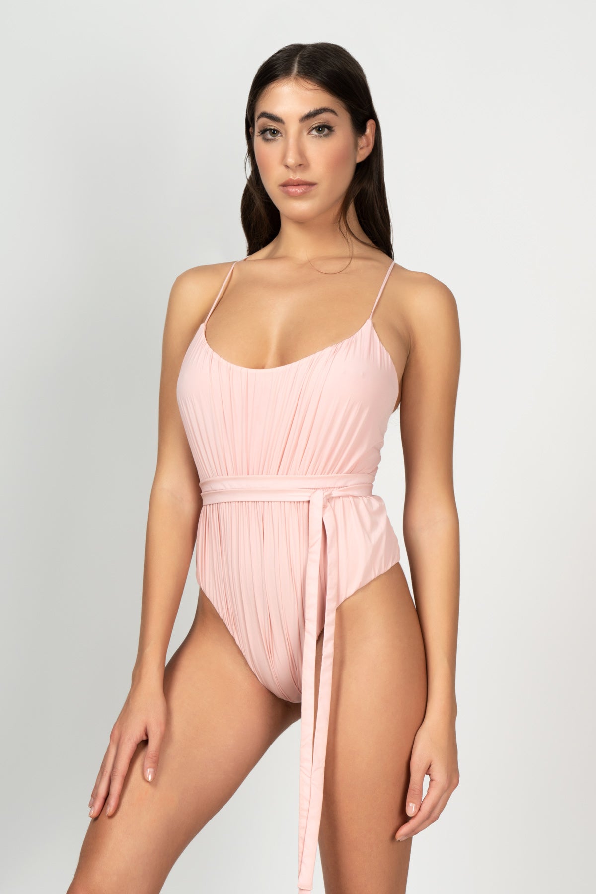 Costume da bagno, collezione SS22 del Mood Hollywood. Monokini Donna, con schiena scoperta e stringato sul retro, in tessuto Lycra drappeggiato rosa. Capo dotato di cinturino removibile.