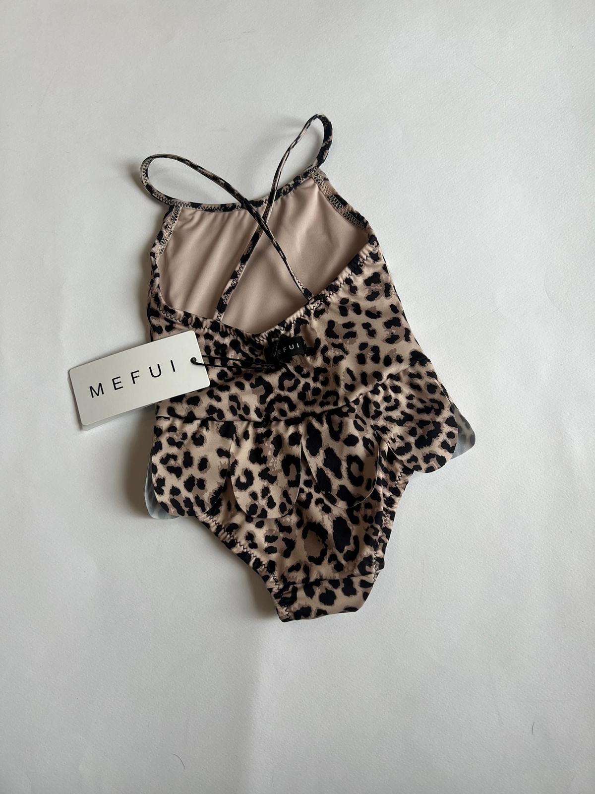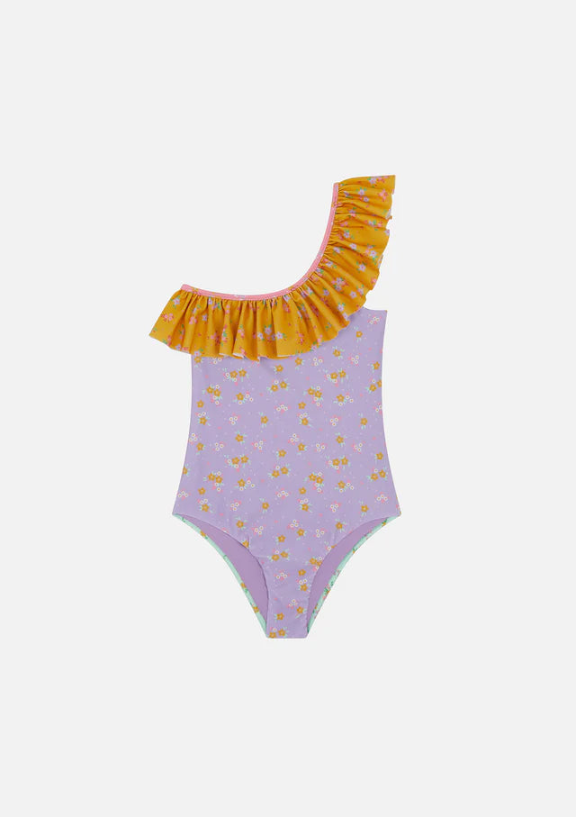 Monokini in tessuto lycra lucida a fantasia, con dettaglio volant.