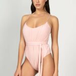 Monokini in tessuto lycra lucida a fantasia, con dettaglio volant.