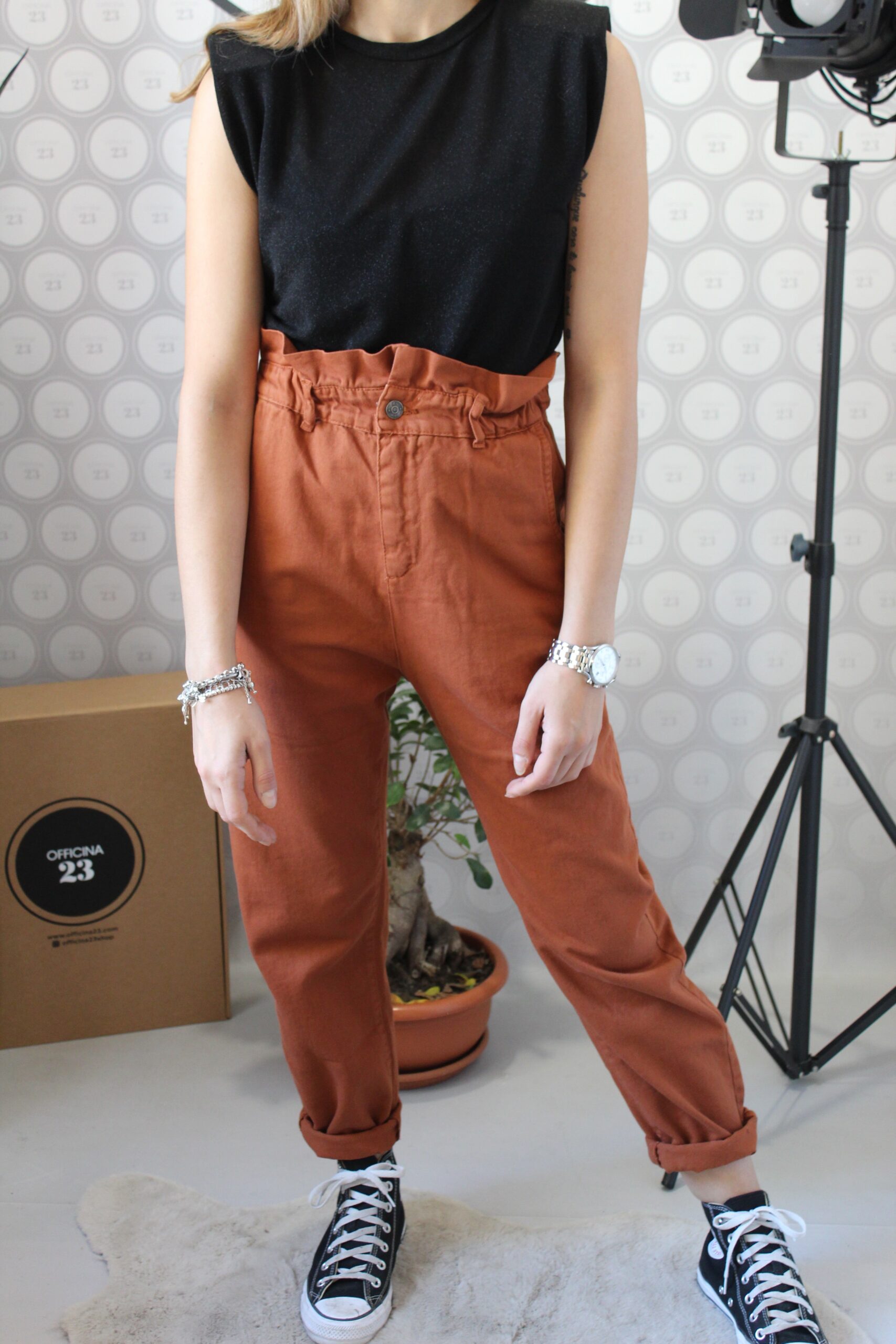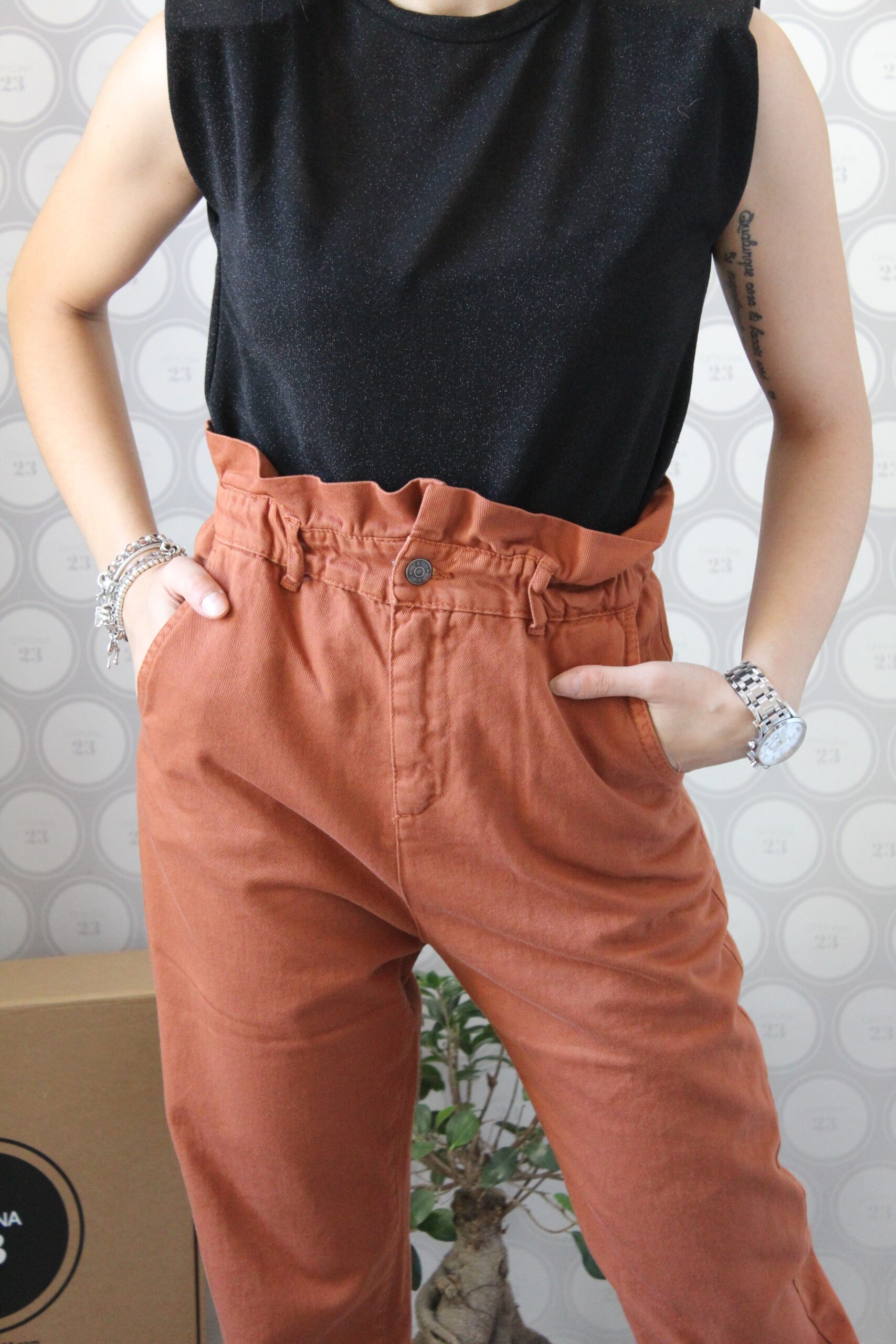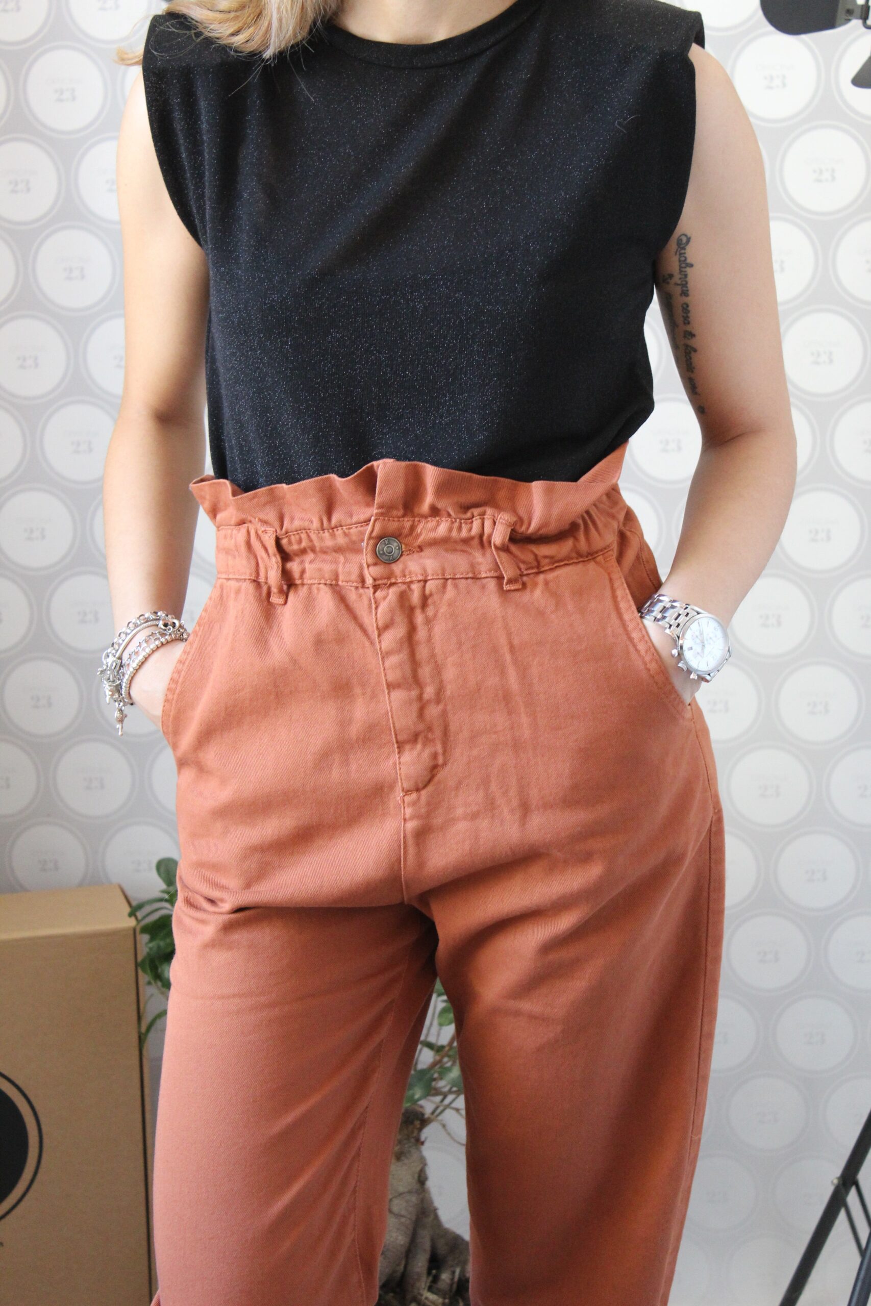 Pantalone in tessuto 100% cotone simil denim con taglio a caramella (vita alta arricciata), gamba morbida che scende giù dritta