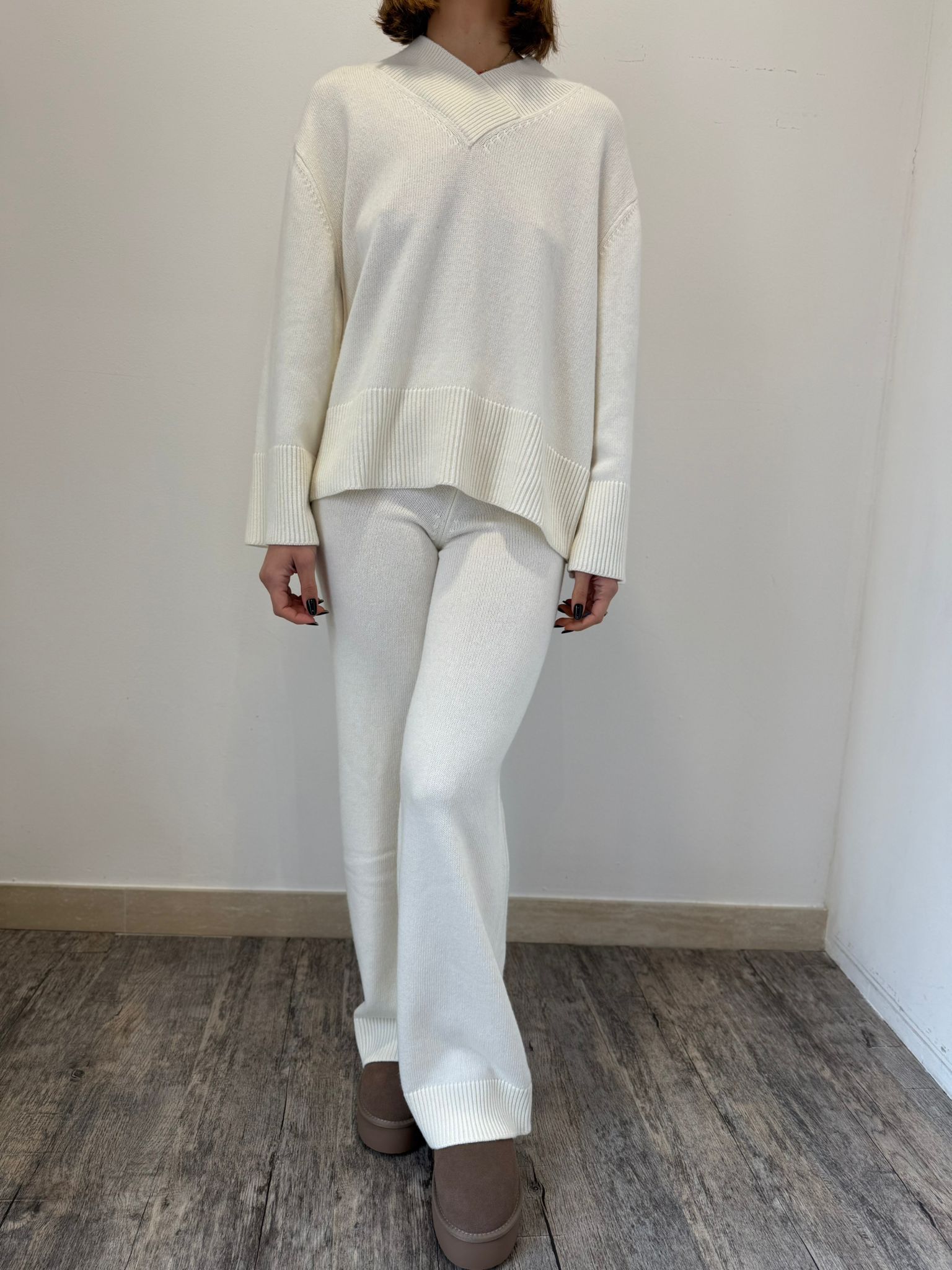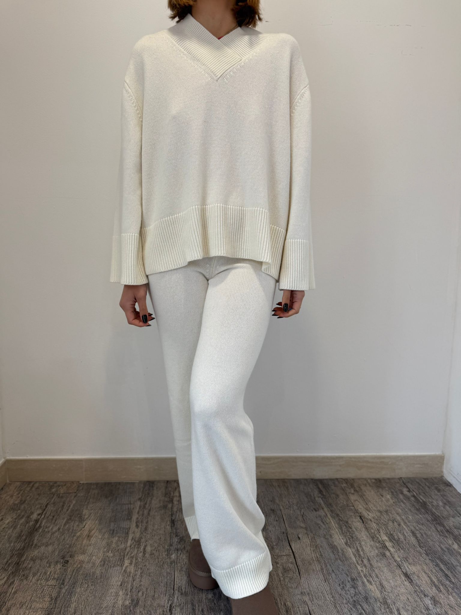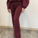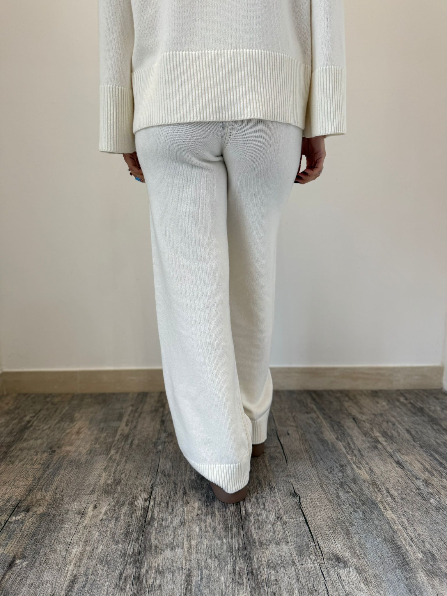Pantalone ampio a palazzo, in maglia, con vita elasticizzata. Dettaglio rifiniture in maglia a coste.