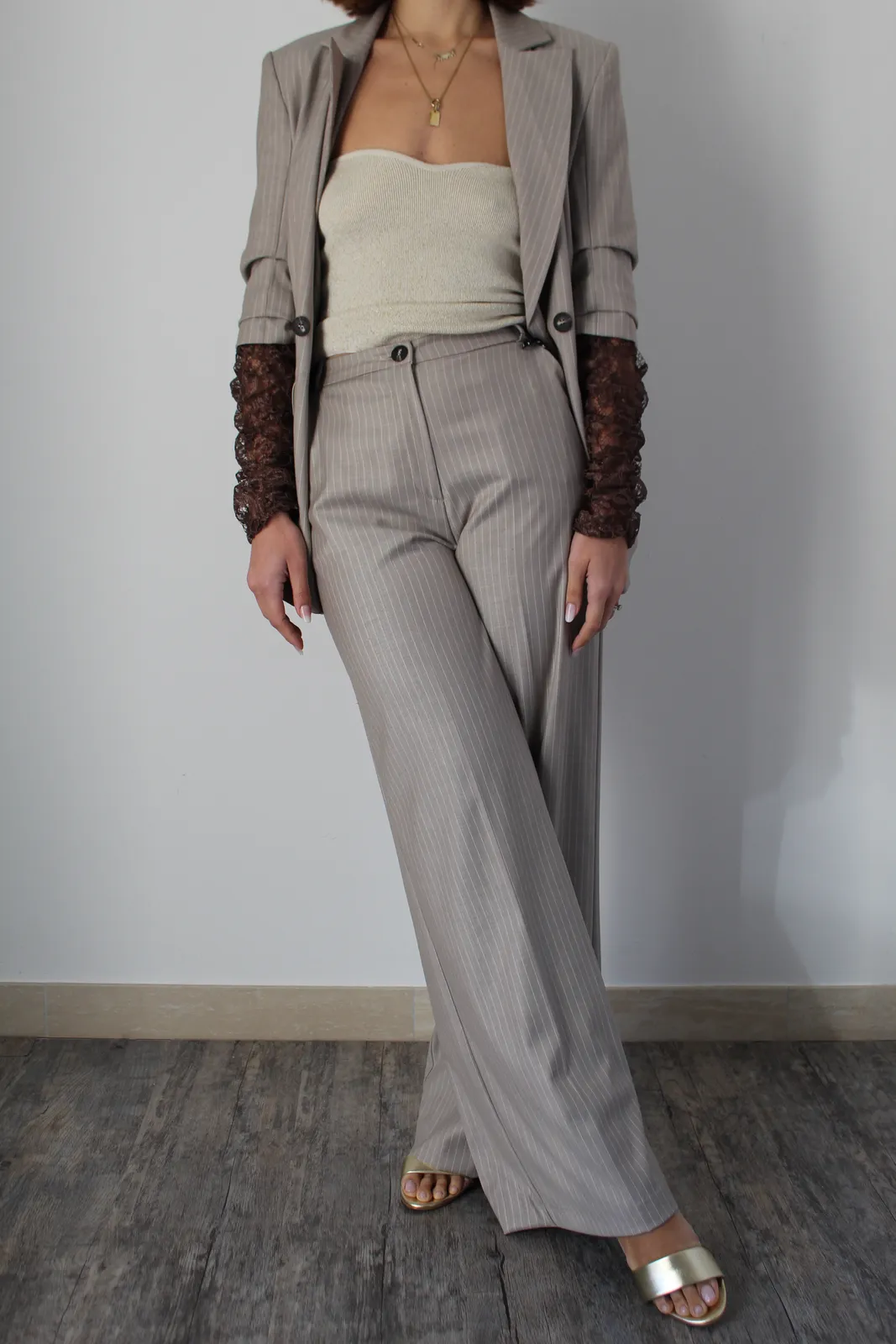 Pantalone palazzo beige gessato, vita alta, classica chiusura su patta, doppia tasca filetto, vita alta
