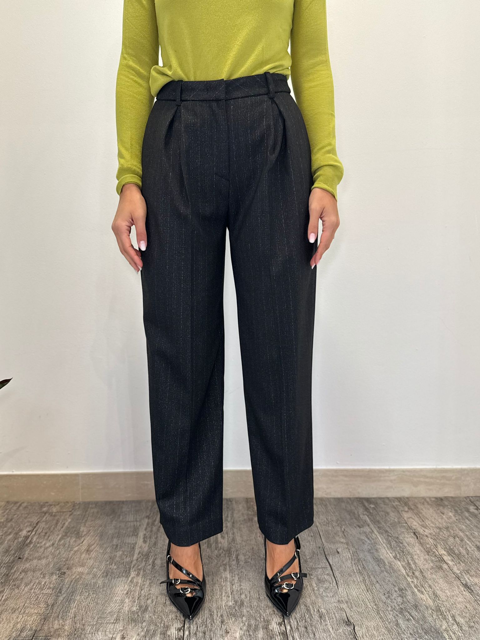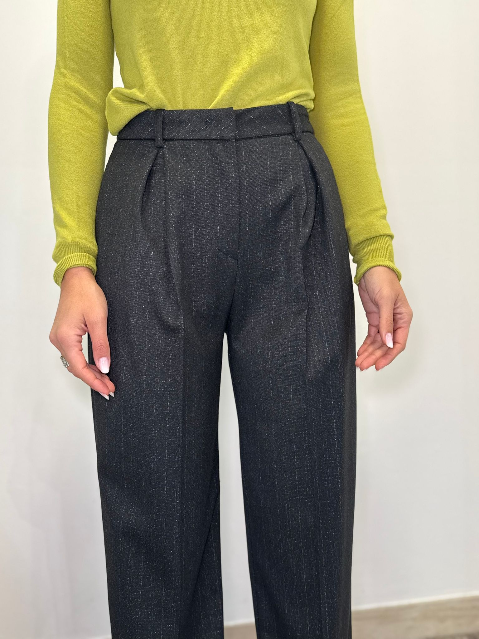 Pantalone vita regular baggy fit con pinces, doppia tasca filetto, dettaglio filo lurex gessato silver