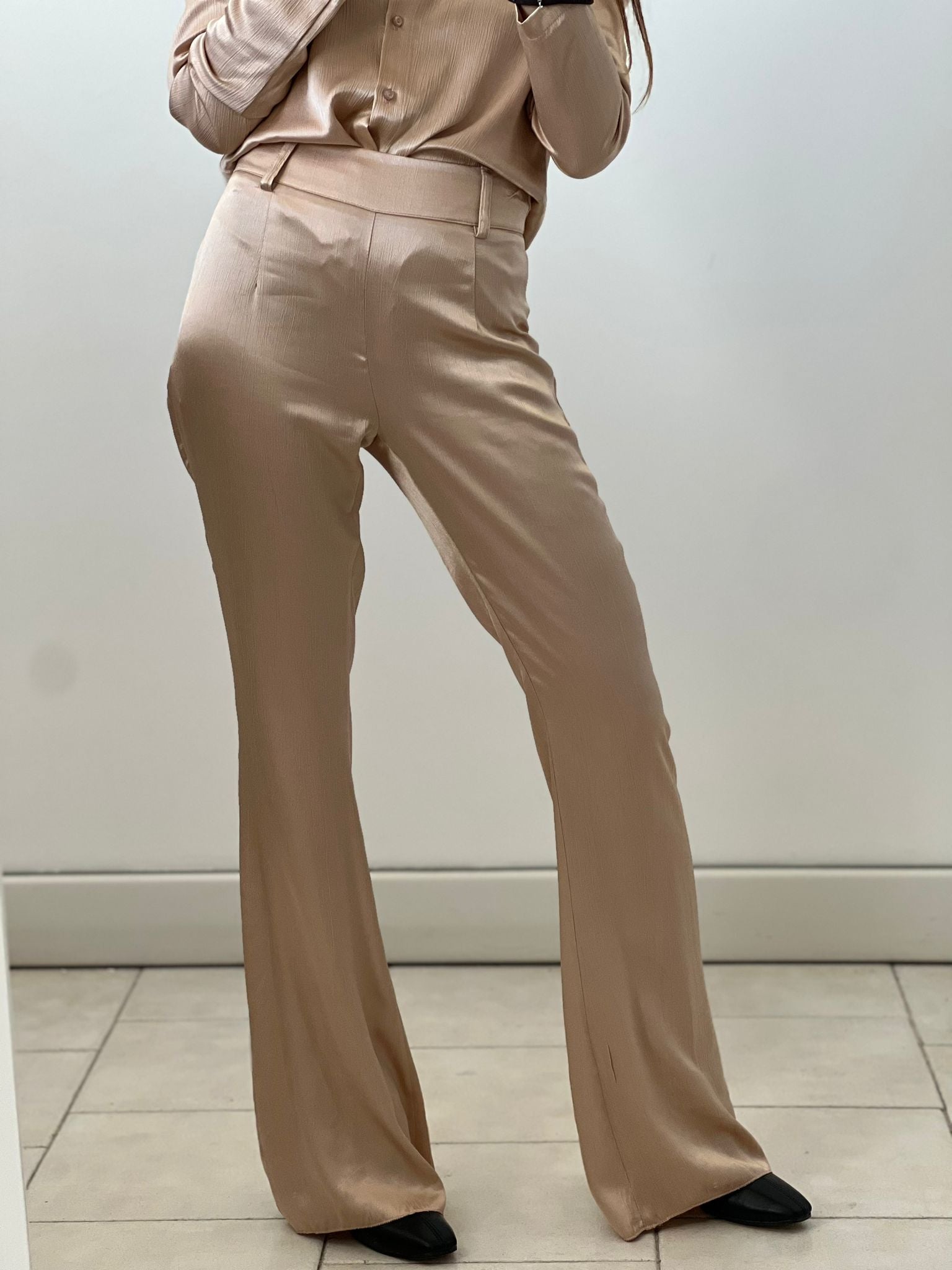 Pantalone a zampa in simil seta increspata, vita alta con chiusura sul retro a zip, veste un pochino di più, in foto si indossa taglia XS