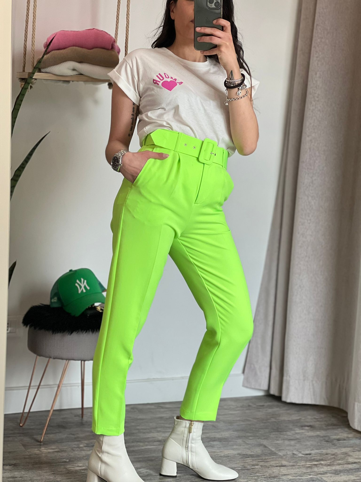 Pantalone taglio sigaretta con cinta inclusa removibile, vita alta, vestibilità regolare