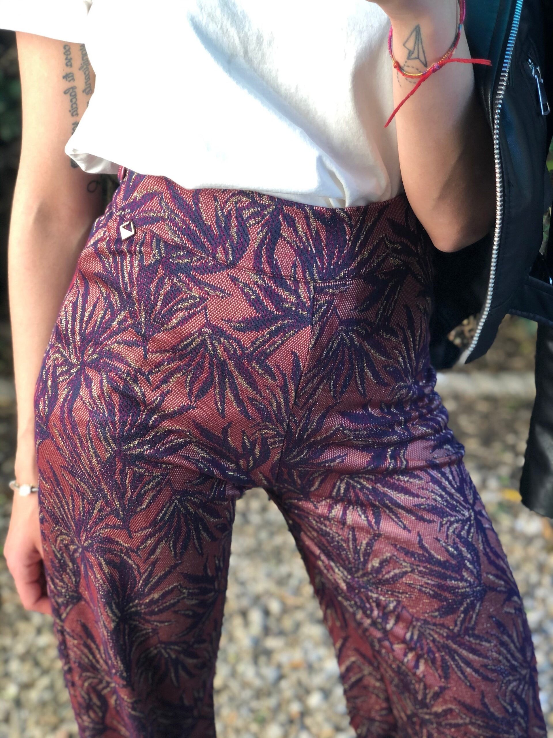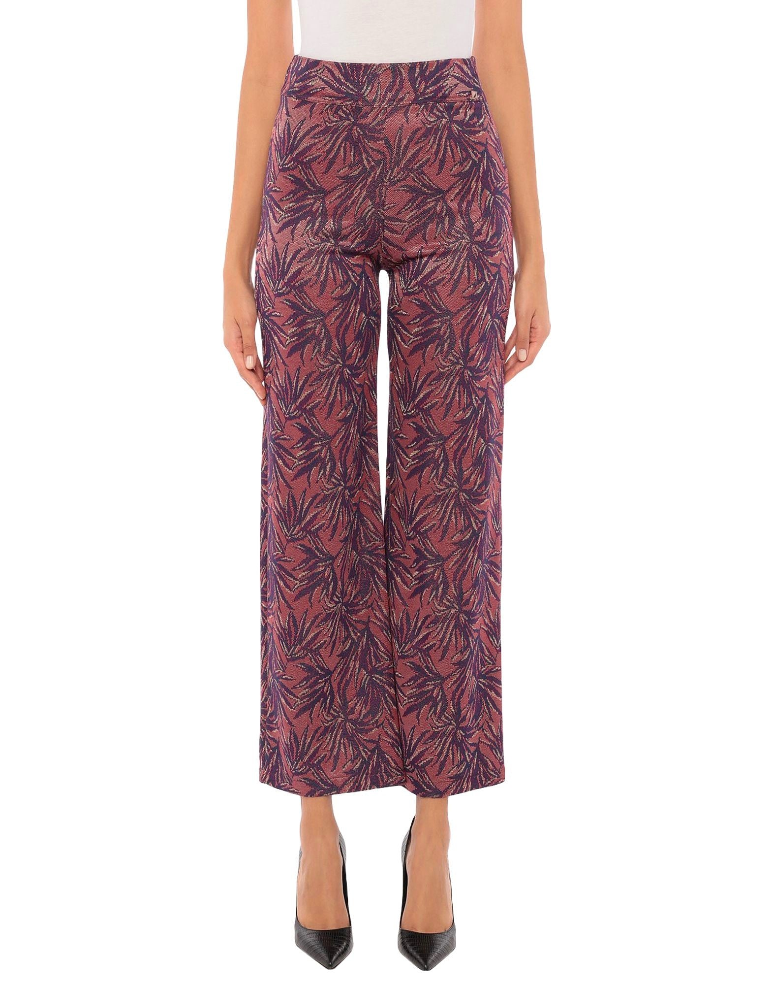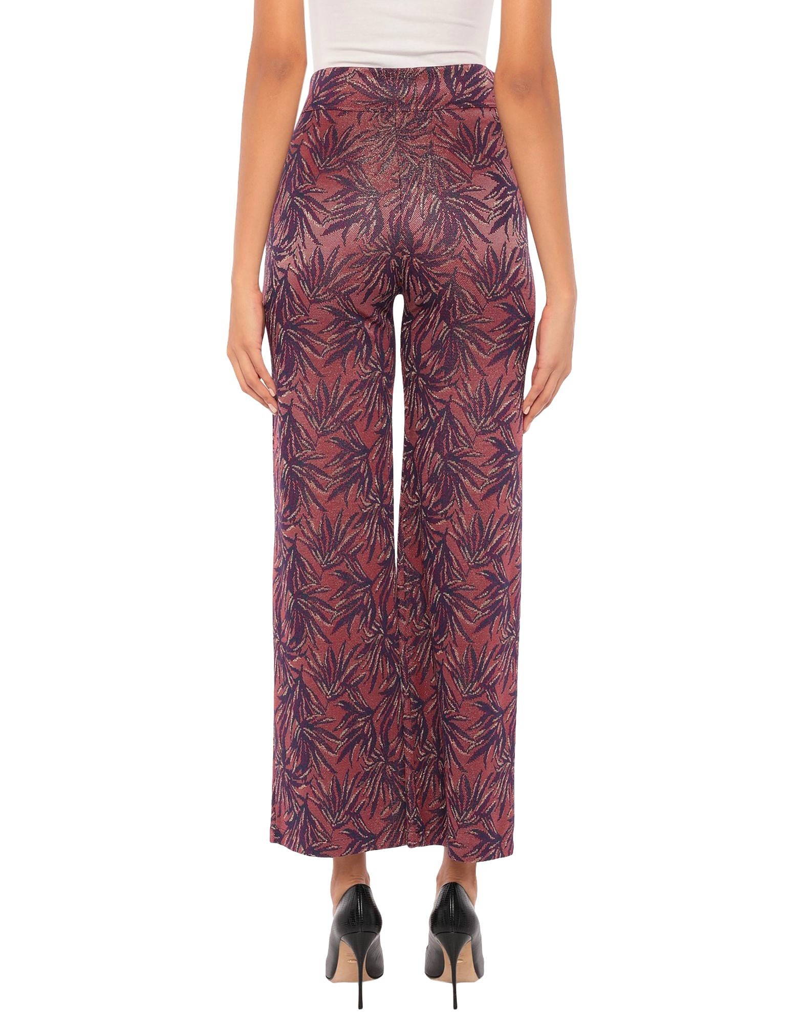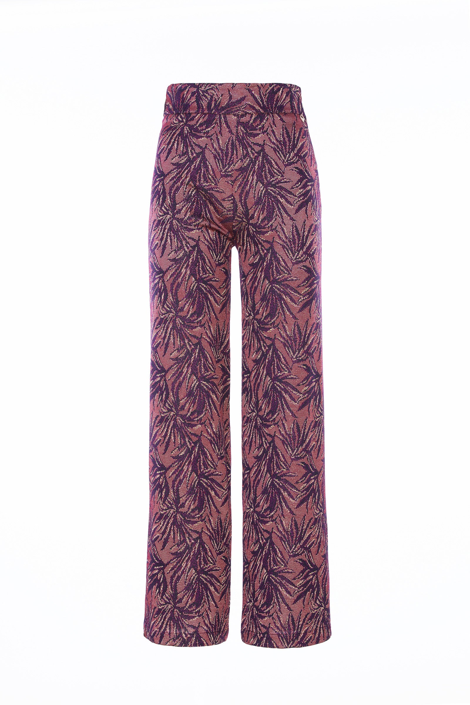 Pantalone in viscosa stampa foglie lurex, taglio palazzo, vita alta con banda morbida, vestibilità regolare, gamba dritta