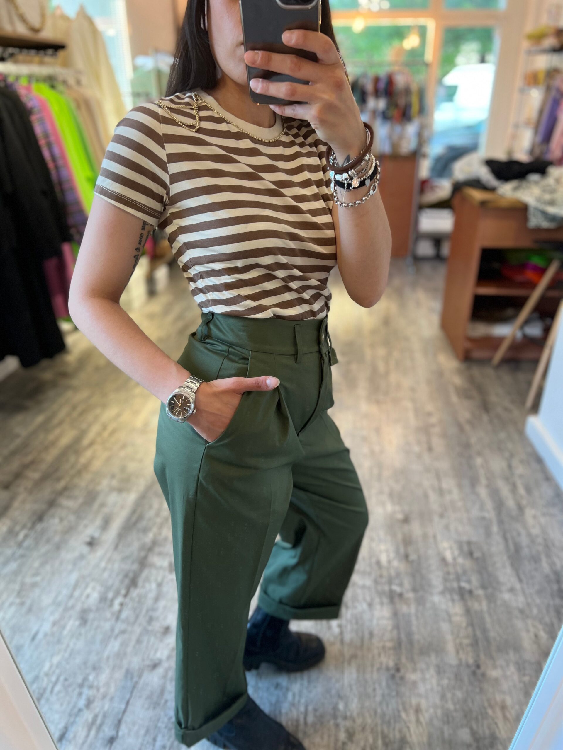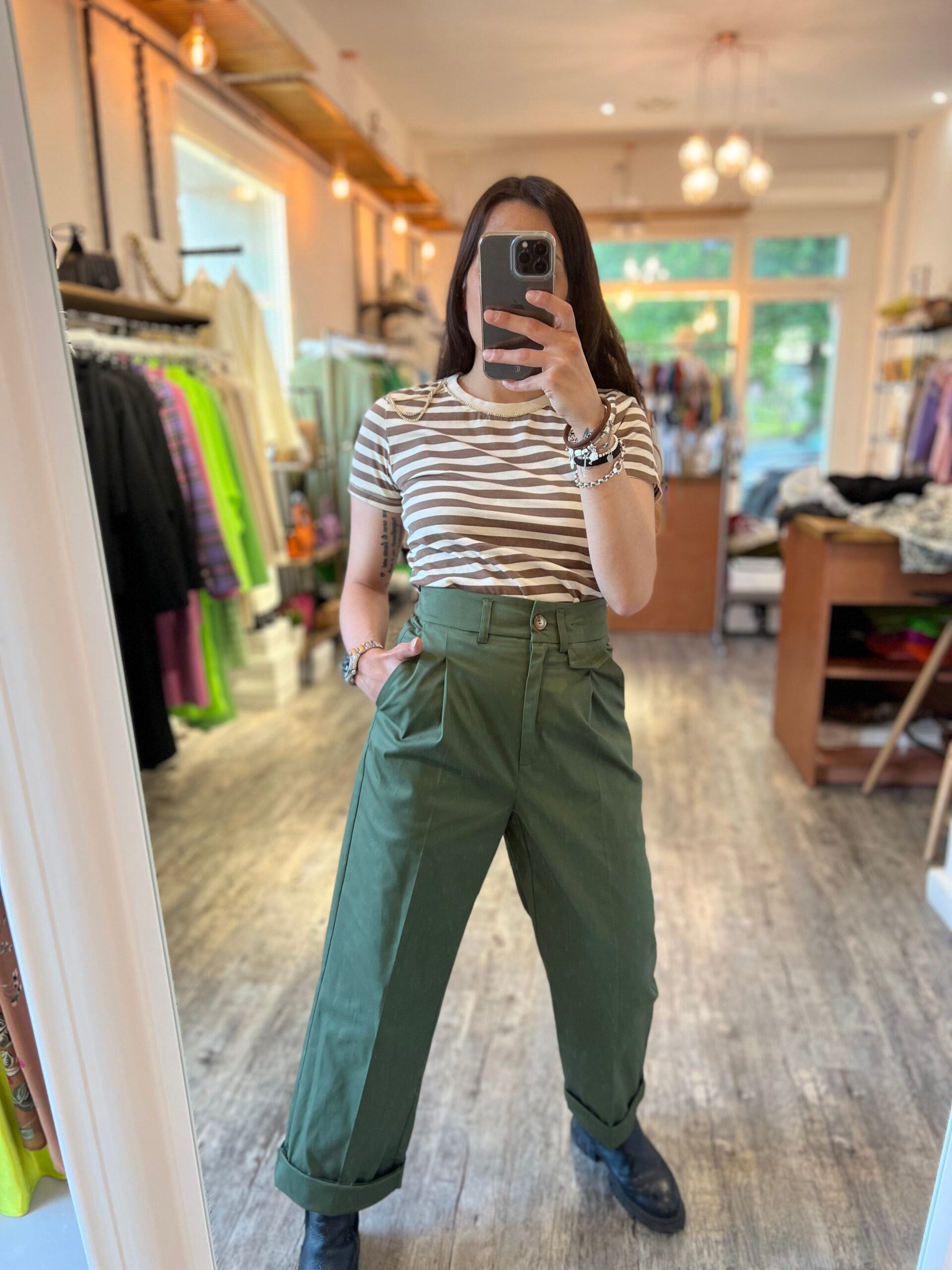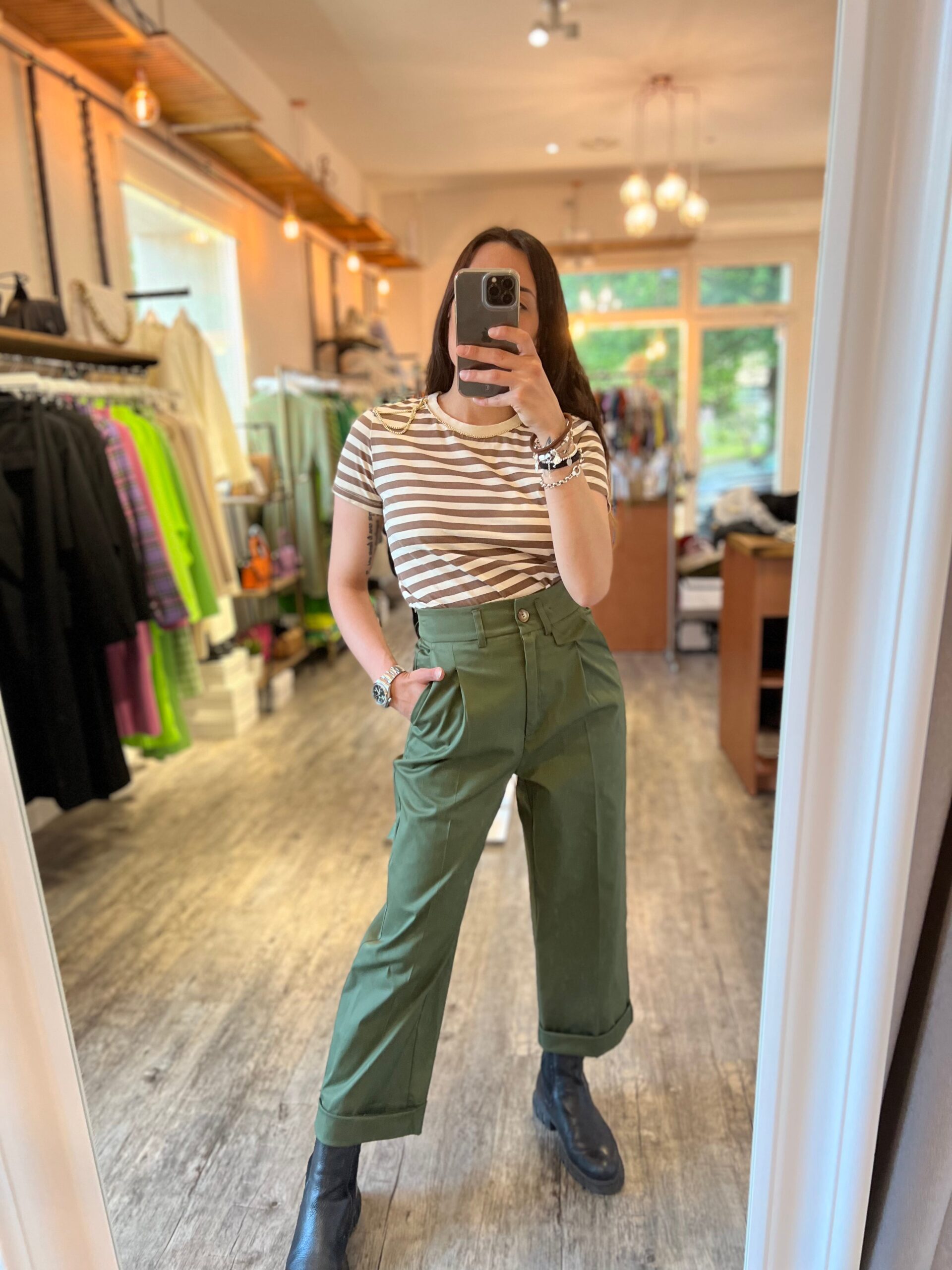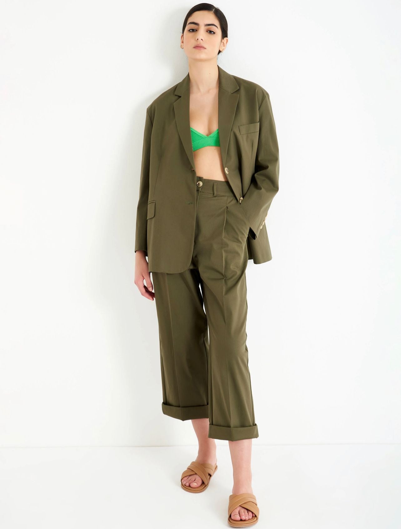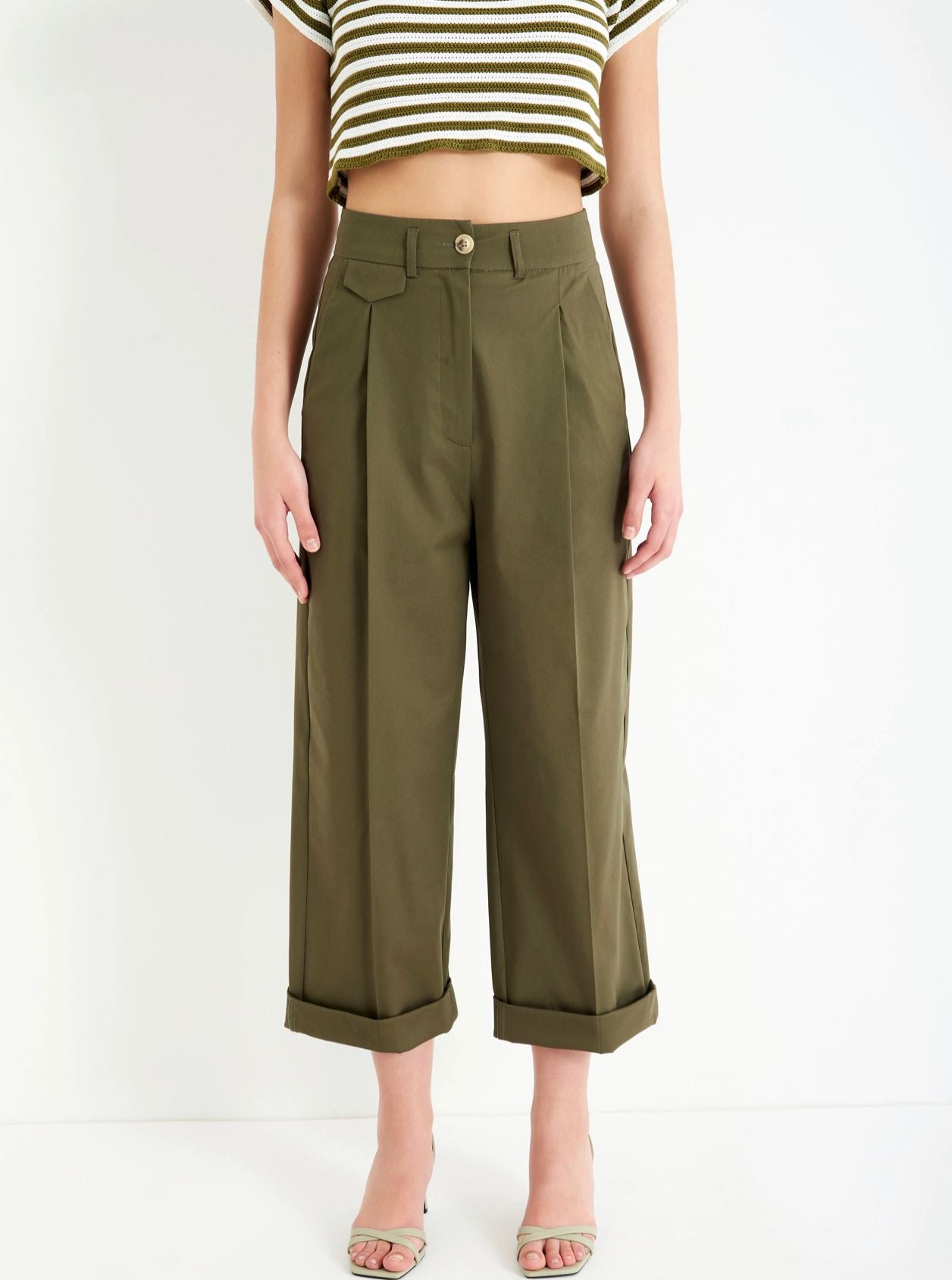 Pantalone palazzo con risvolto sul fondo. Con tasche laterali e tasca a filetto posteriore. Passanti in vita. Chiusura frontale con zip e bottone.