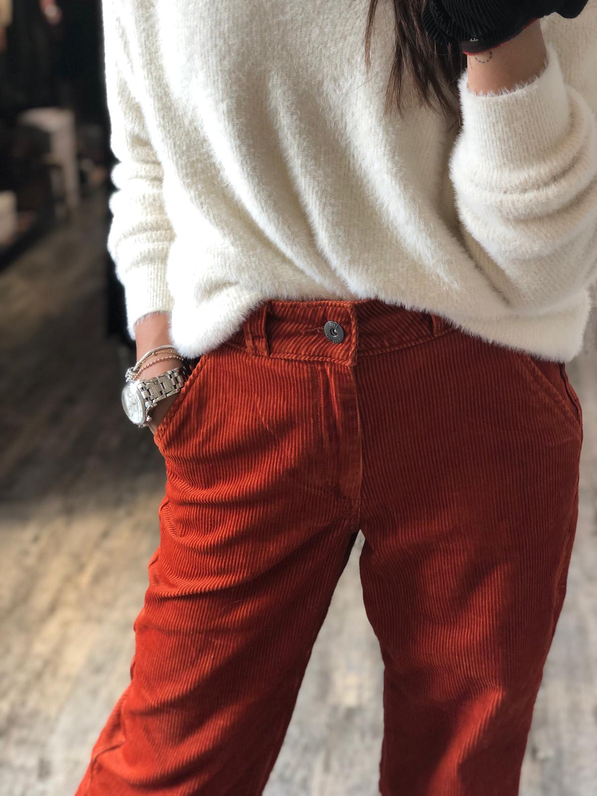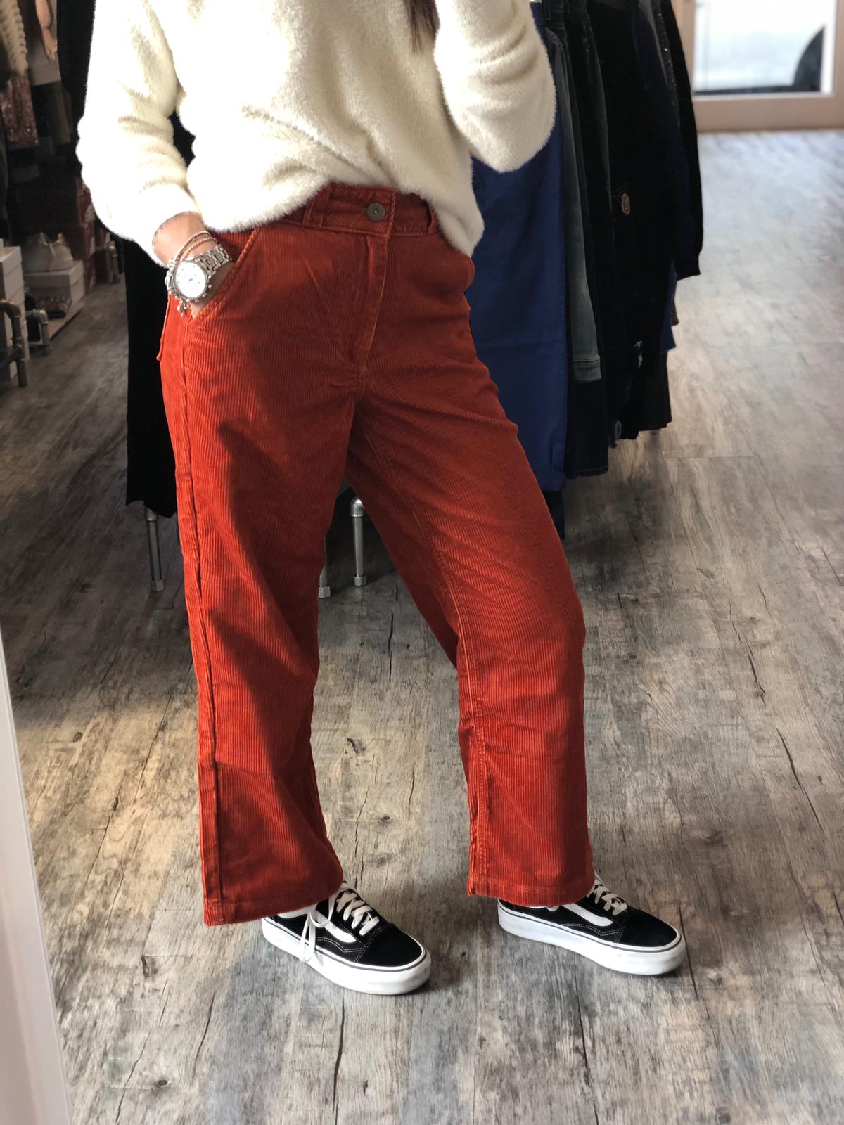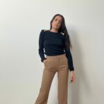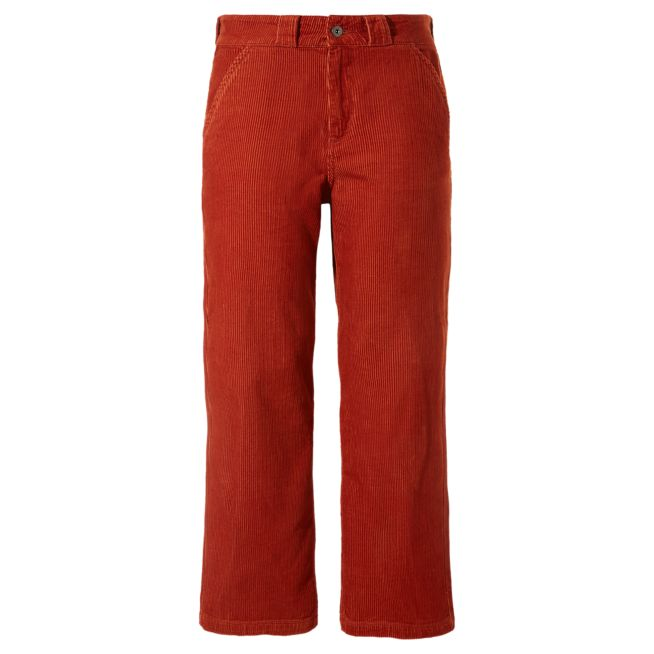 I pantaloni Cordage sono un modello in 100% velluto di cotone a coste ampie e a vita alta con gambe ampie, tasche anteriori all’americana e tasche posteriori applicate. La modella è alta 178 cm, ha una vita di 58,4 cm e indossa una taglia 40.