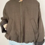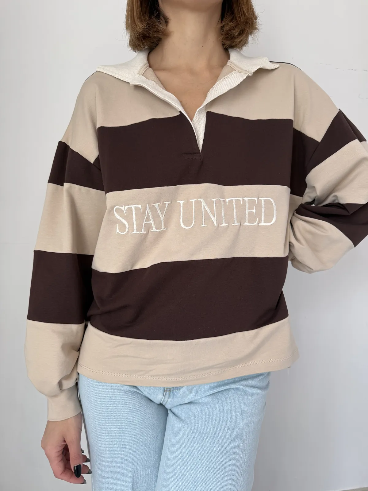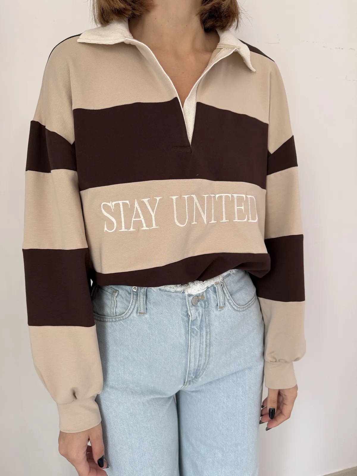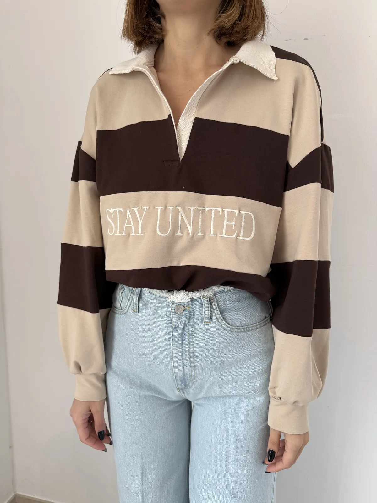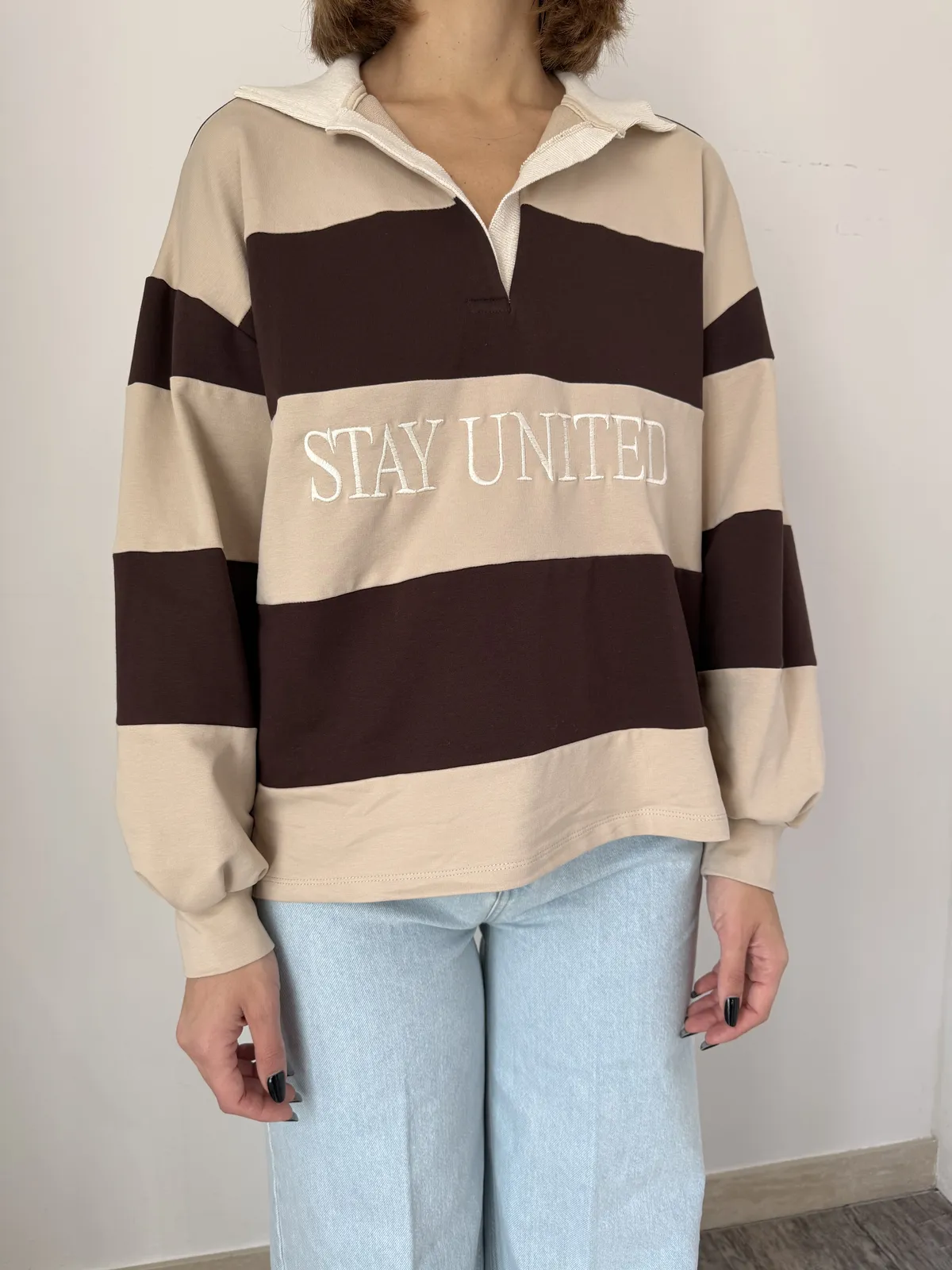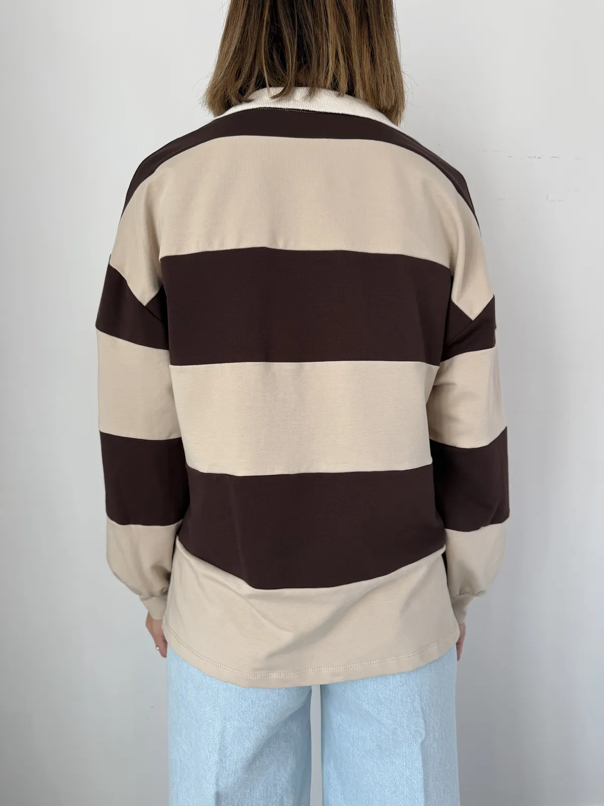 Polo garzata 100% cotone over fit stampa riga vaniglia moro con ricamo, scollo a V e colletto