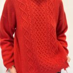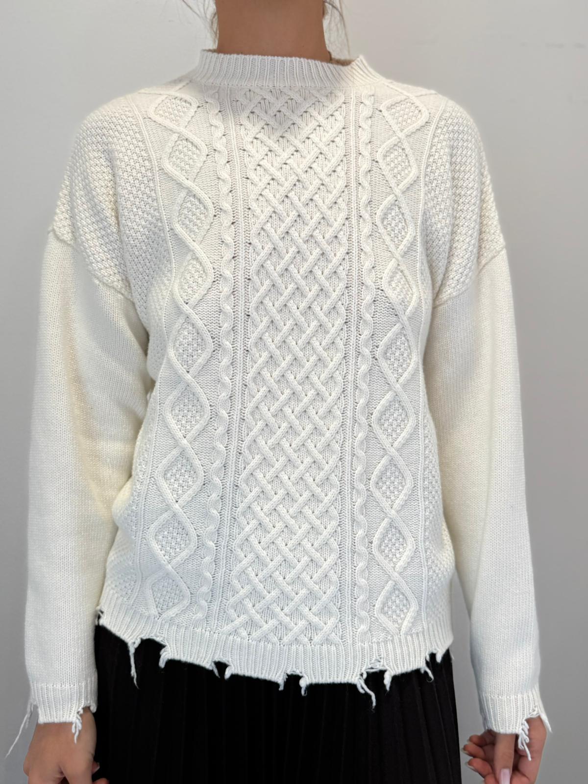 Pull girocollo con lavorazione trecce frontale e rotture sparse sul fondo e sui polsini, fit morbido dritto