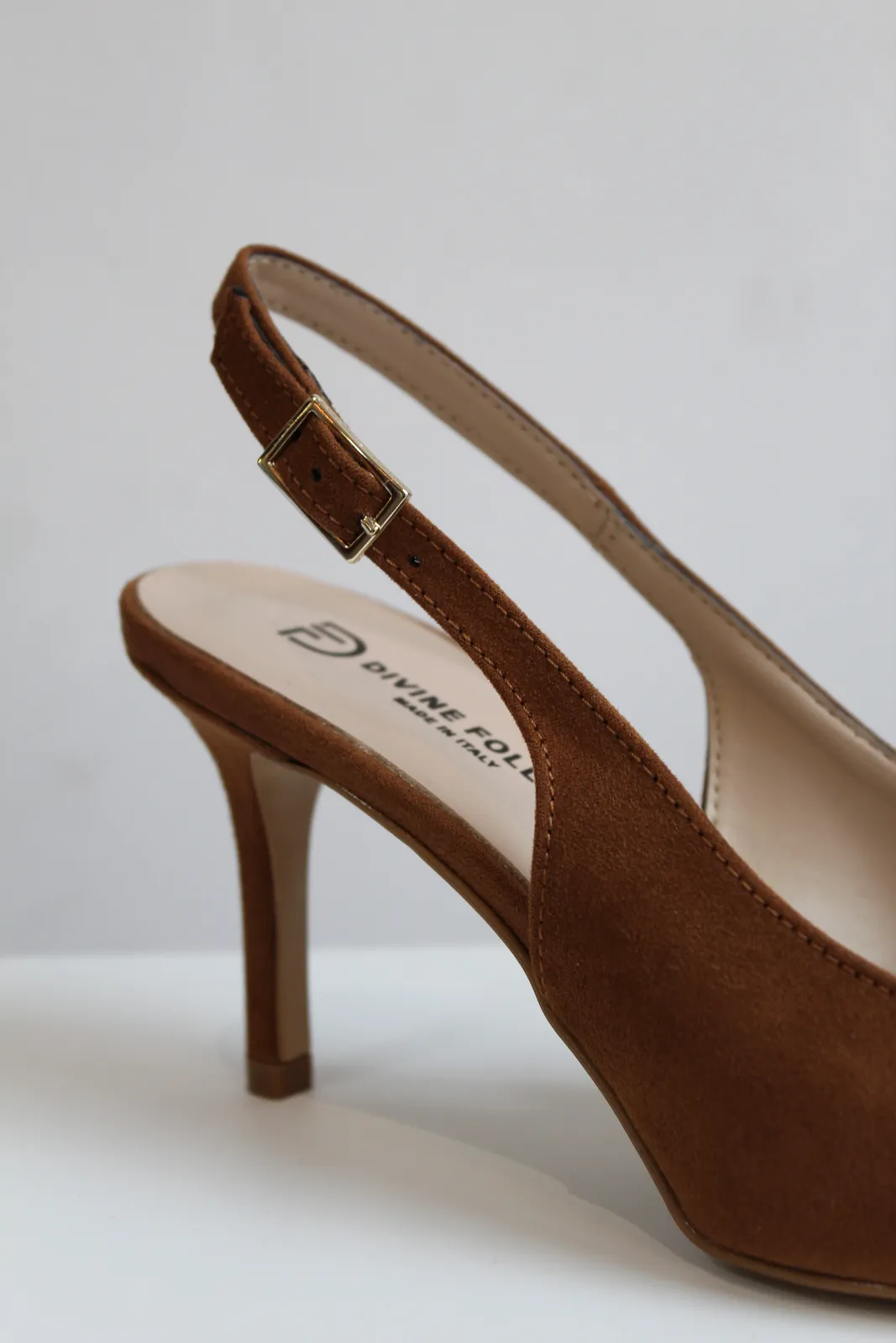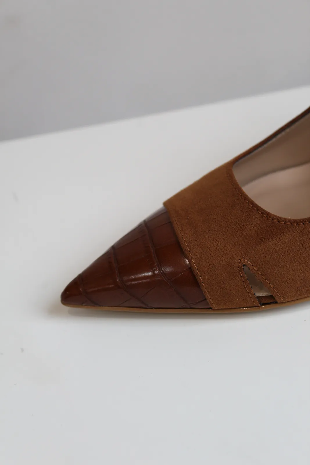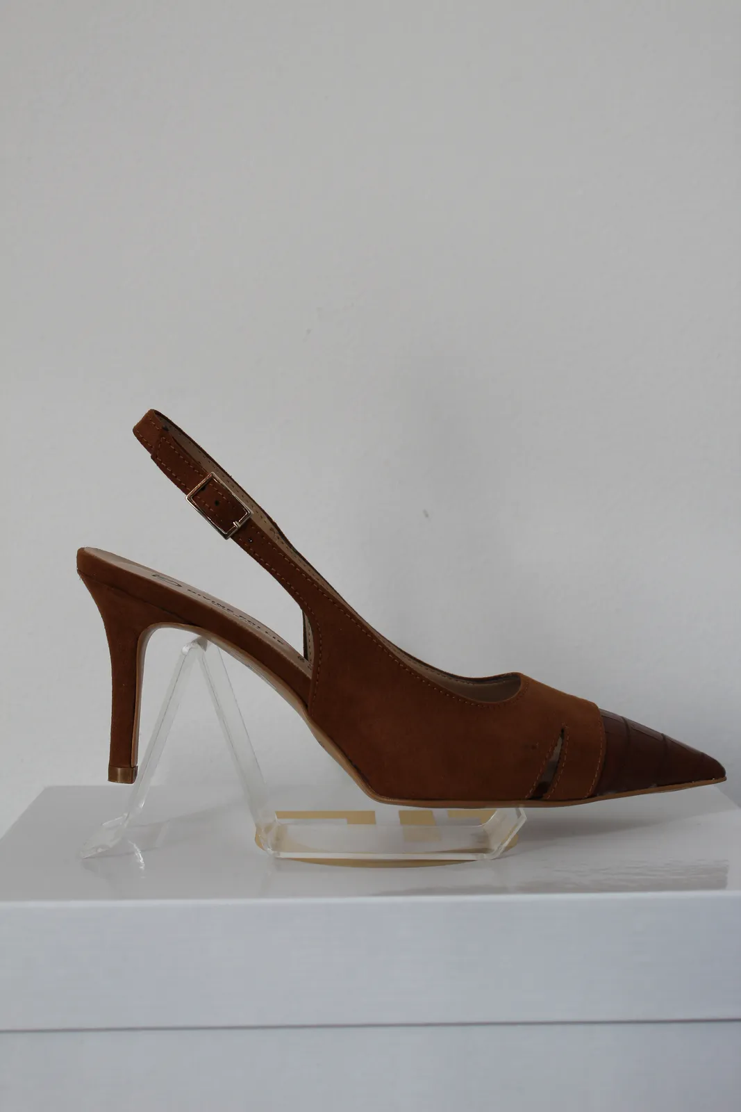 Slingback tacco 7cm con punta in effetto cocco in tono suede cognac e piccoli tagli cut ai lati, cinturino regolabile a caviglia