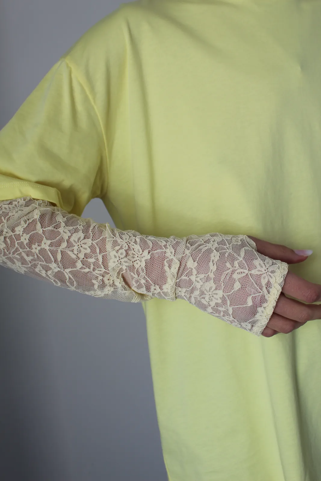 T-shirt over tinta unita con manicotti in pizzo e occhiello per pollice