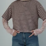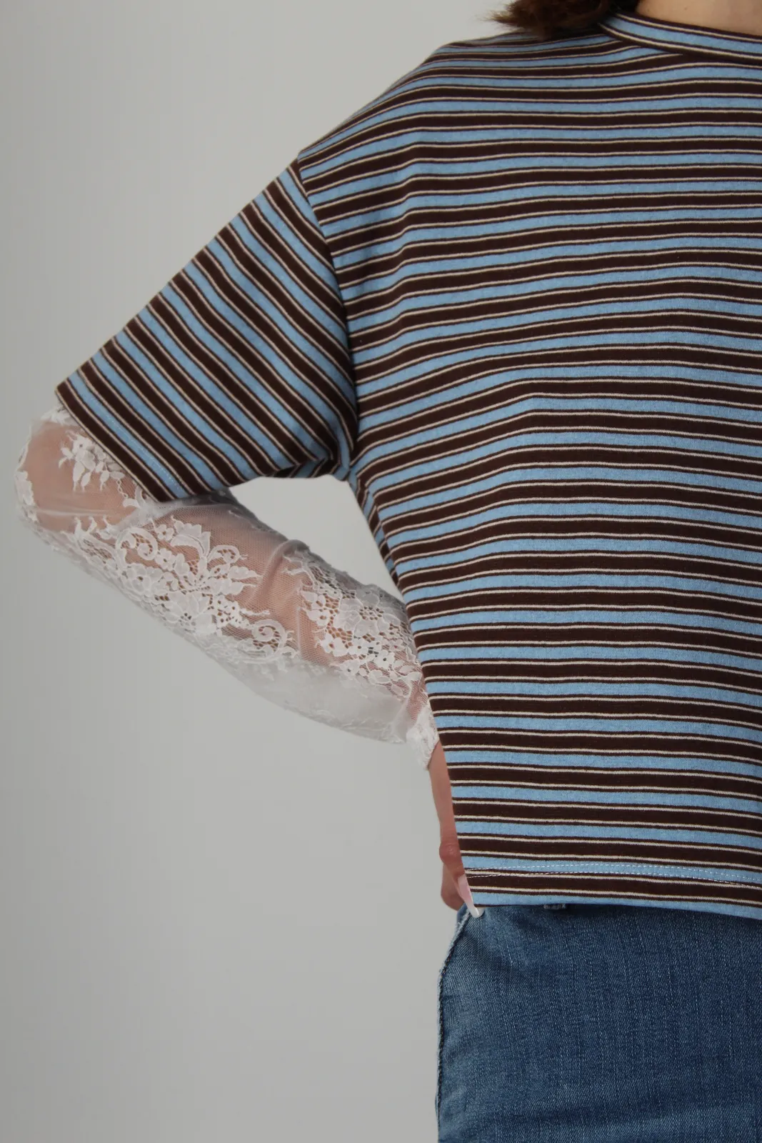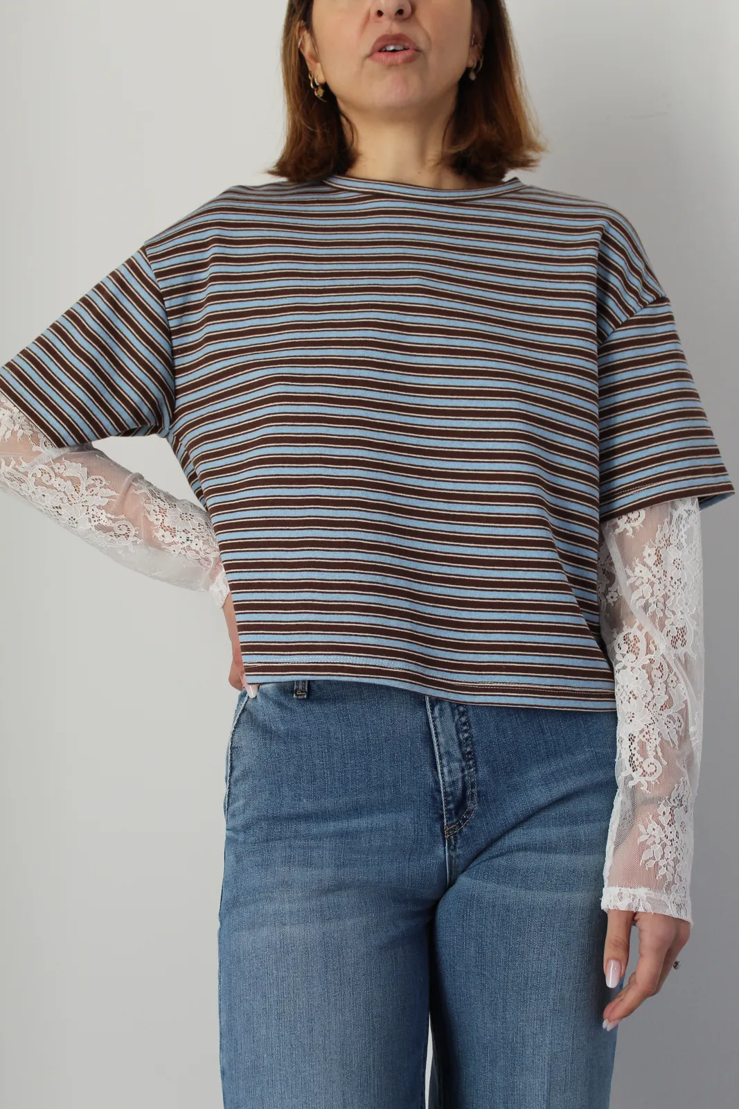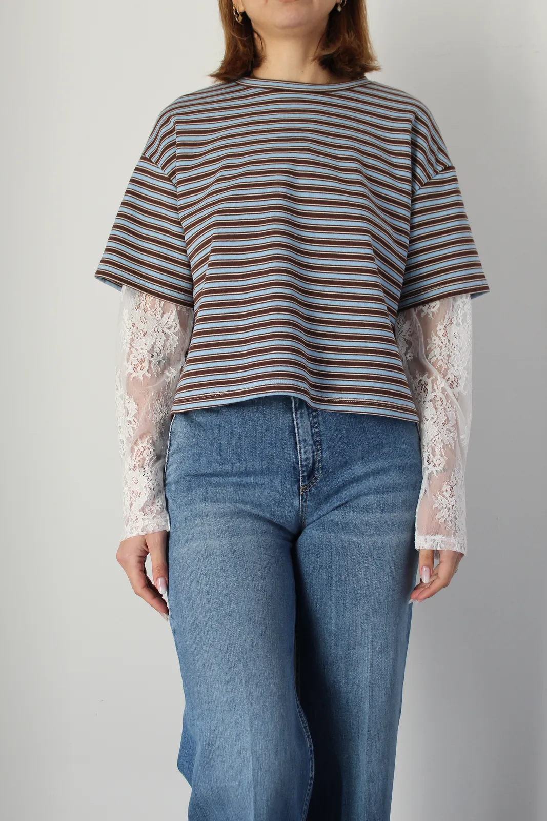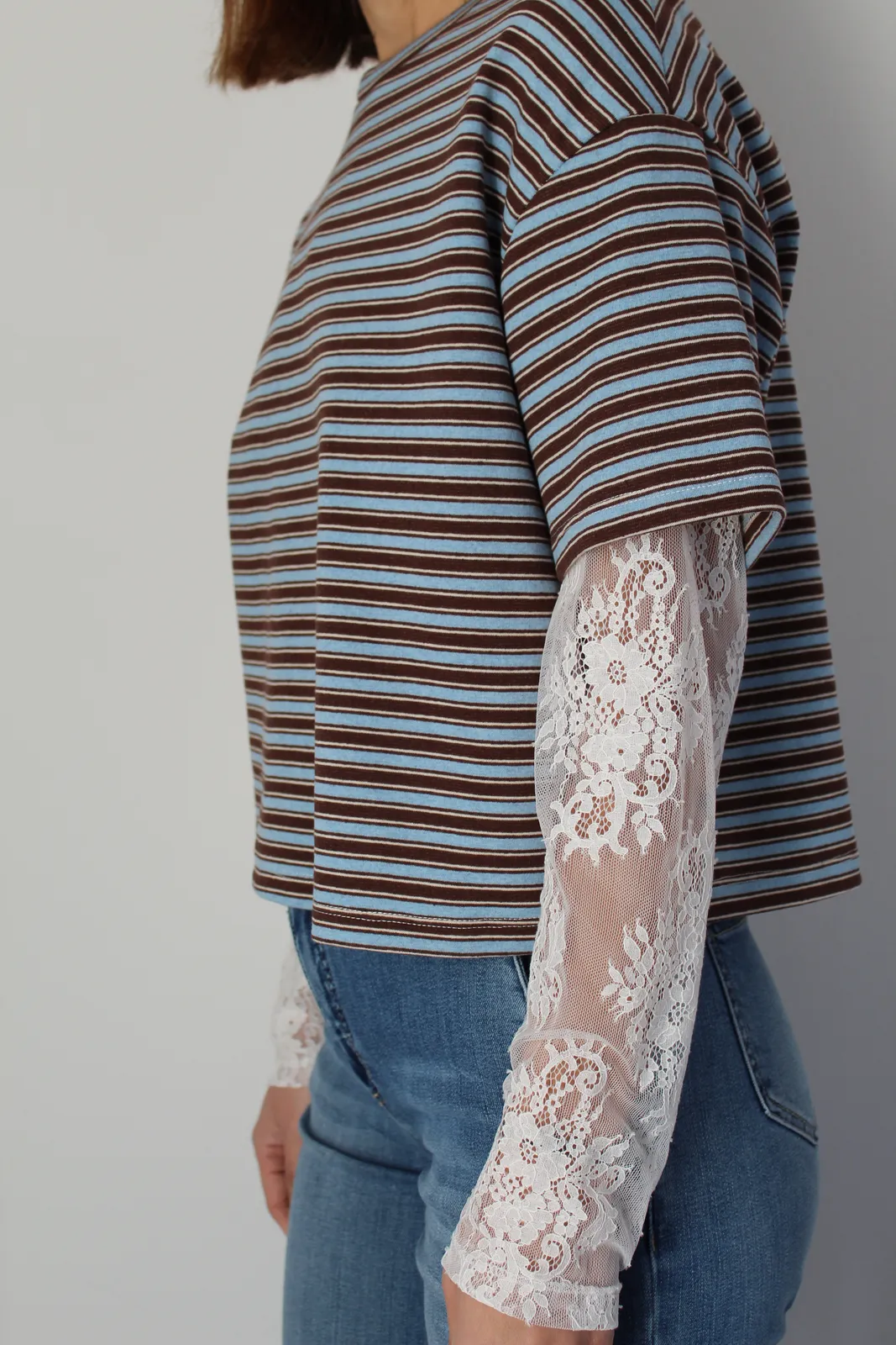 T-shirt scatoletta in cotone strutturato a righe con inserto manica in pizzo