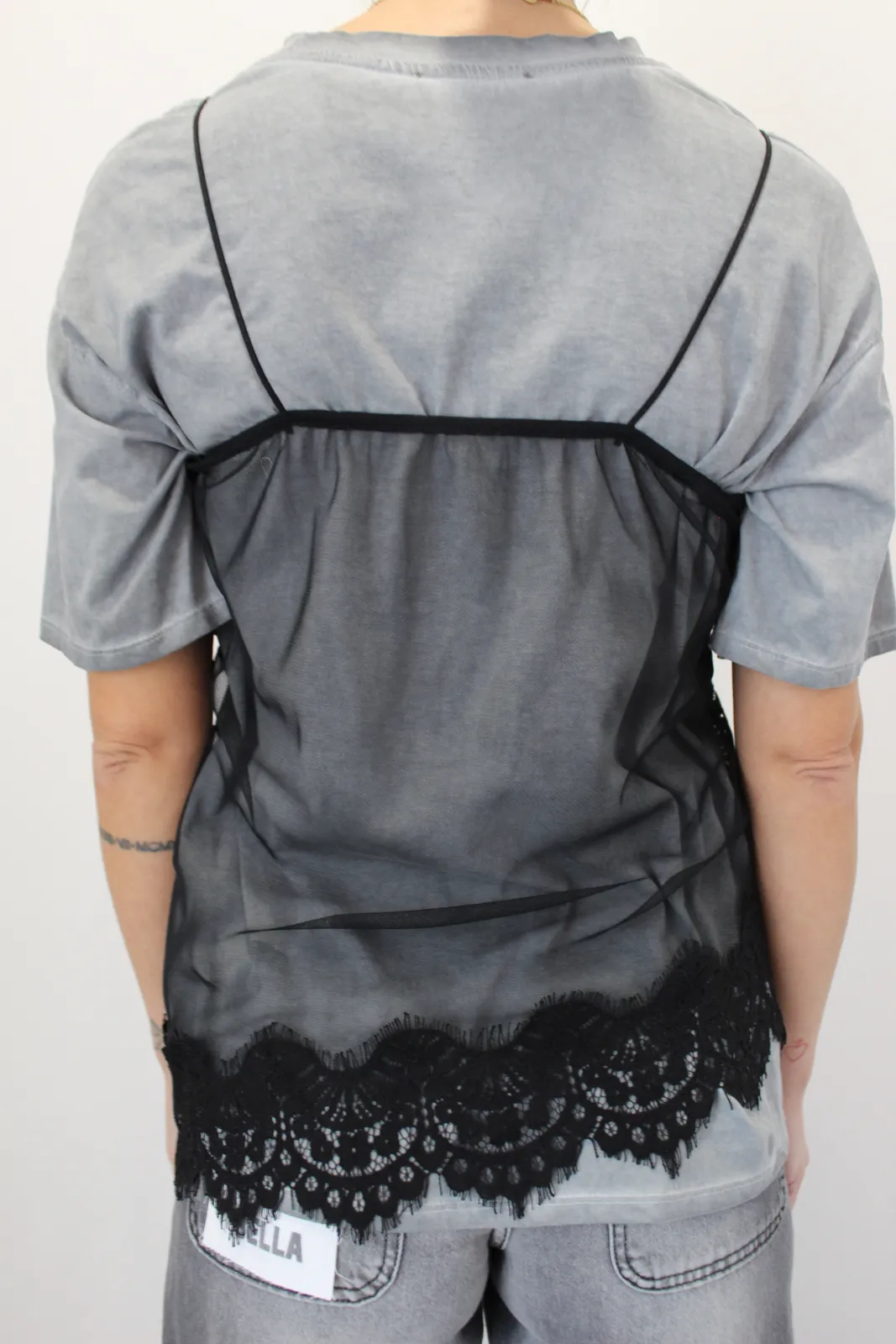 T-shirt regular con stampa in effetto grigio stone wash e canotta in pizzo abbinata ma removibile