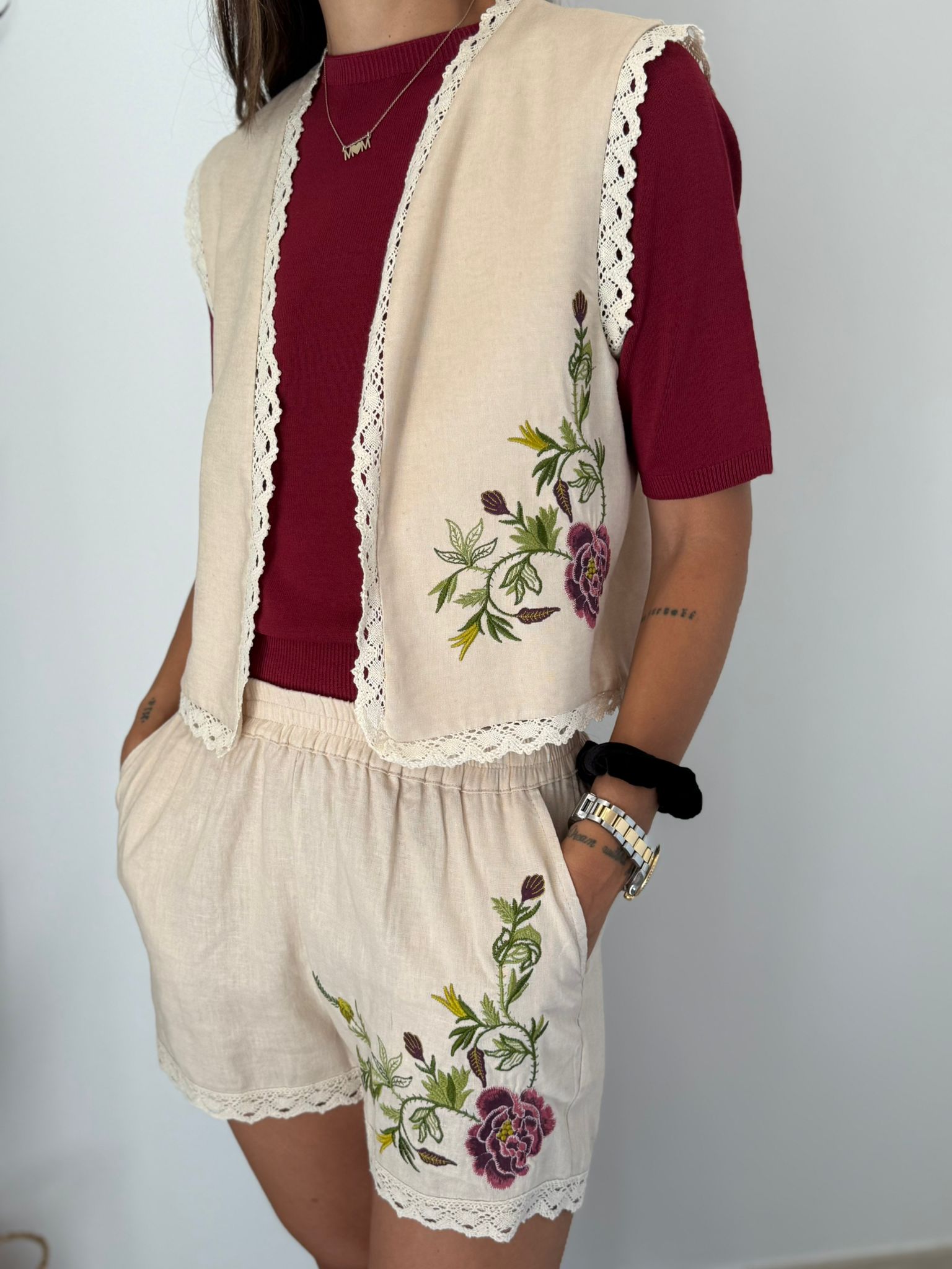 Gilet misto lino senza chiusure taglio scatoletta dritto con applicazione merletto sulle bordature e ricamo floreale