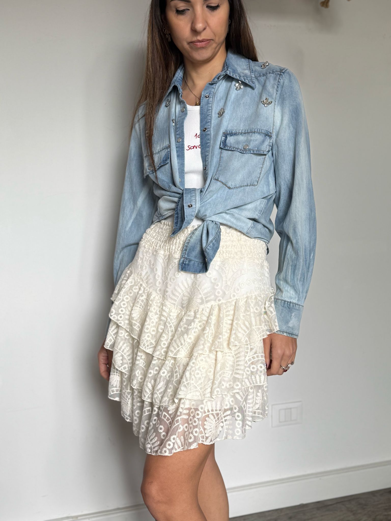 Mini gonna a balze asimmetrica lavorata in pizzo con banda elastica arricciata in vita, fodera interna