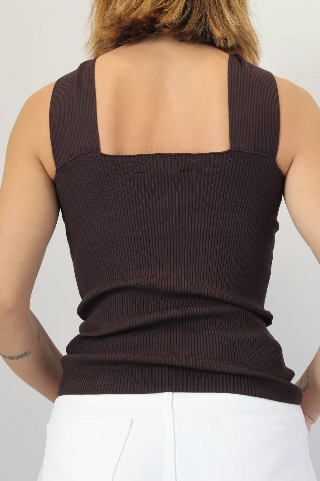 Top slim fit a costine con incrocio sullo scollo e anello oro a rifinire, spalla larga, viscosa di qualità confortevole ed elegante nel tempo, lunghezza regular