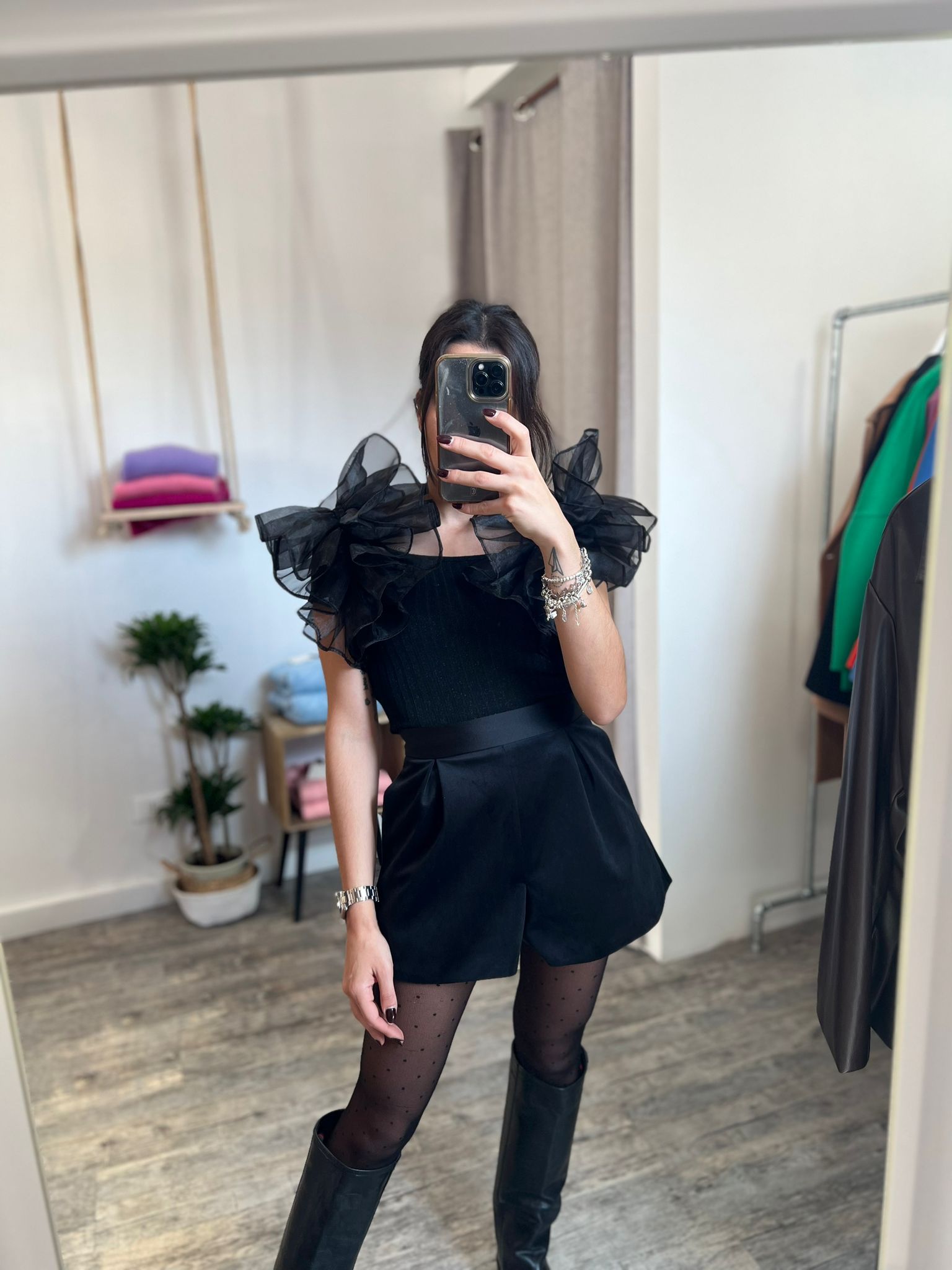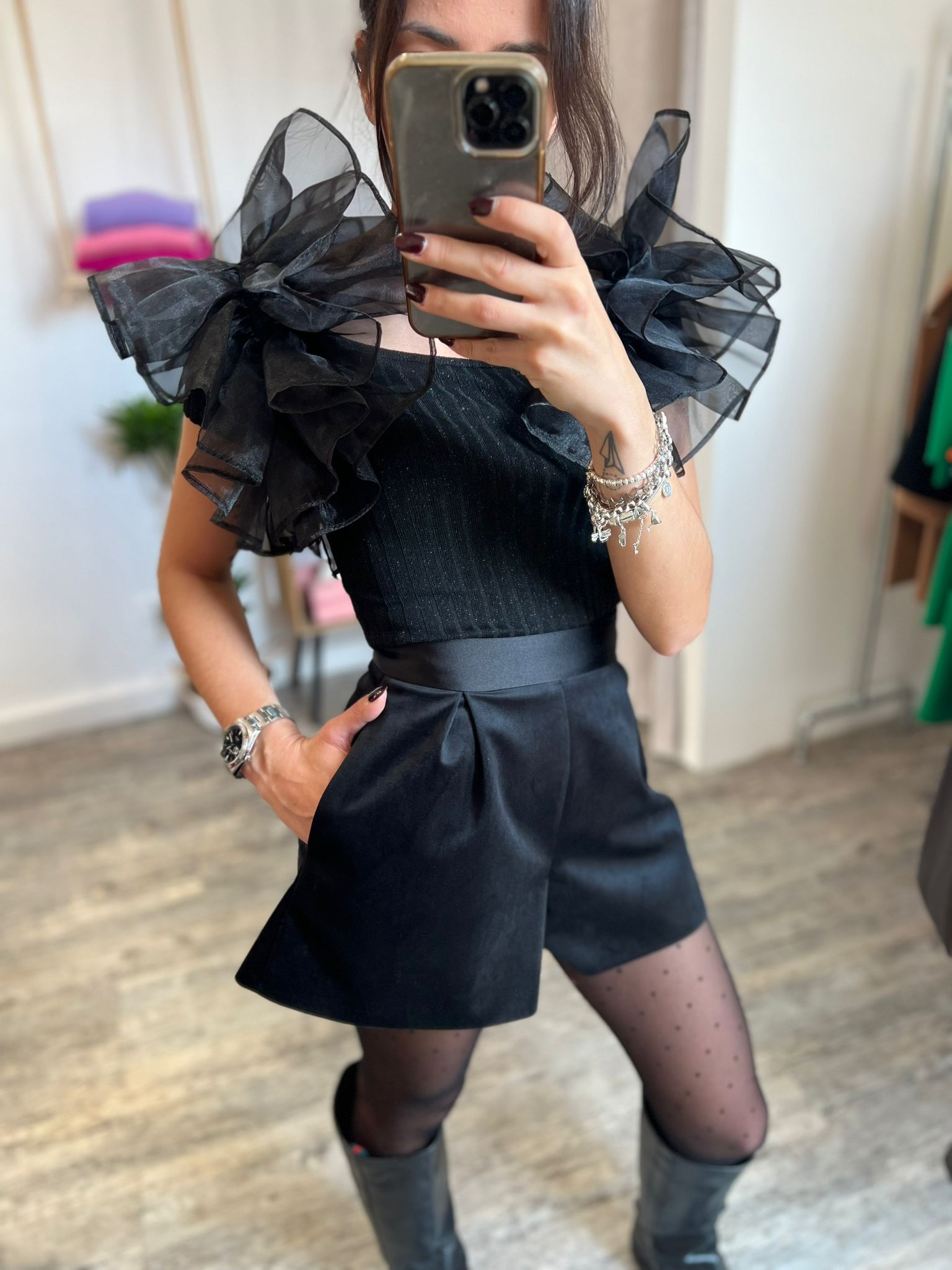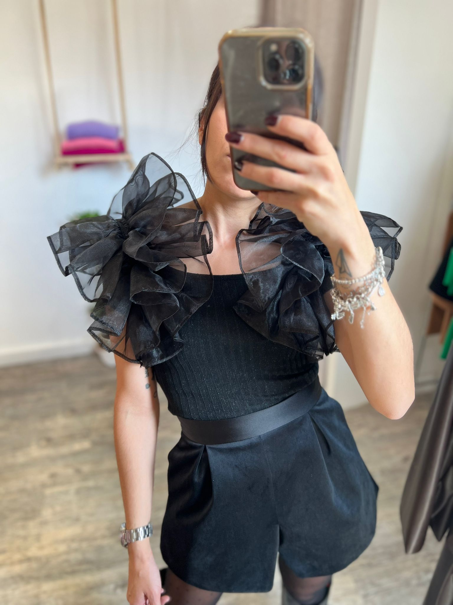 Top cropped in costina lurex con vestibilità aderente e applicazione rouches su strati su entrambe le spalle