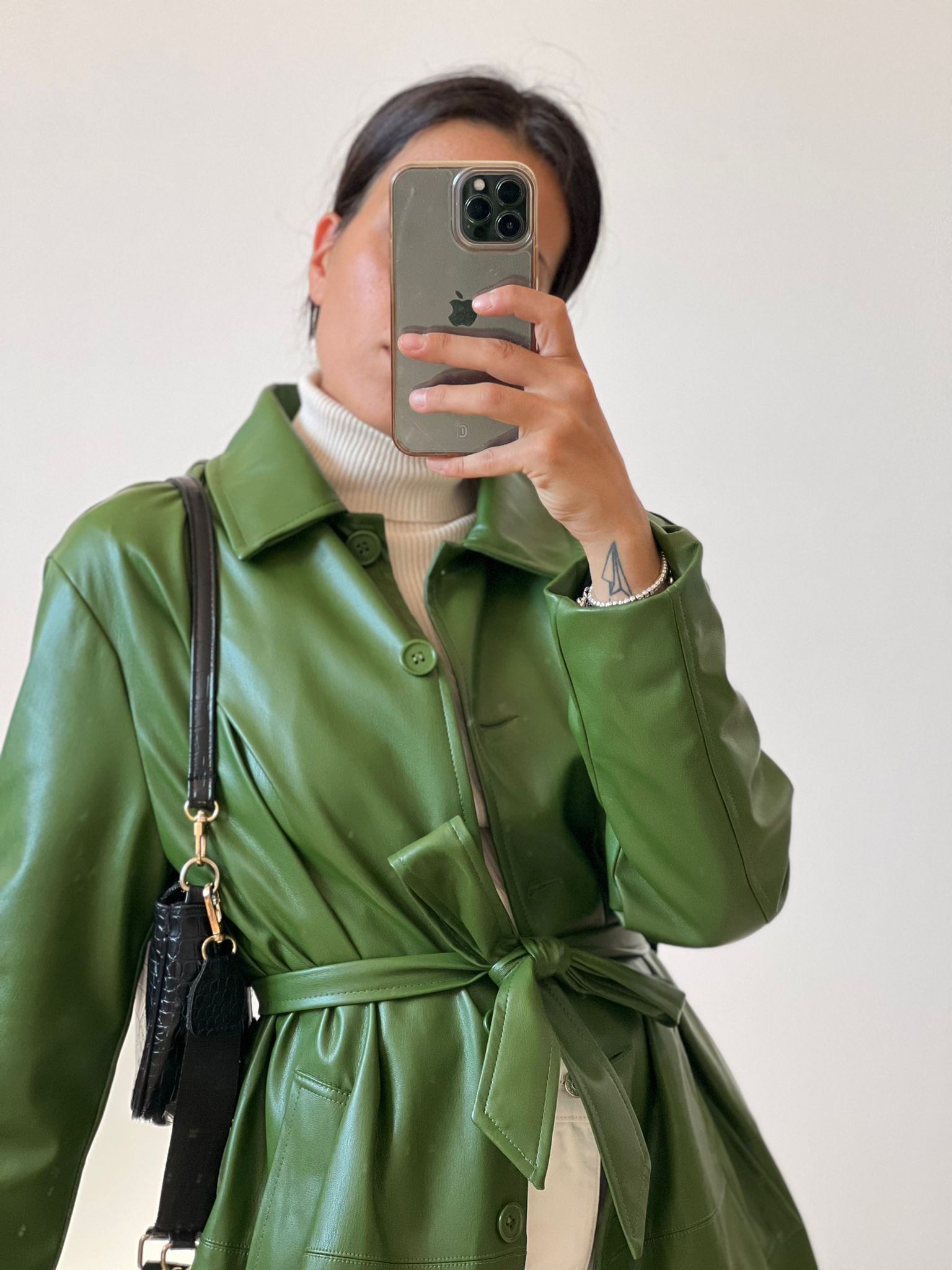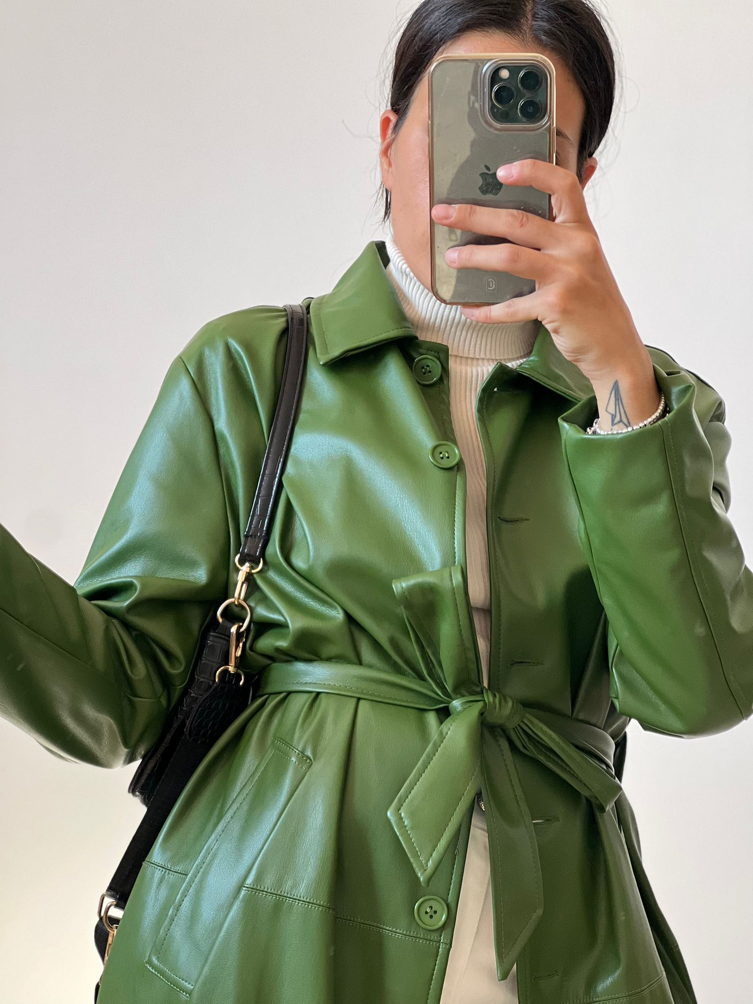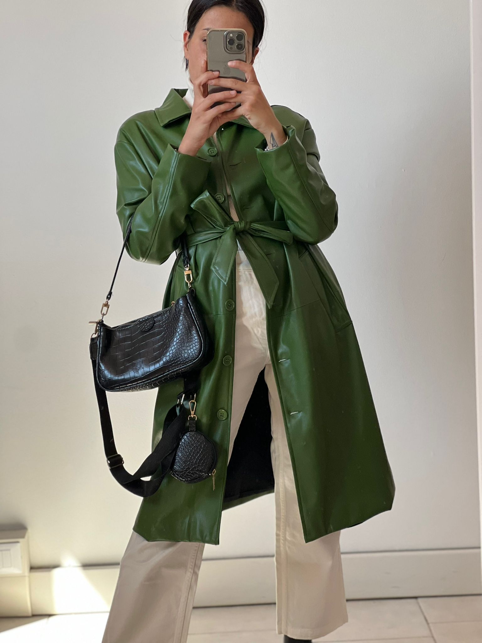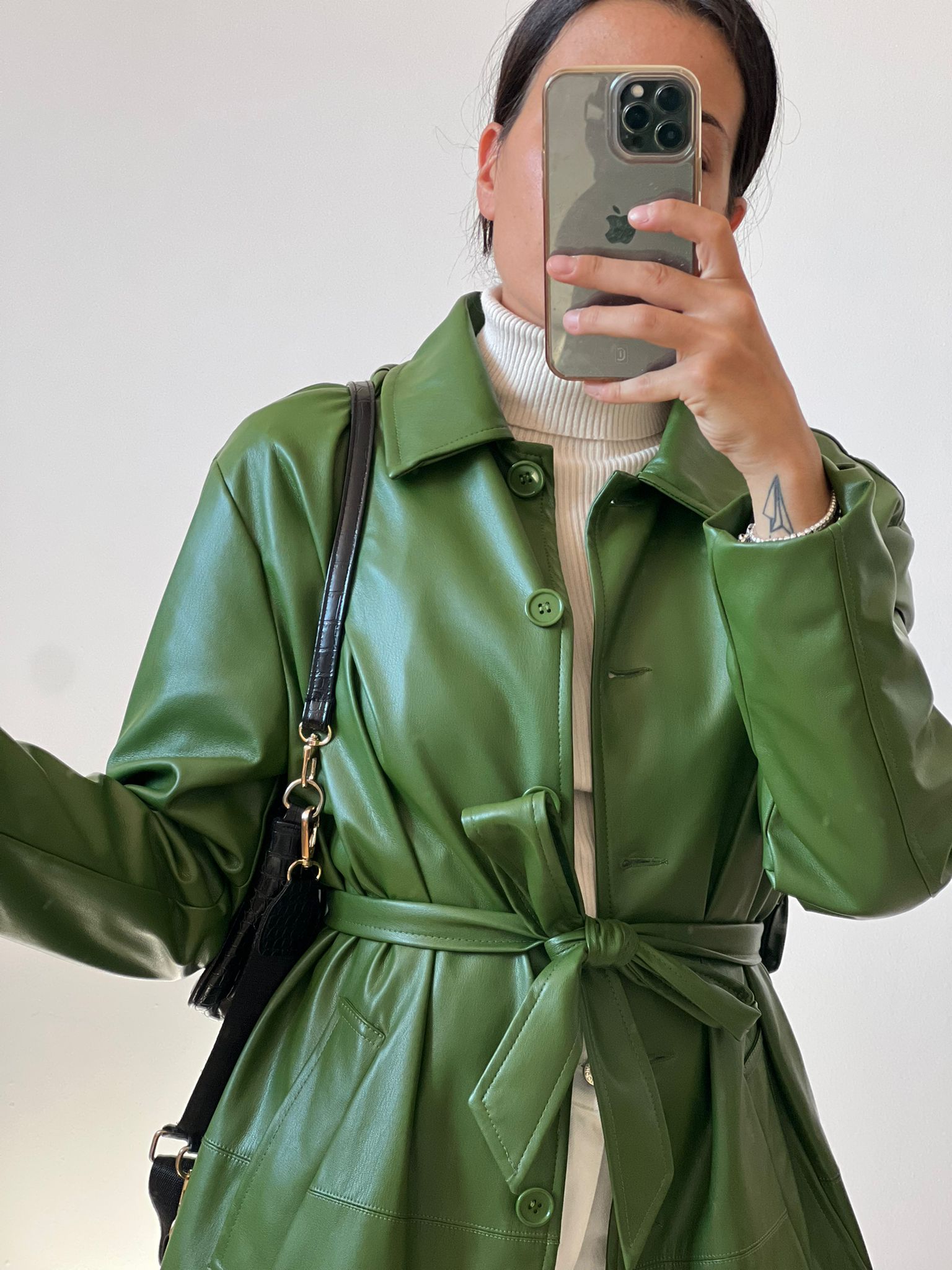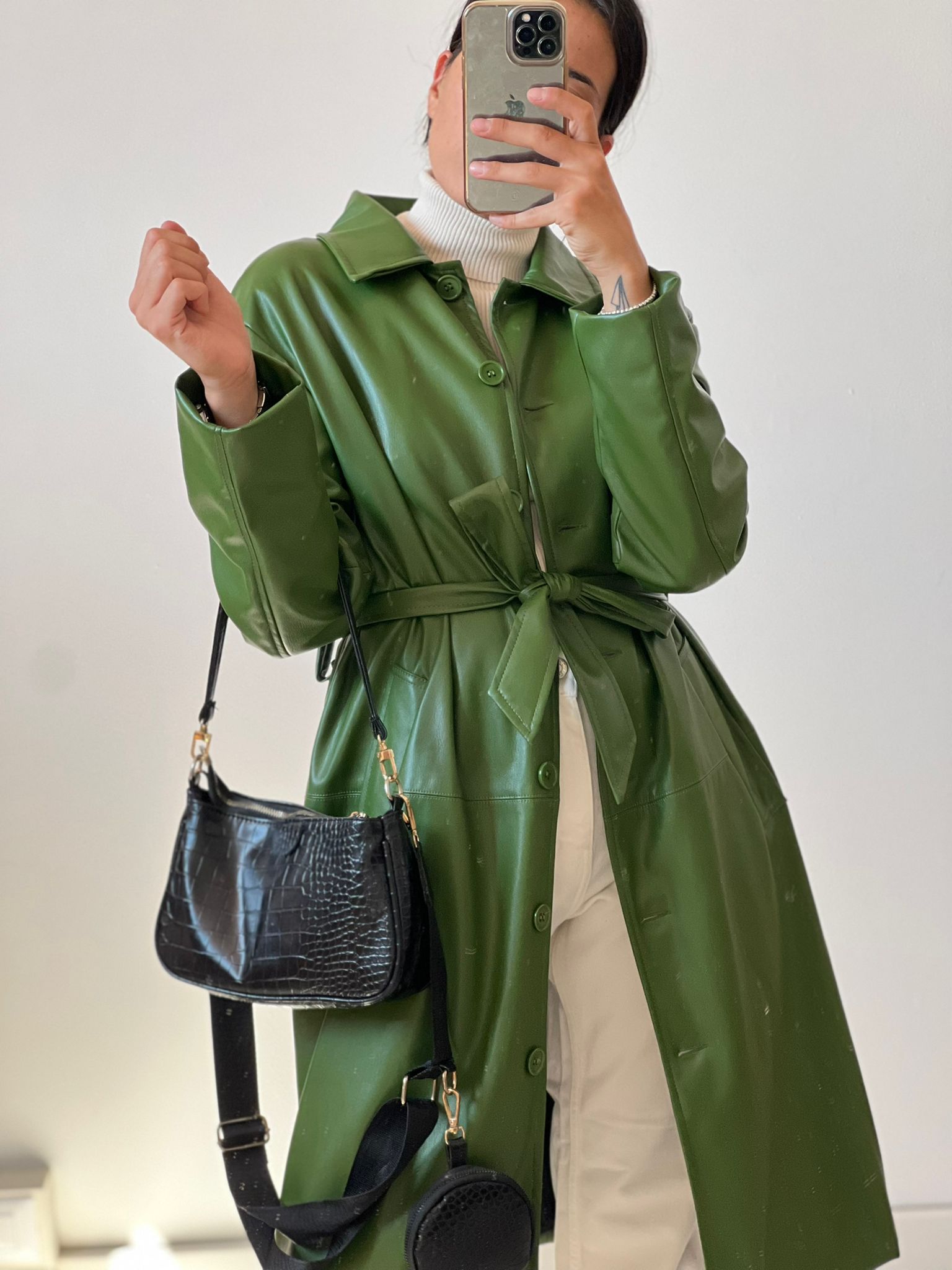 Trench taglio classico con colletto in ecopelle con bottoni in ton sur tone e fusciacca removibile, in foto si indossa S/M, foderato all’interno