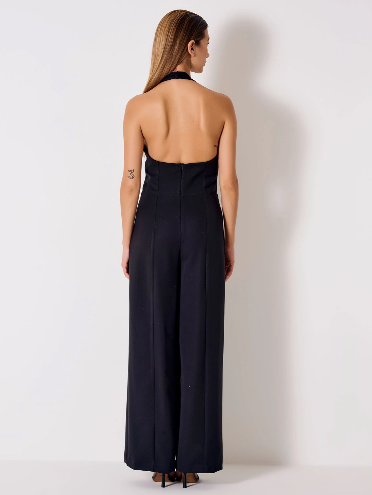 Tuta lunga con scollo a V e gamba ampia. Chiusura posteriore con zip invisibile e bottoncini dietro al collo. Dettaglio schiena scoperta.