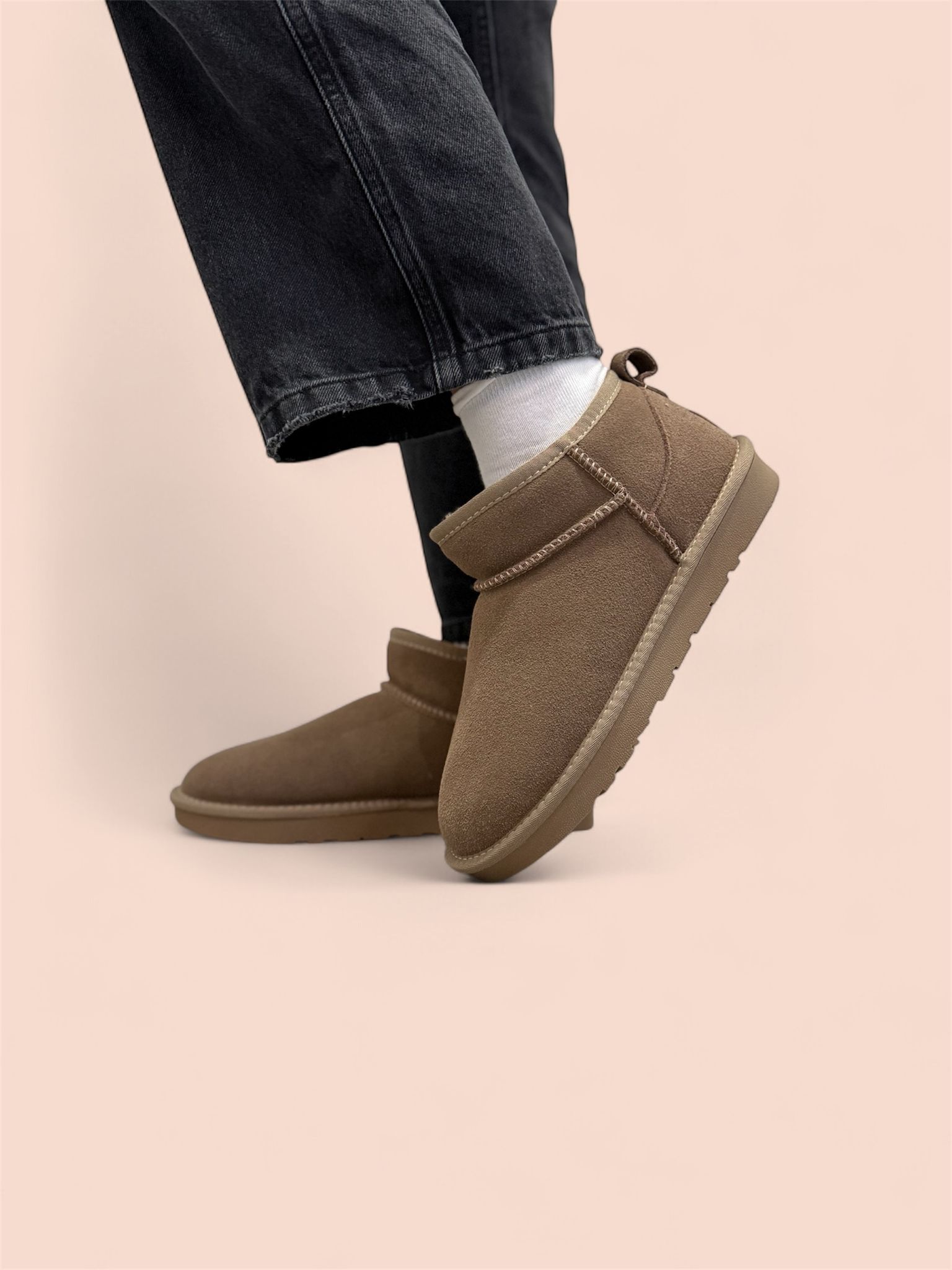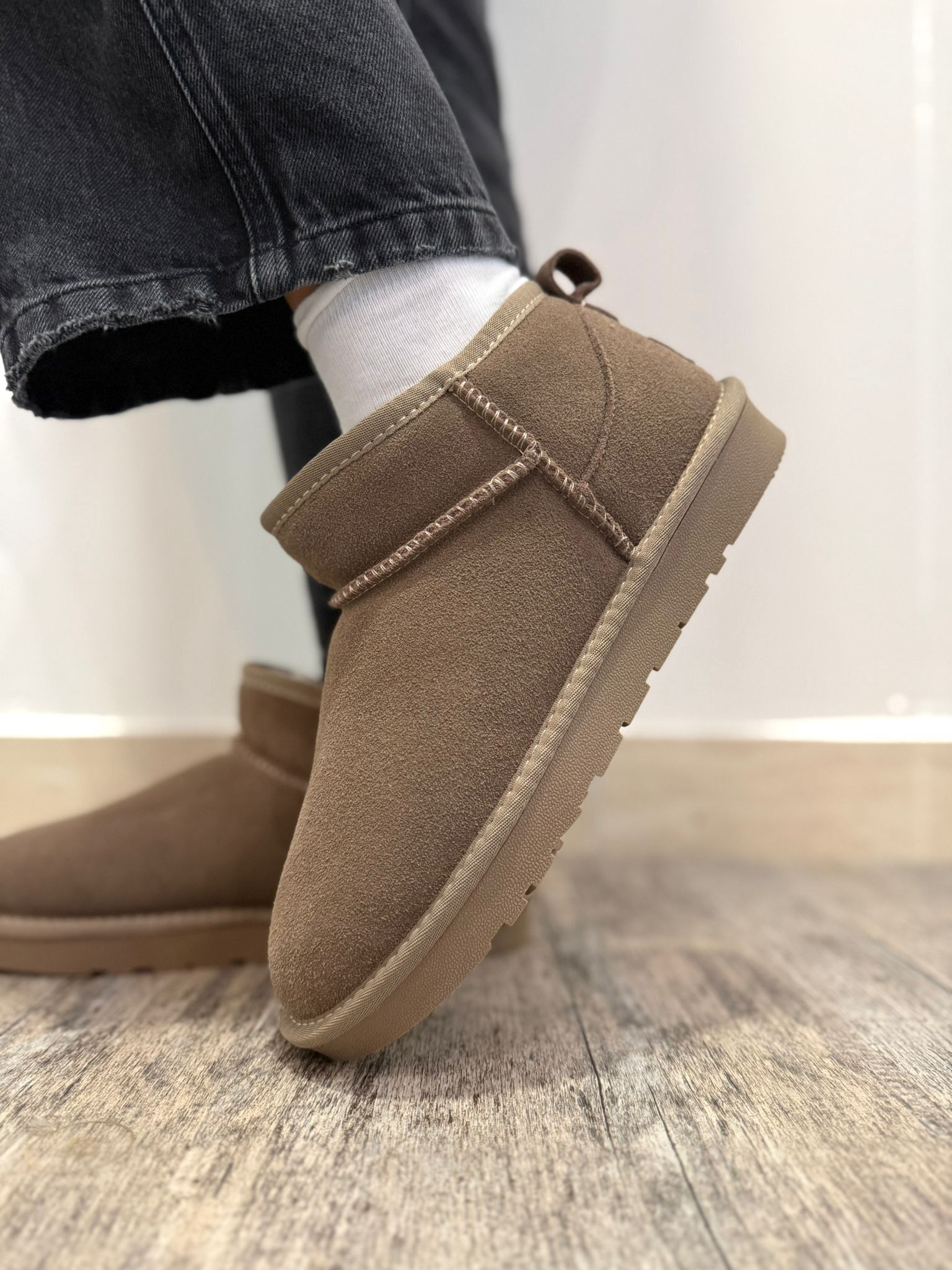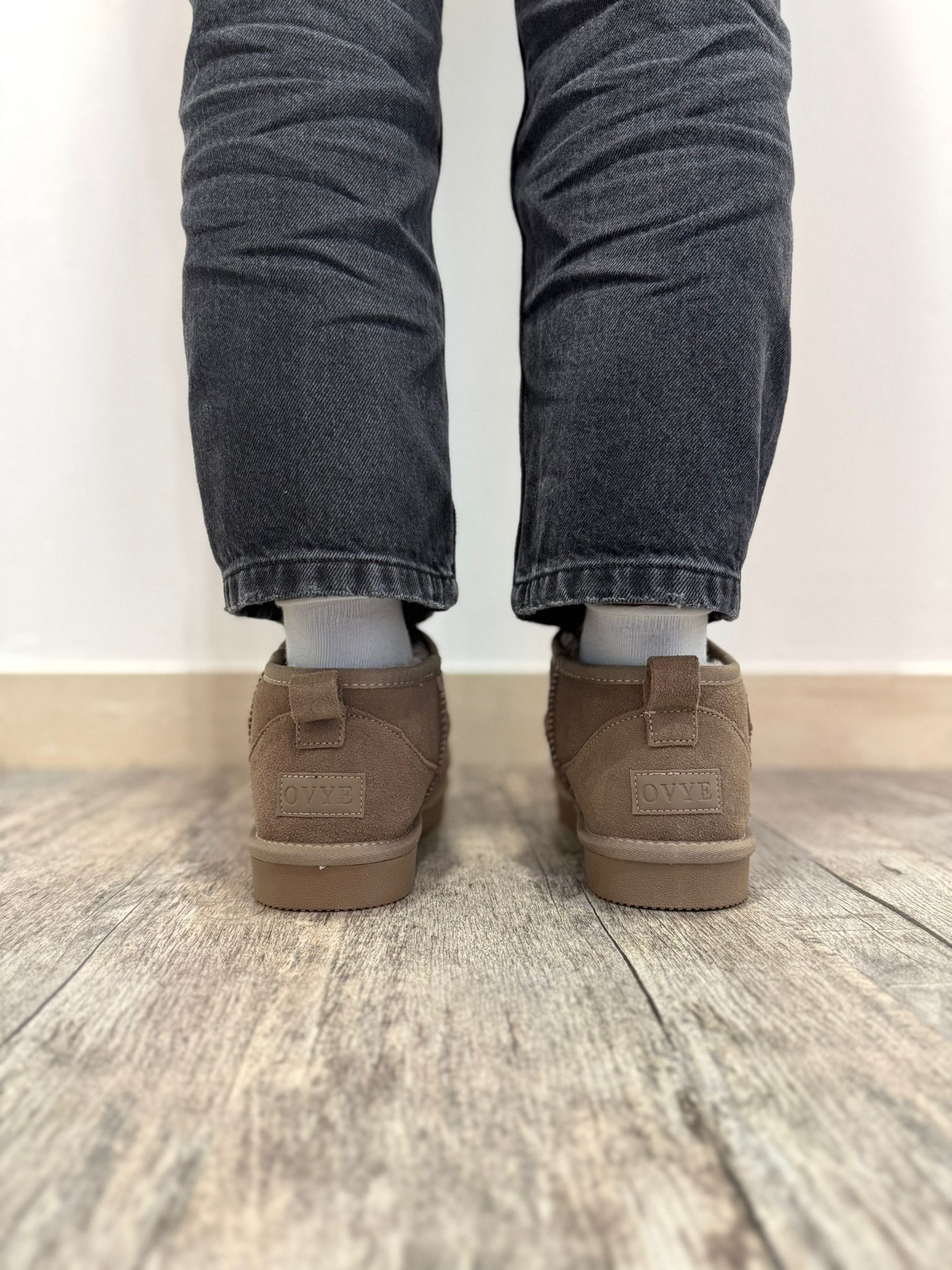 Stivaletto in crosta ultra mini con imbottitura in eco pelliccia, effetto suede scamosciato