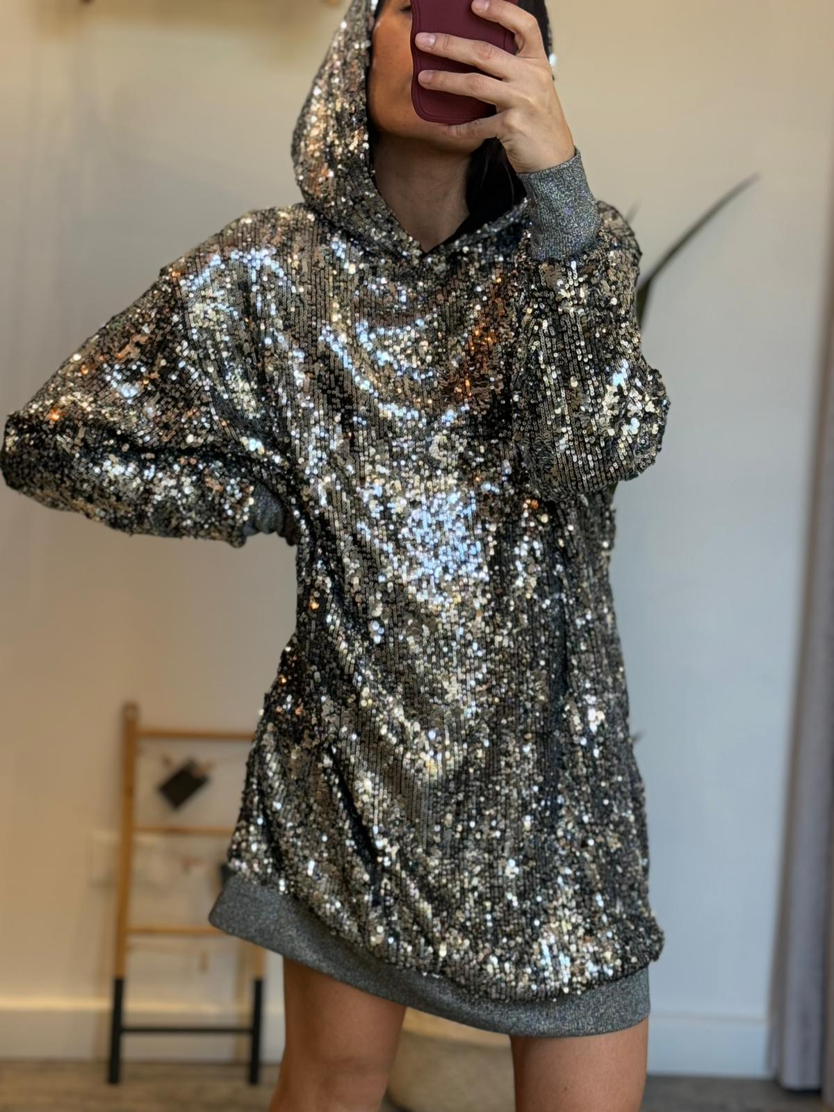 Abito felpa tempestato di paiette argento con cappuccio e polsini a coste silver lurex, fit morbido