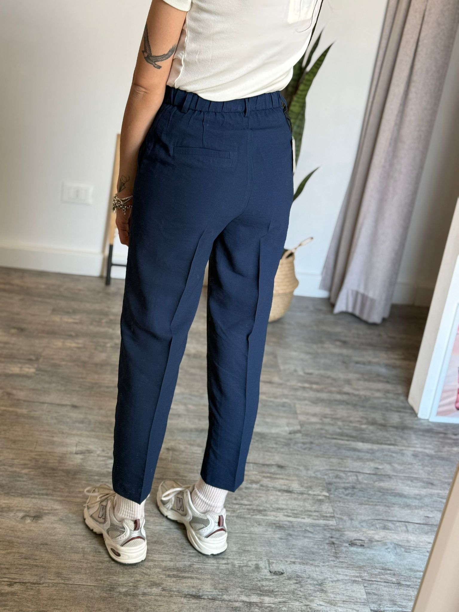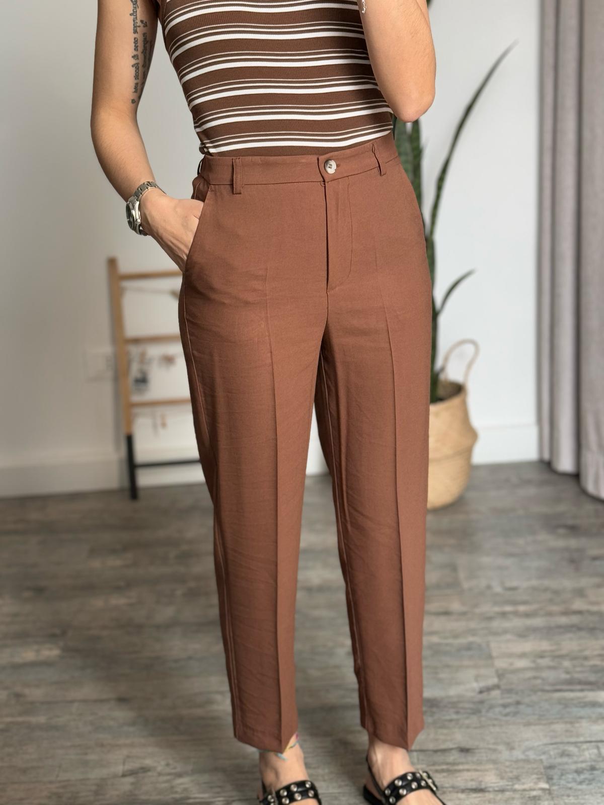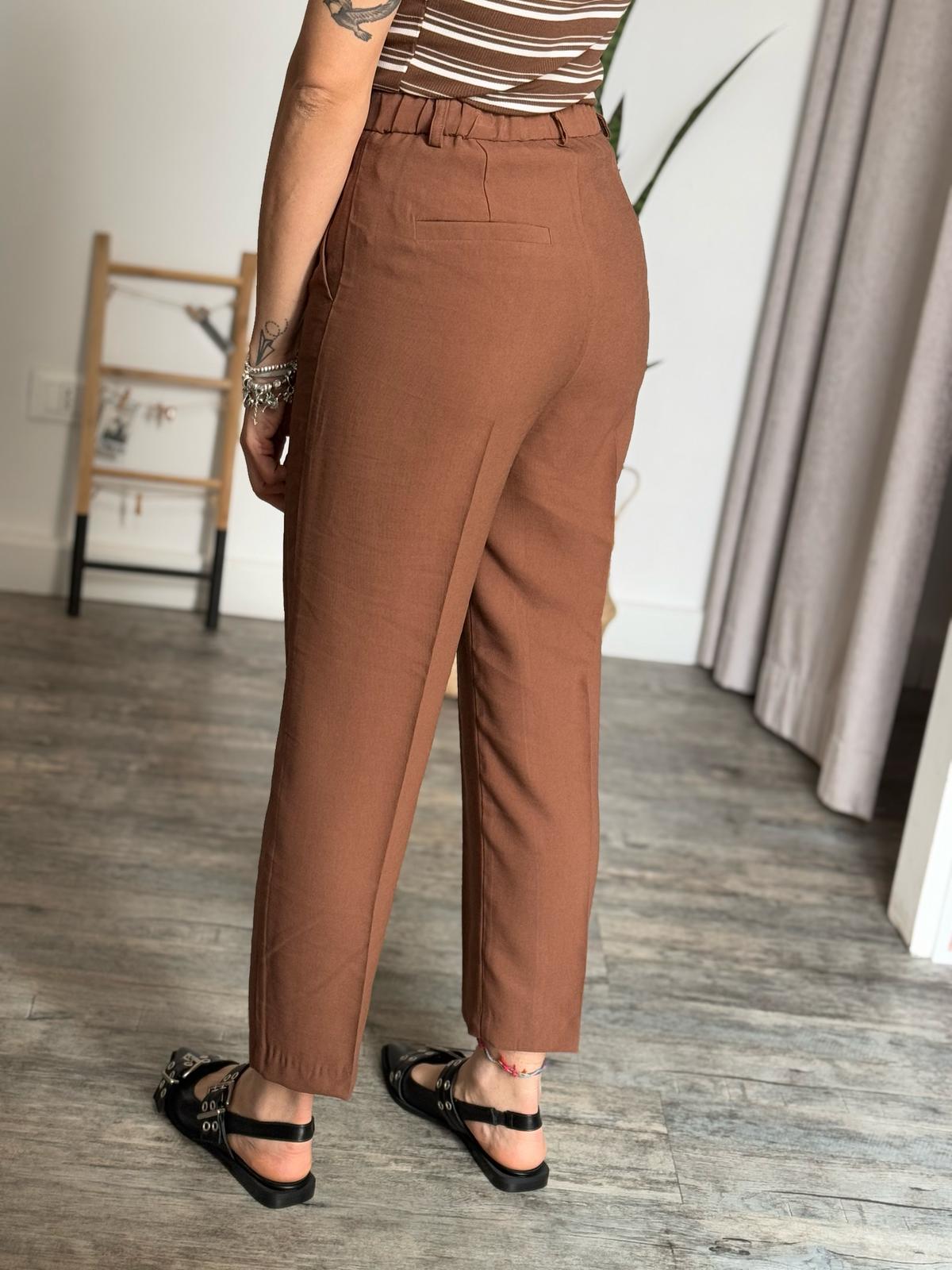 Pantalone carrot in viscosa, bestseller continuativo del brand, vita alta con fit baggy più bombato sulla coscia e poi dritto a scendere, modello corto a caviglia, banda elastica arricciata sul retro, classica chiusura su patta con bottone e zip, doppia tasca filetto laterale