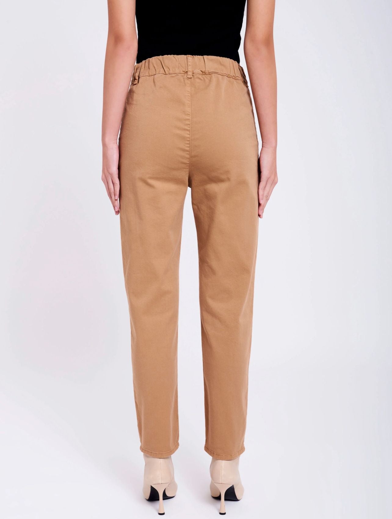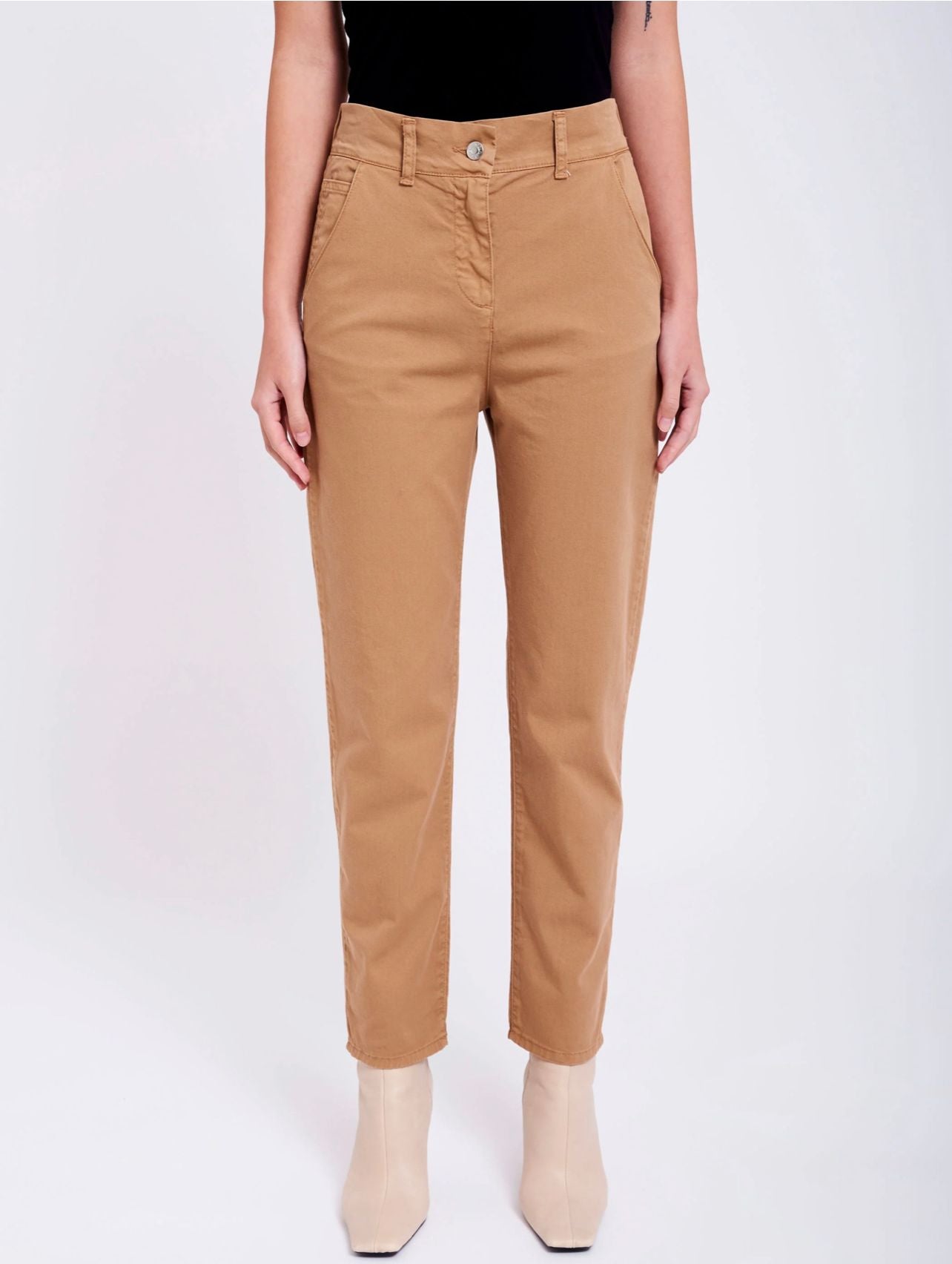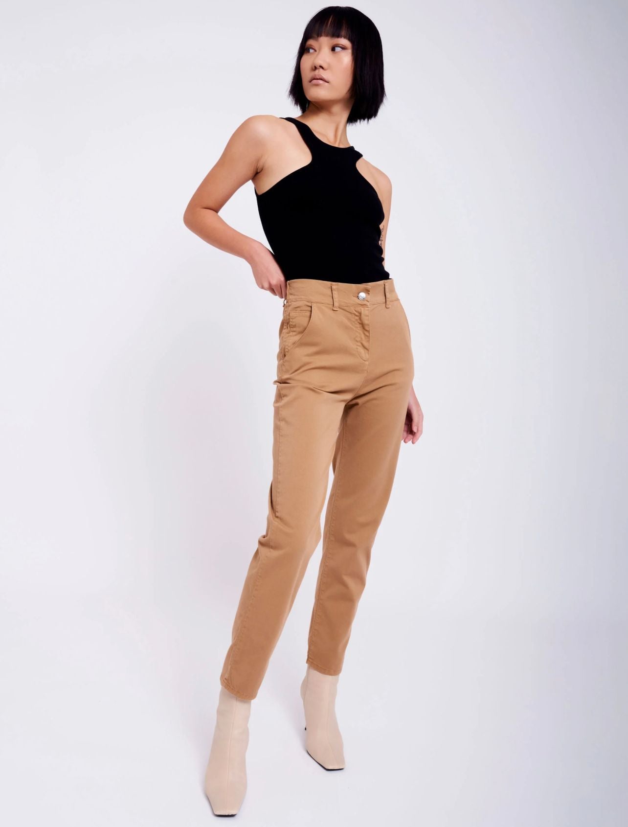 Jeans in gabardina a vita alta. Tasche frontali alla francese. Gamba stretta. Chiusura frontale con cerniera e bottone.