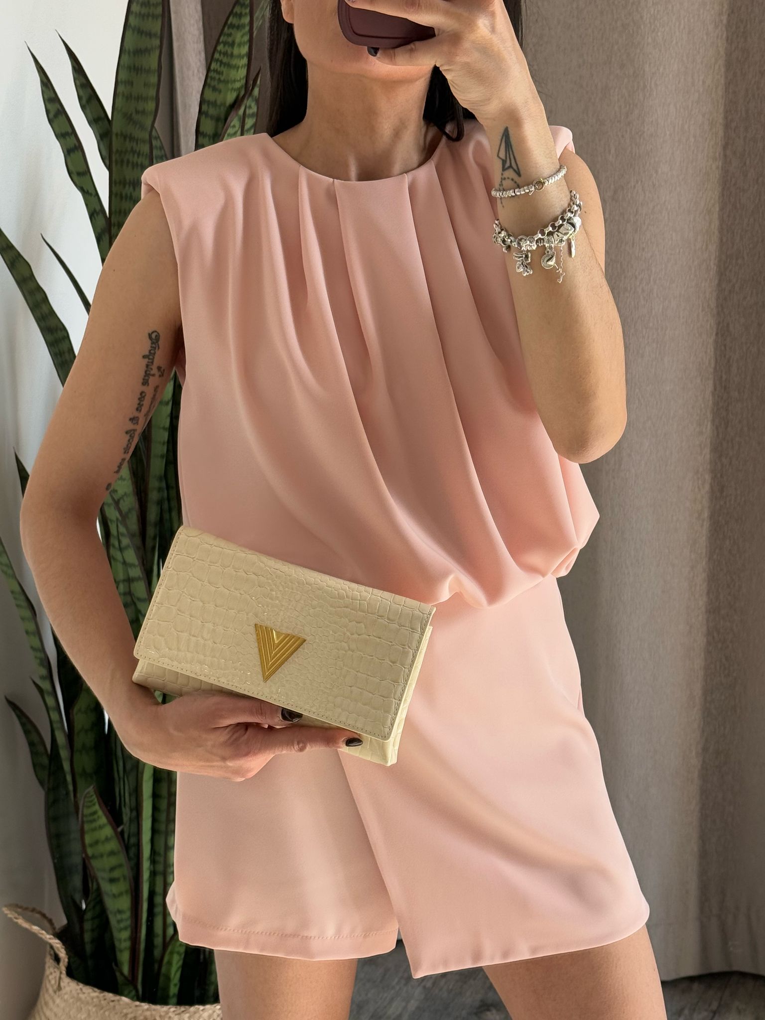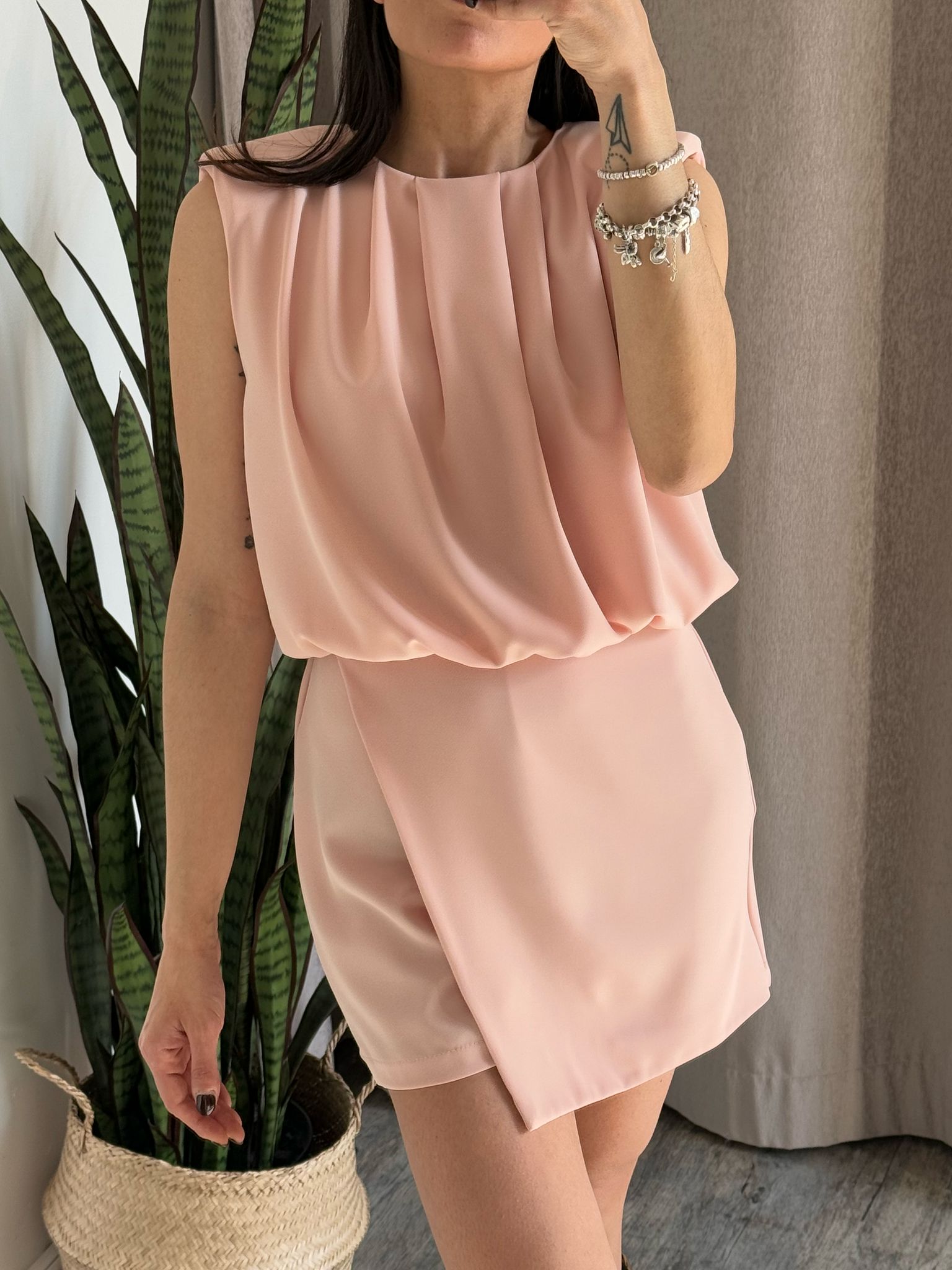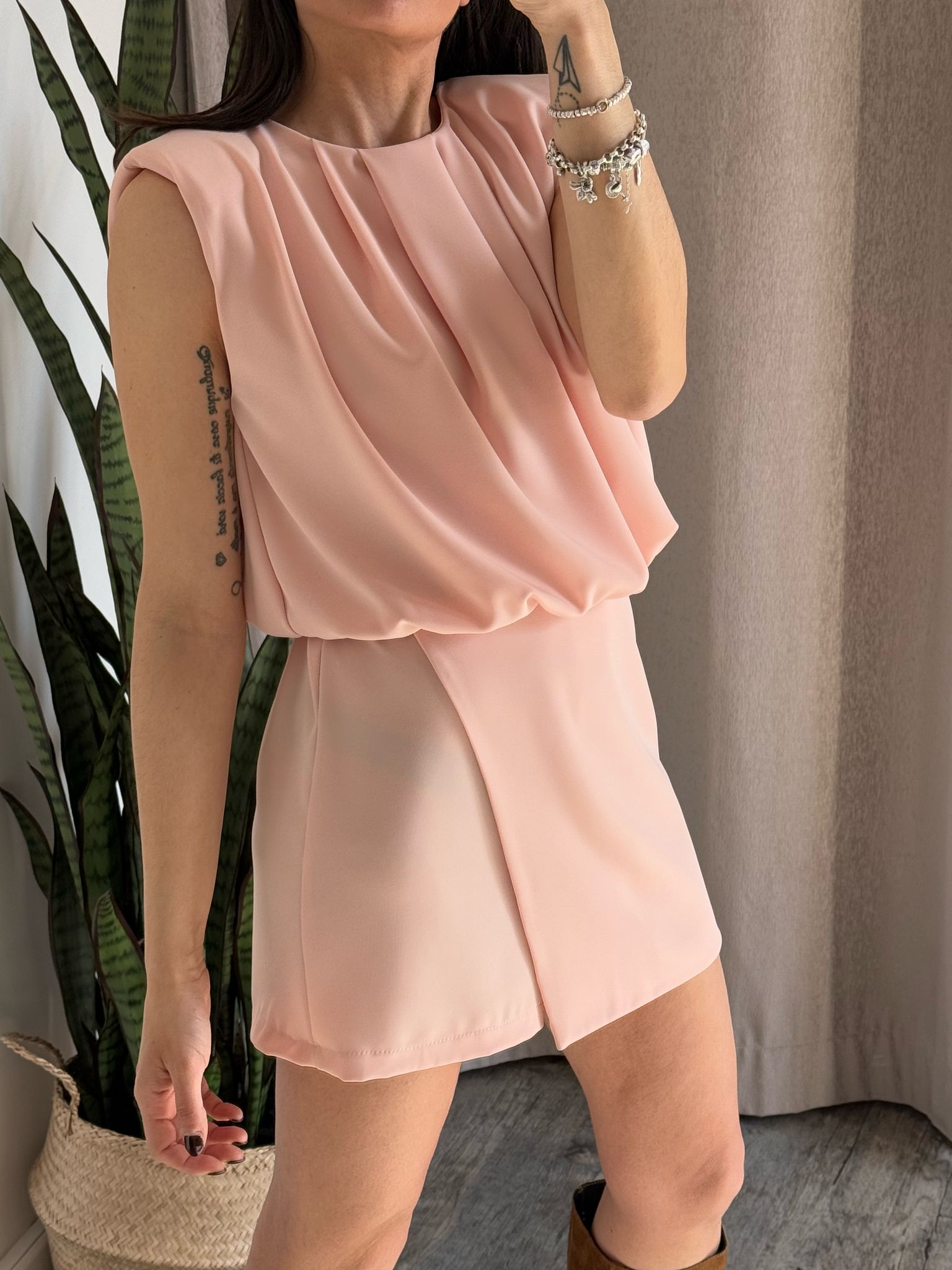 Mini abito smanicato con spalla rinforzata, effetto drappeggio sulla parte superiore, parte inferiore strutturata in effetto gonna ma con short, abbottonatura sul collo con asola