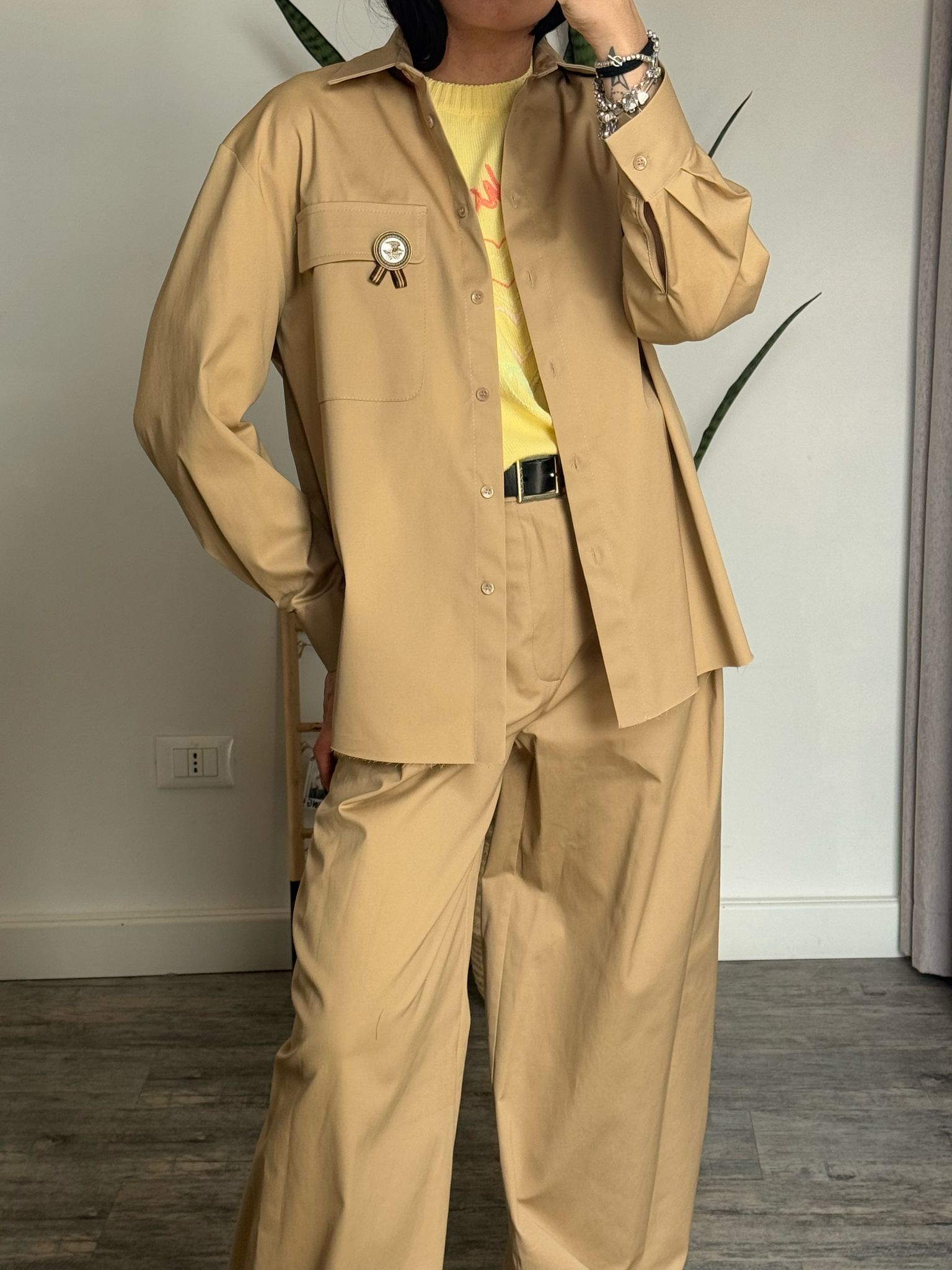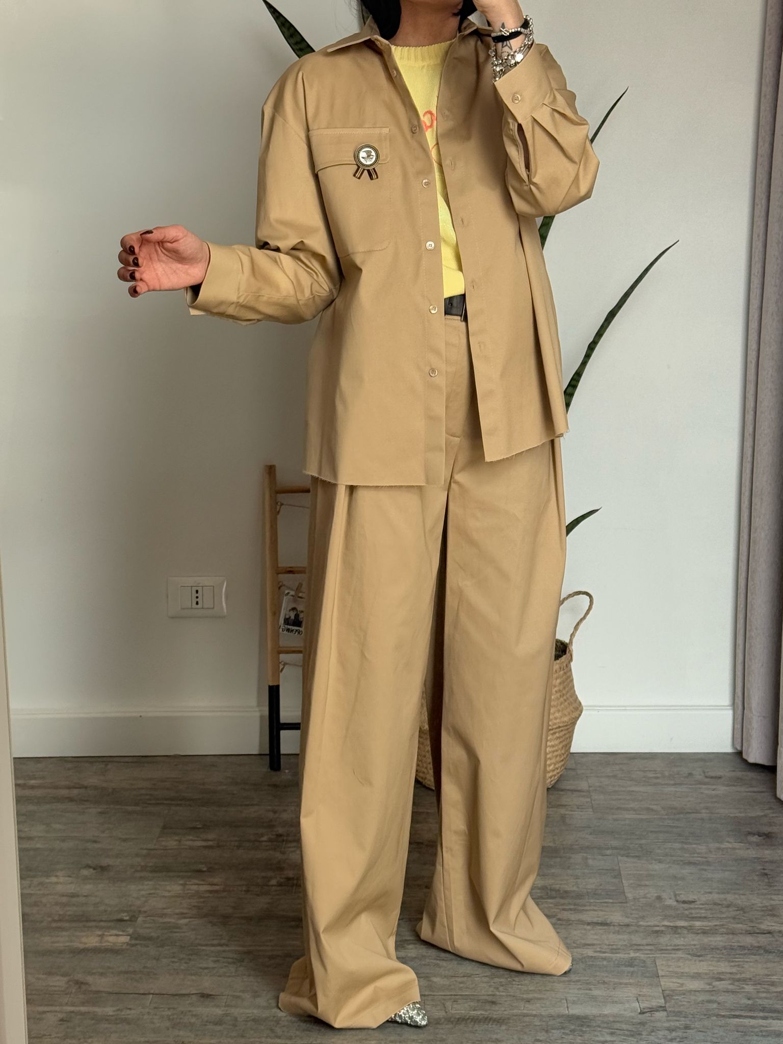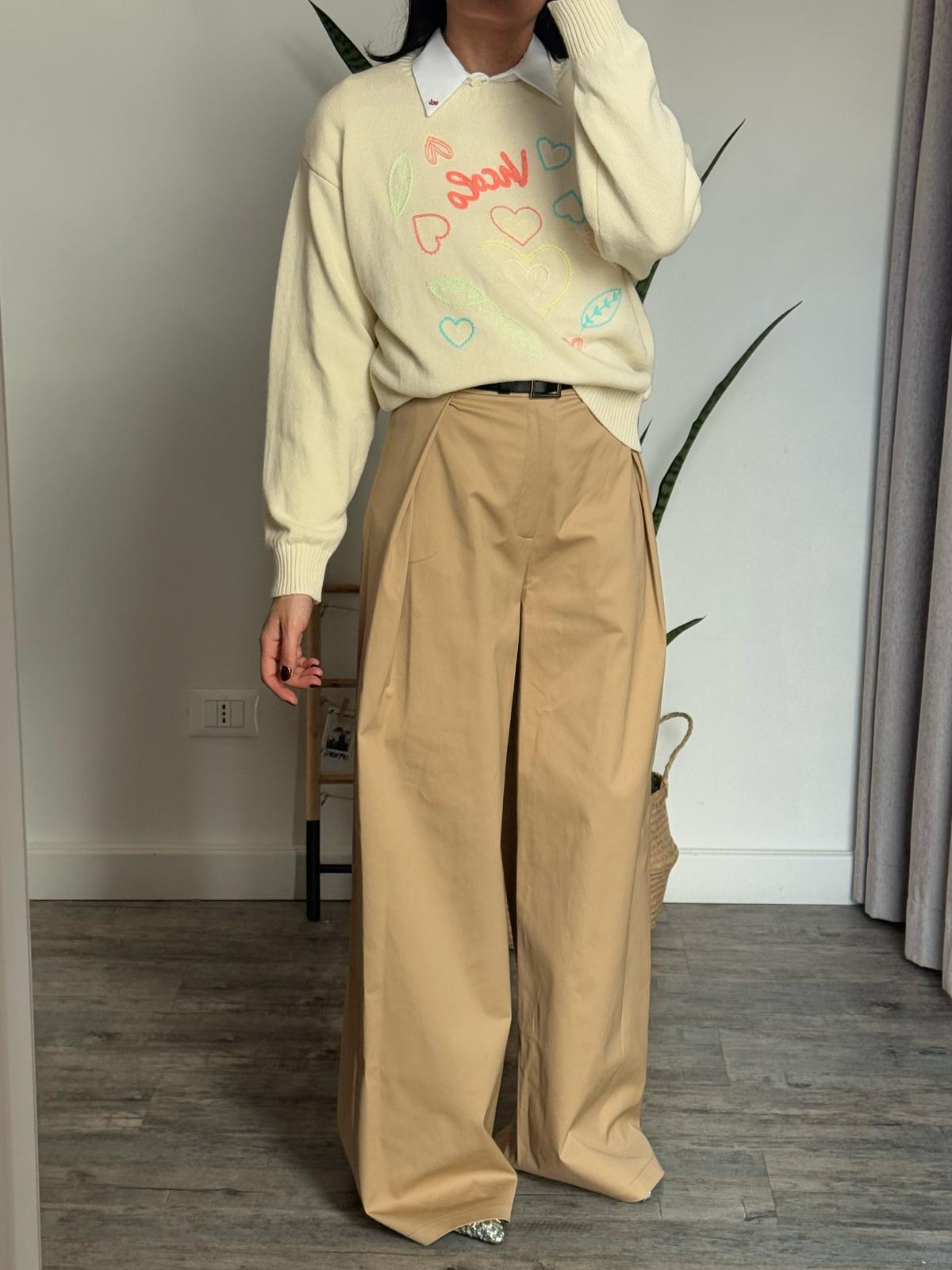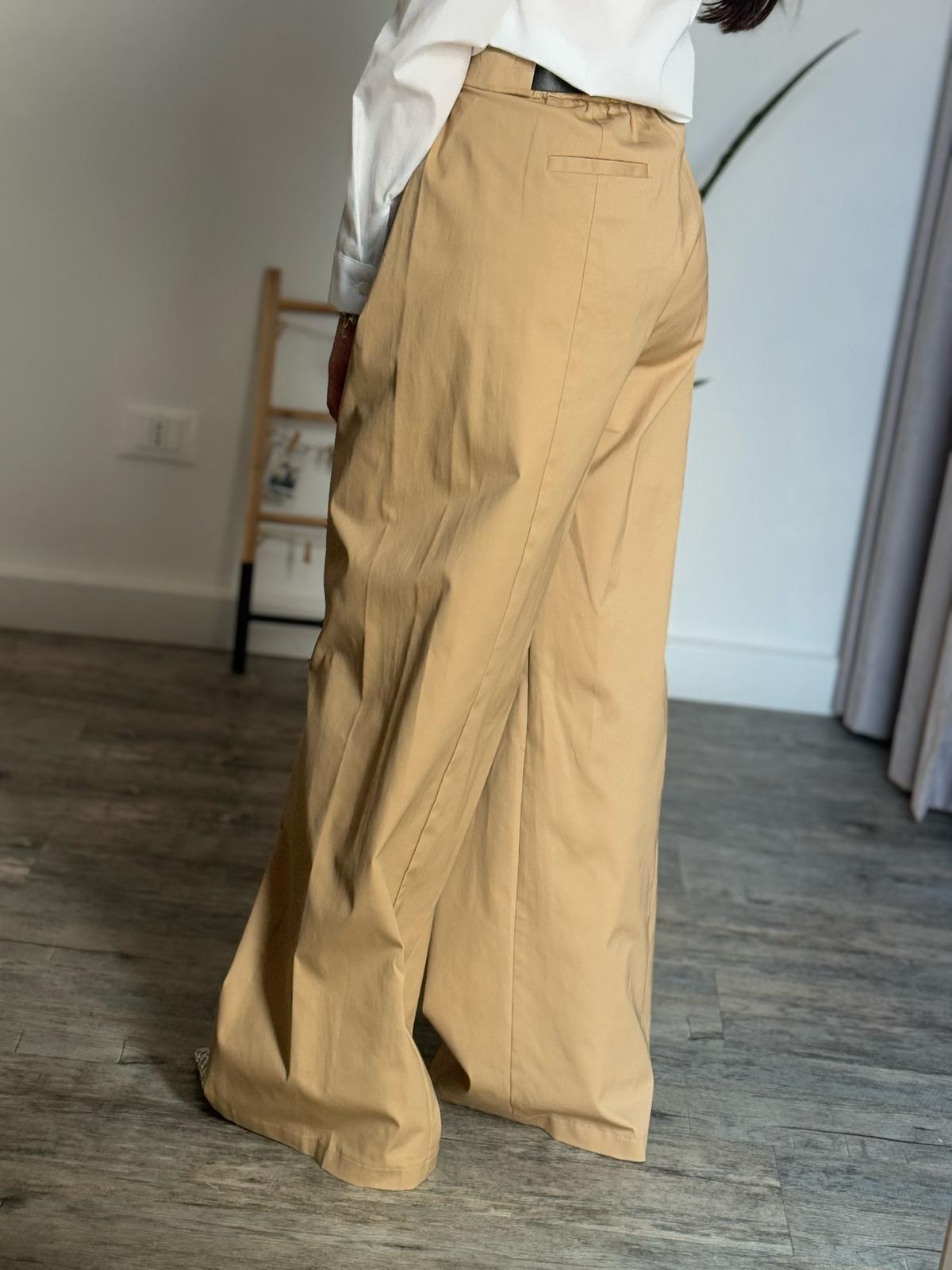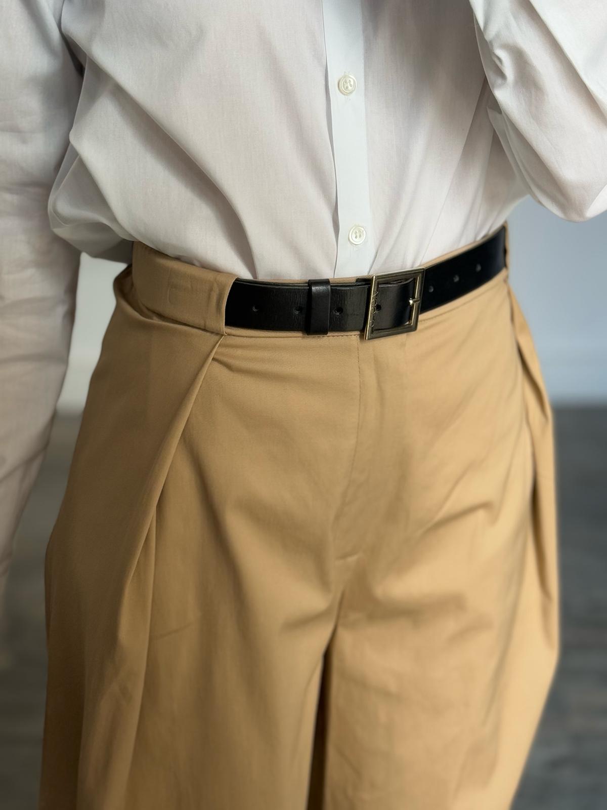 Pantalone vita alta con chiusura su patta zip e bottone, doppia pinces laterale, cintura inclusa con passanti camuffati con il tessuto del pantalone, doppia tasca filetto