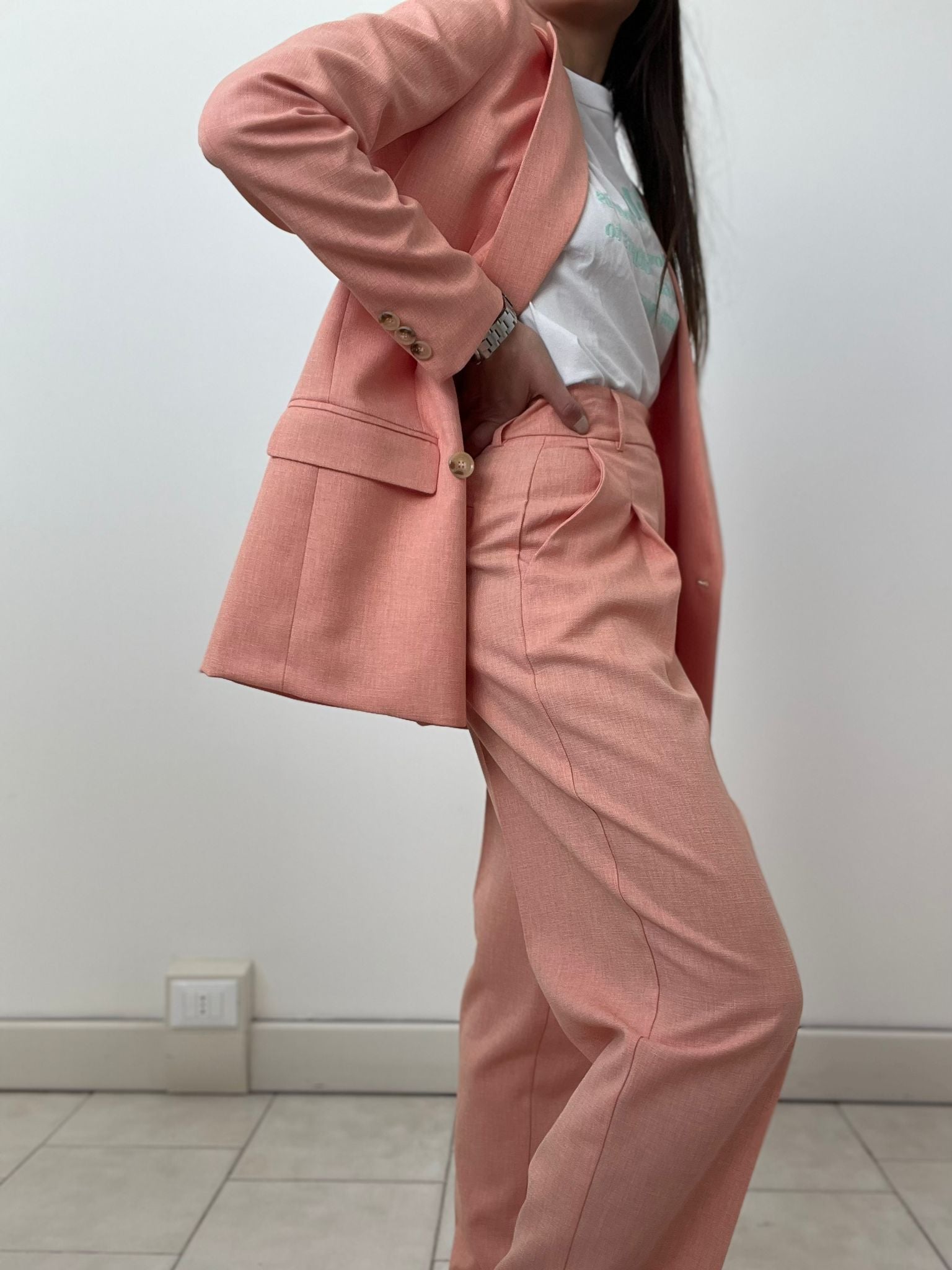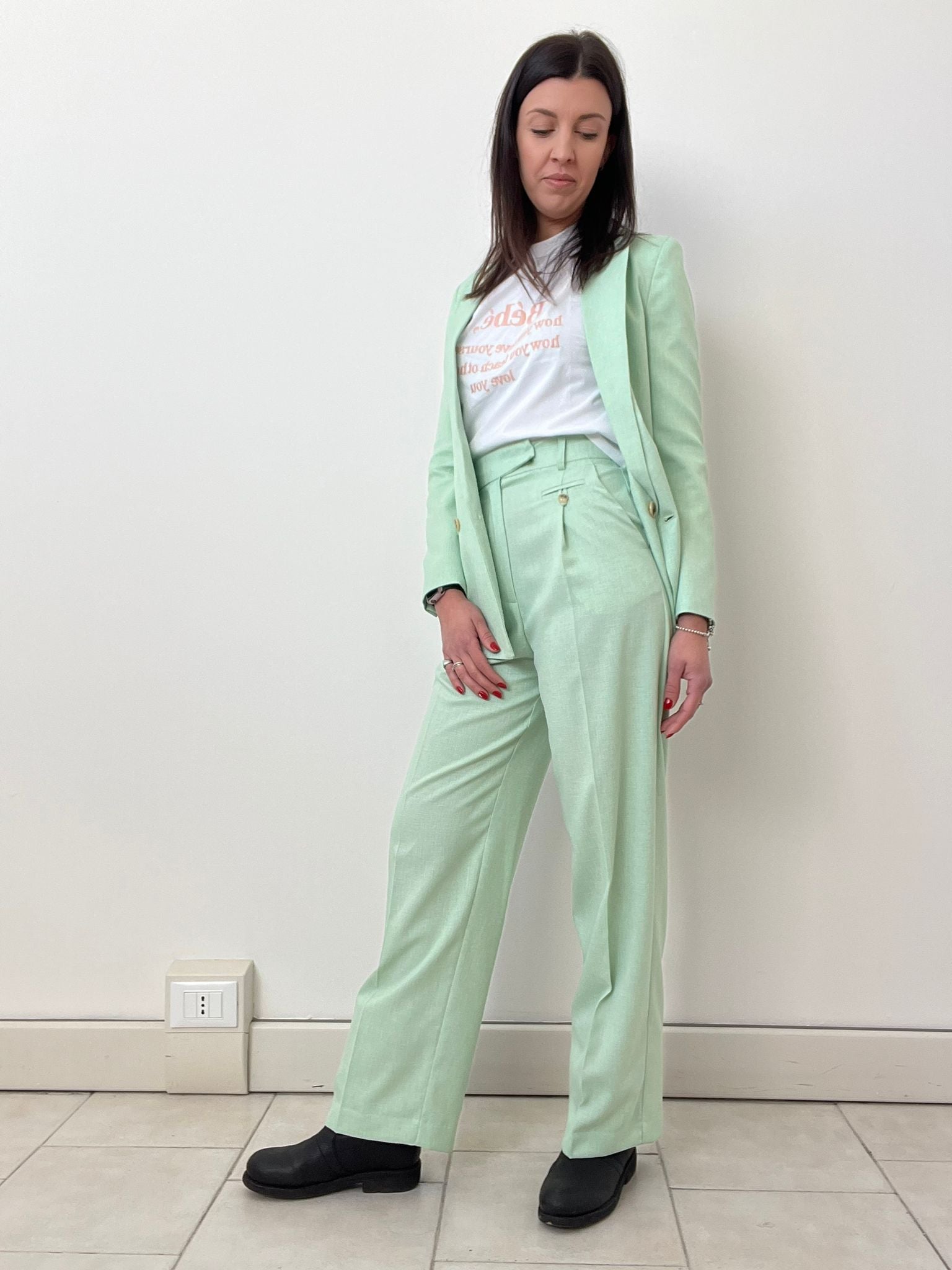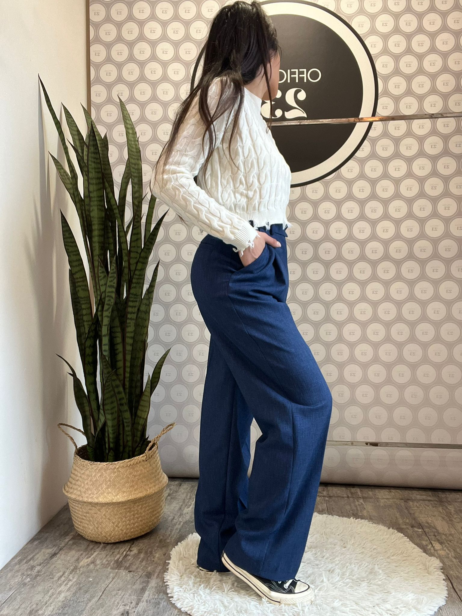 Pantalone palazzo a vita alta. Tasche laterali e finta tasca a filetto sulla parte posteriore. Dettaglio finta tasca con bottoncino. Gamba larga. Chiusura frontale nascosta con zip, bottone e gancetto.