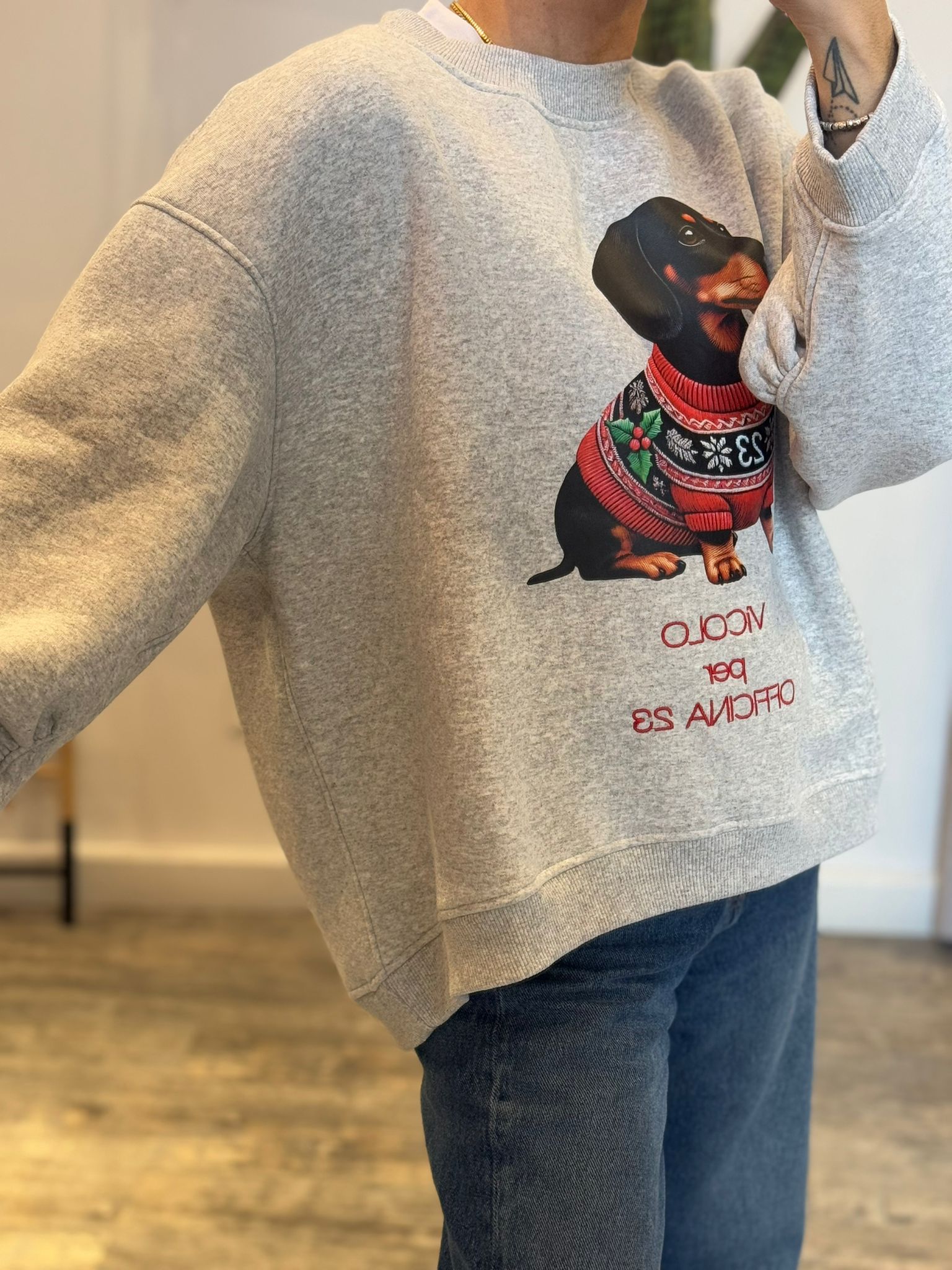 Felpa felpata girocollo con taglio asimmetrico e arriccio su manica, fit oversize, stampa bassotto e ricamo collab Vicolo x Officina 23