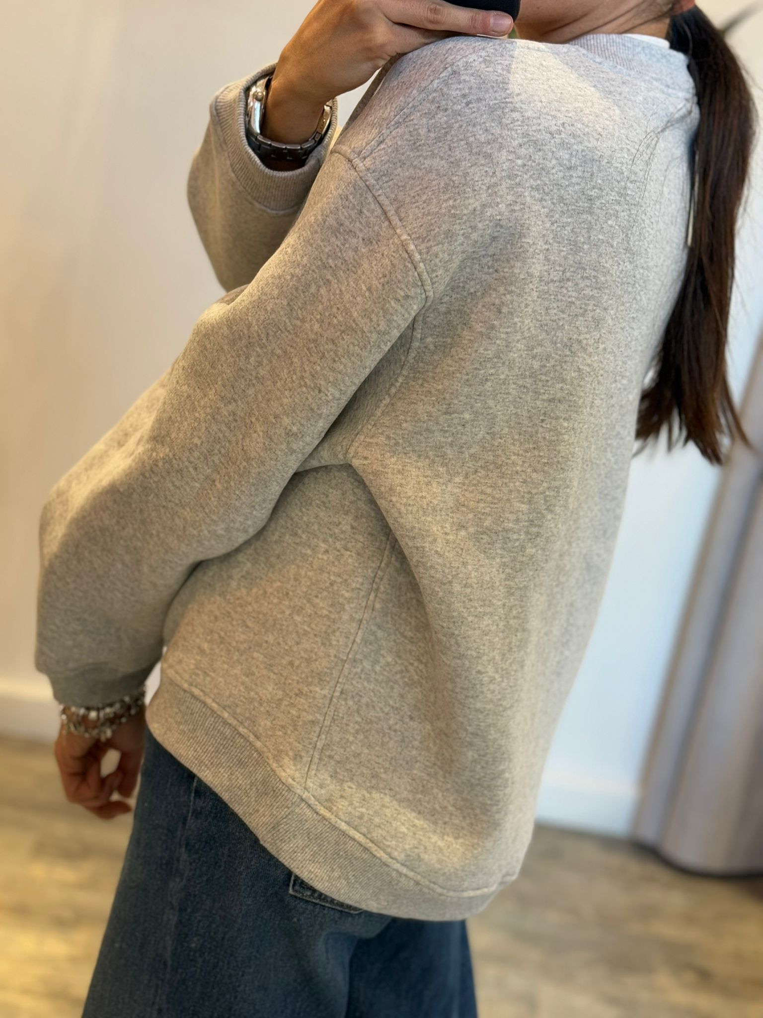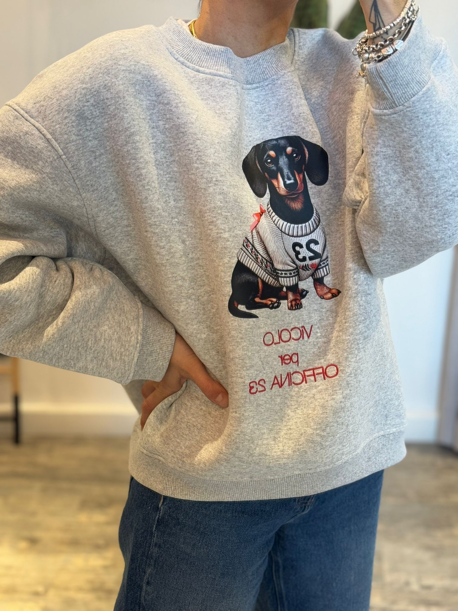 Felpa felpata girocollo con taglio asimmetrico e arriccio su manica, fit oversize, stampa bassotto e ricamo collab Vicolo x Officina 23